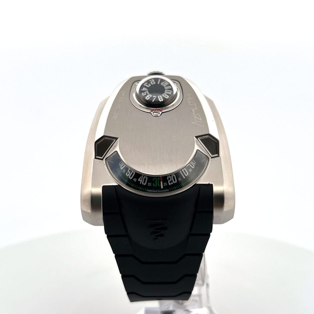 The Azimuth Land Cruiser is a visionary timepiece that fuses imagination and science fiction into the realm of horology. Inspired by the aesthetics of supersonic aircraft and military tanks, this rugged watch features a scaled-down case with chiseled sides and a top-mounted crown. Time is displayed through a domed wandering hour and slanted retrograde minute aperture. Limited to 100 pieces, it houses a highly modified Swiss automatic movement by Selita, offering regulator hours, retrograde minutes, and a 40-hour power reserve. Water-resistant to 30 meters, it comes with a rubber strap and is presented in a special military ammo box, offering a sophisticated and unique addition to any collection