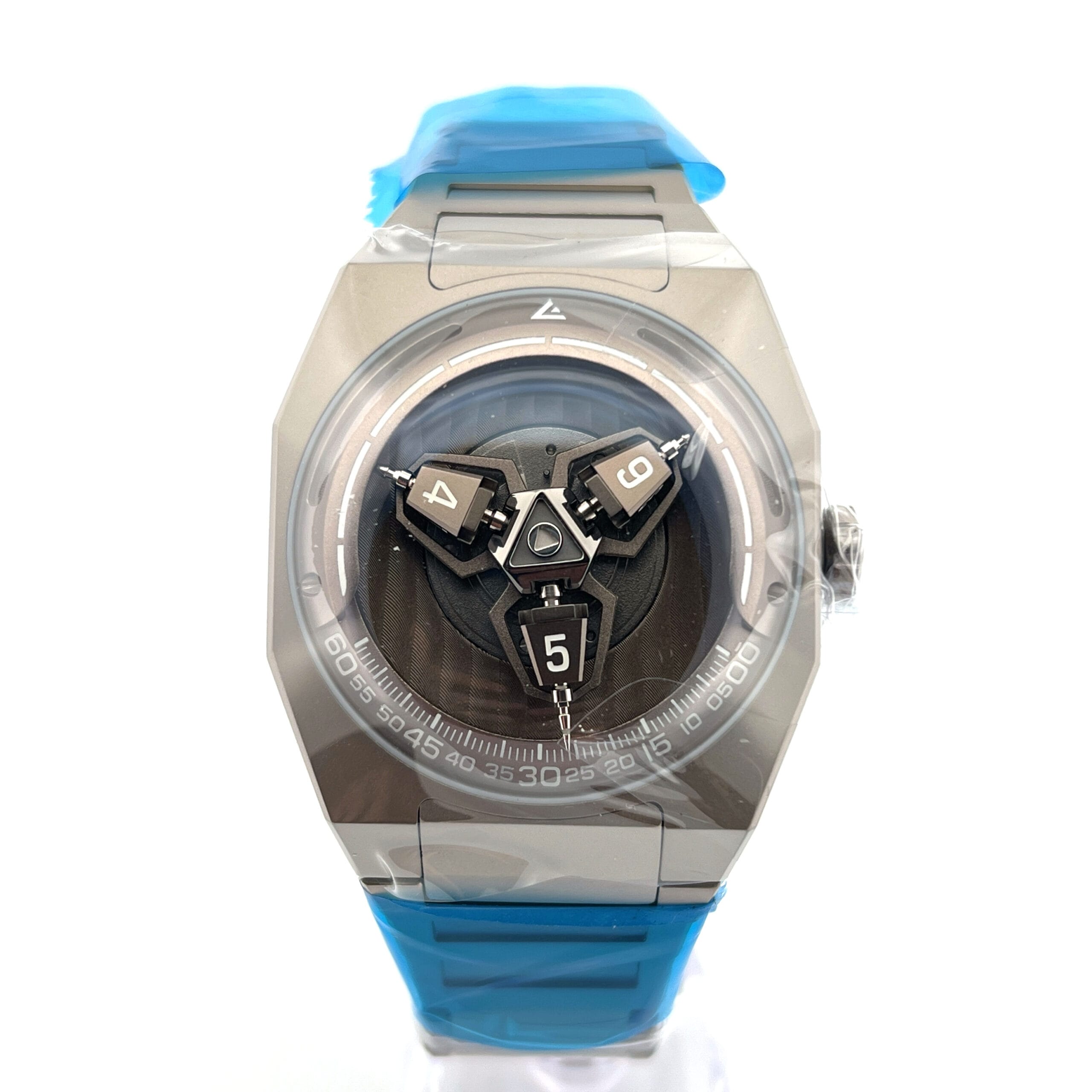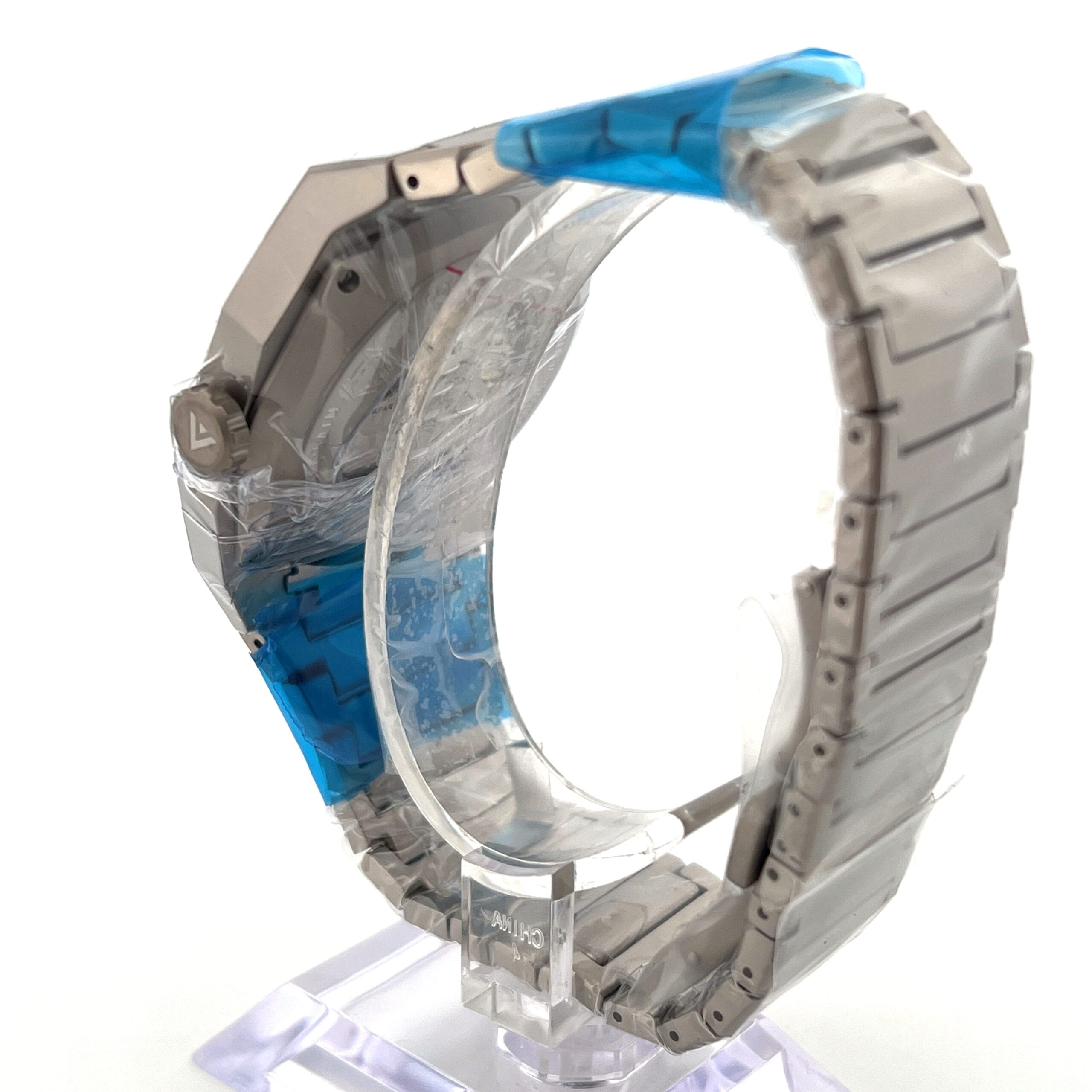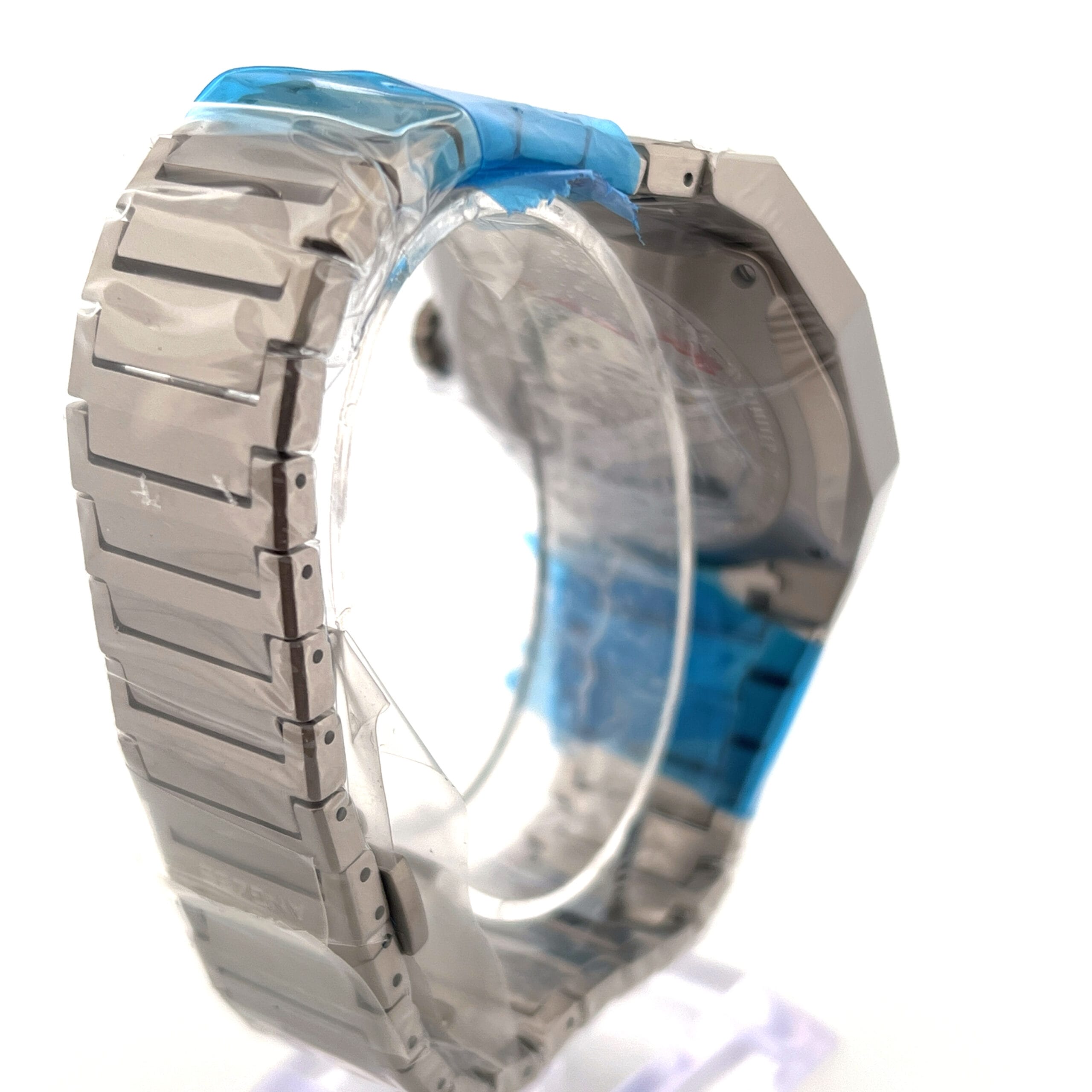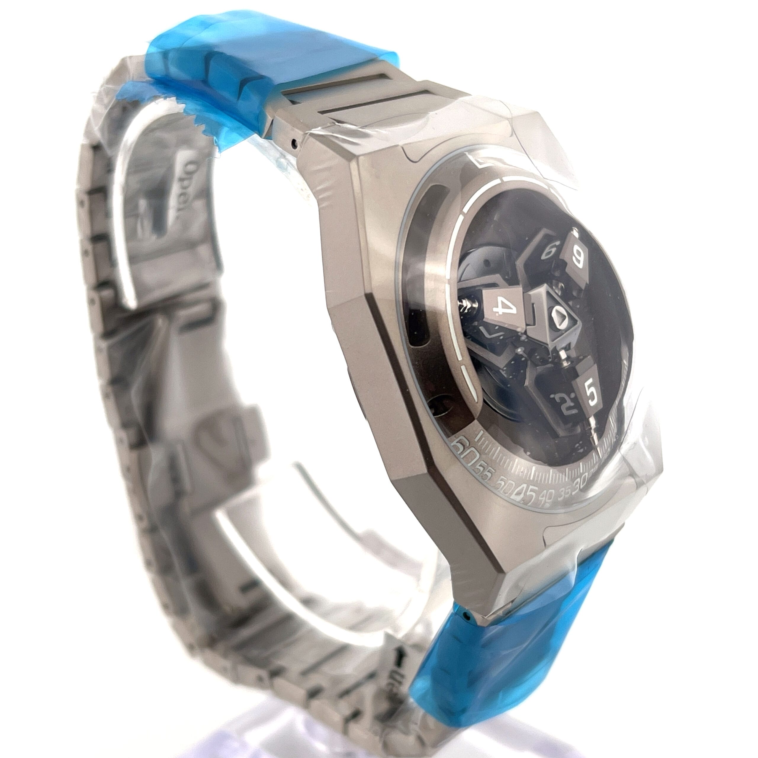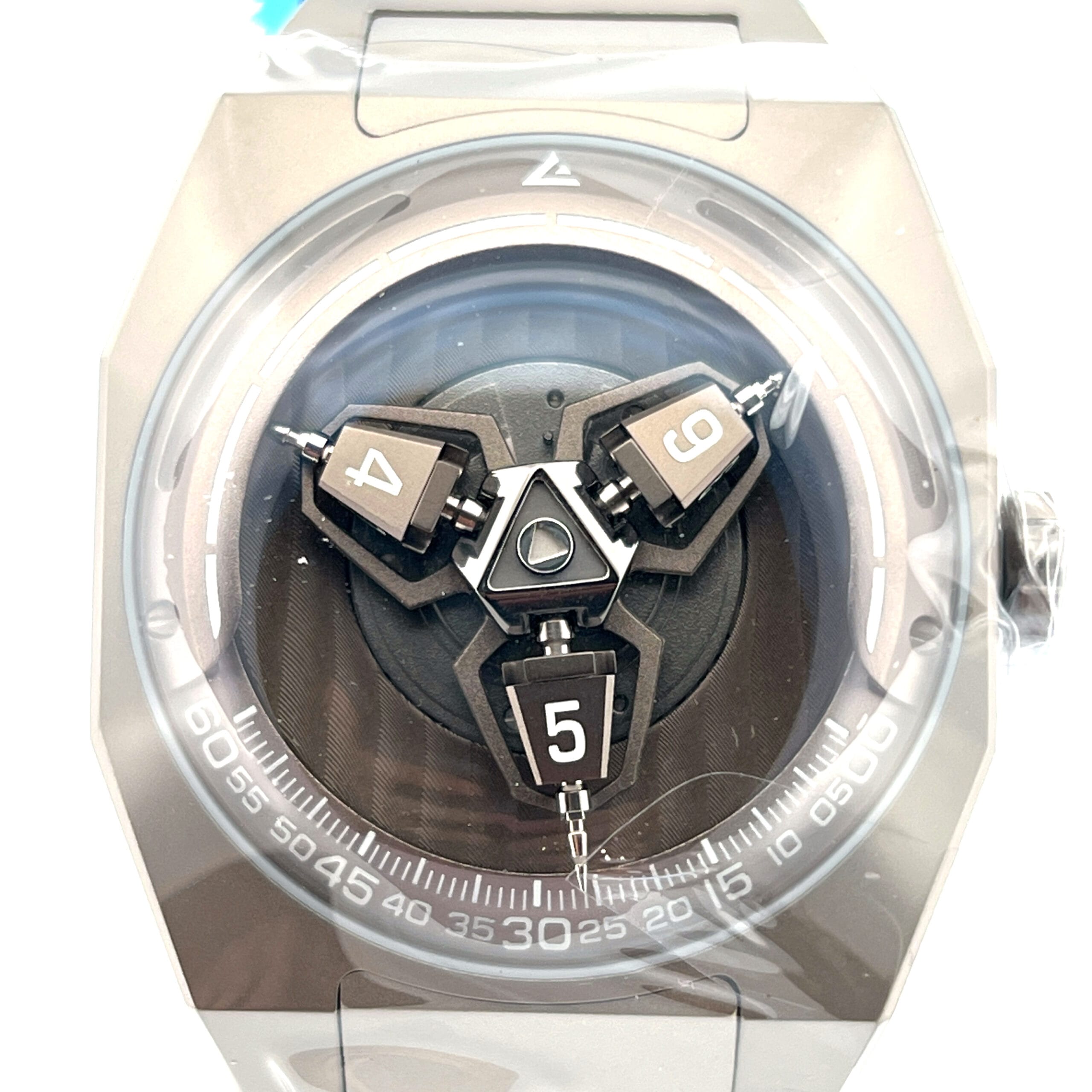 The Angles Cerberus TitanWhite is a bold reinterpretation of the wandering hour complication—futuristic, lightweight, and unapologetically distinctive. Crafted from Grade 2 titanium, its 41mm case and bracelet offer a sleek yet durable presence, enhanced by a double-domed sapphire crystal that ensures clarity from every angle.