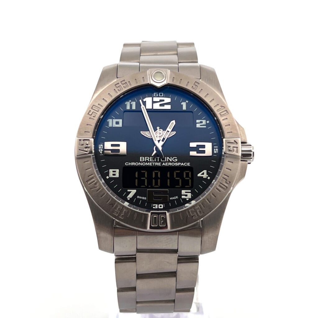 The Breitling Aerospace Evo (Ref. E7936310) is a modern pilot’s instrument—lightweight, precise, and packed with functionality. Crafted from titanium, its 43mm case keeps it both rugged and remarkably comfortable on the wrist. The dial is a blend of analog and digital displays, offering at-a-glance legibility while housing a suite of features, including a chronograph, countdown timer, second time zone, alarm, and perpetual calendar.