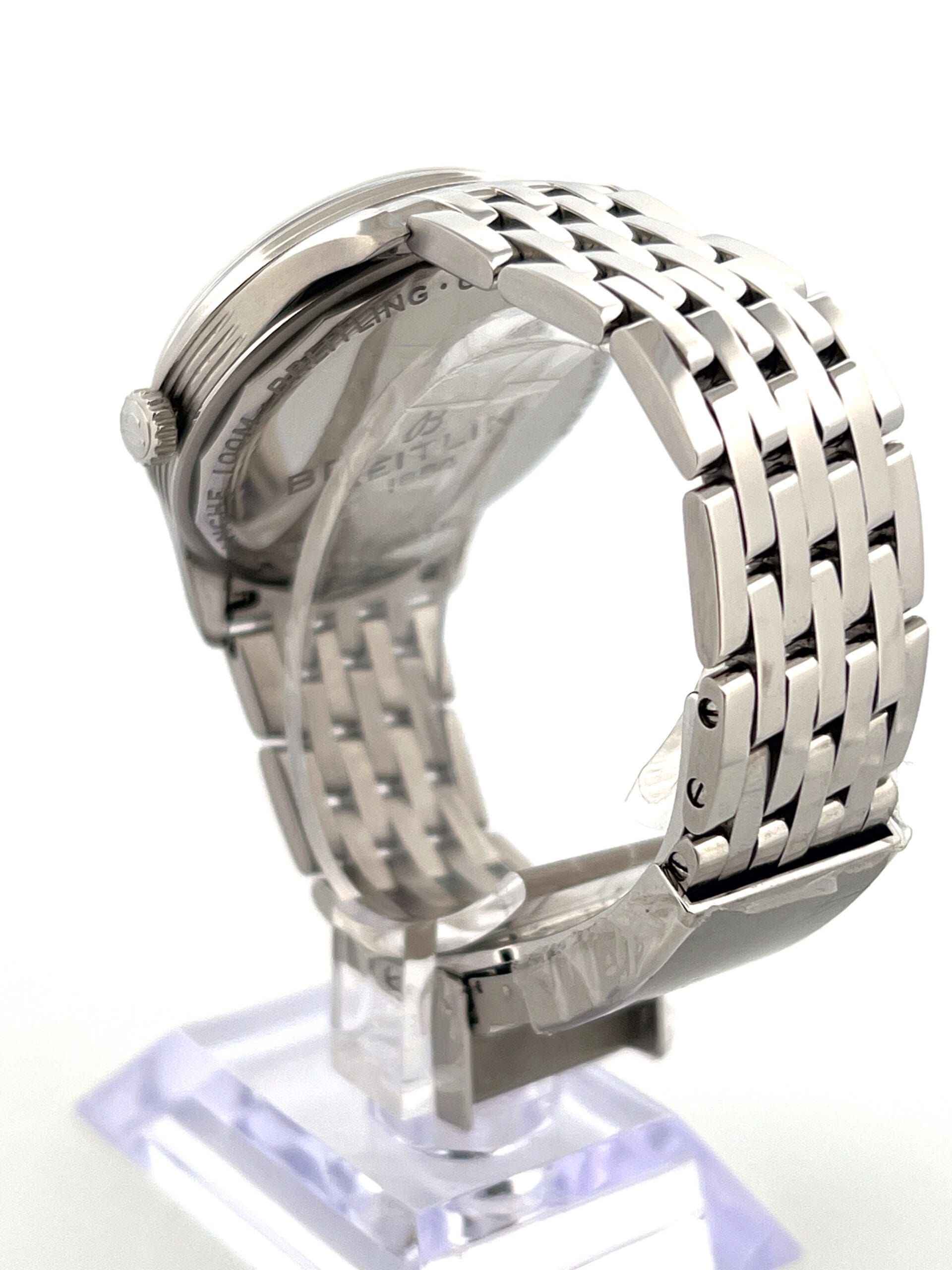The Breitling Premier Automatic Day & Date 40, Ref. A45340241B1A1. This piece is part of Breitling’s modern revival of the Premier line, originally introduced in the 1940s by Willy Breitling as a collection dedicated not to aviation or diving, but to style and elegance. Today, the Premier Day & Date 40 honors that vision with a polished 40 mm stainless steel case, finely brushed and beveled, paired with a deep black dial that offers a restrained yet confident presence on the wrist.