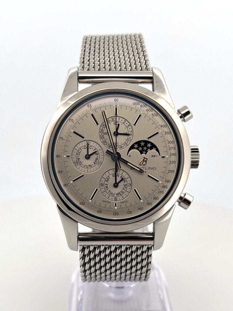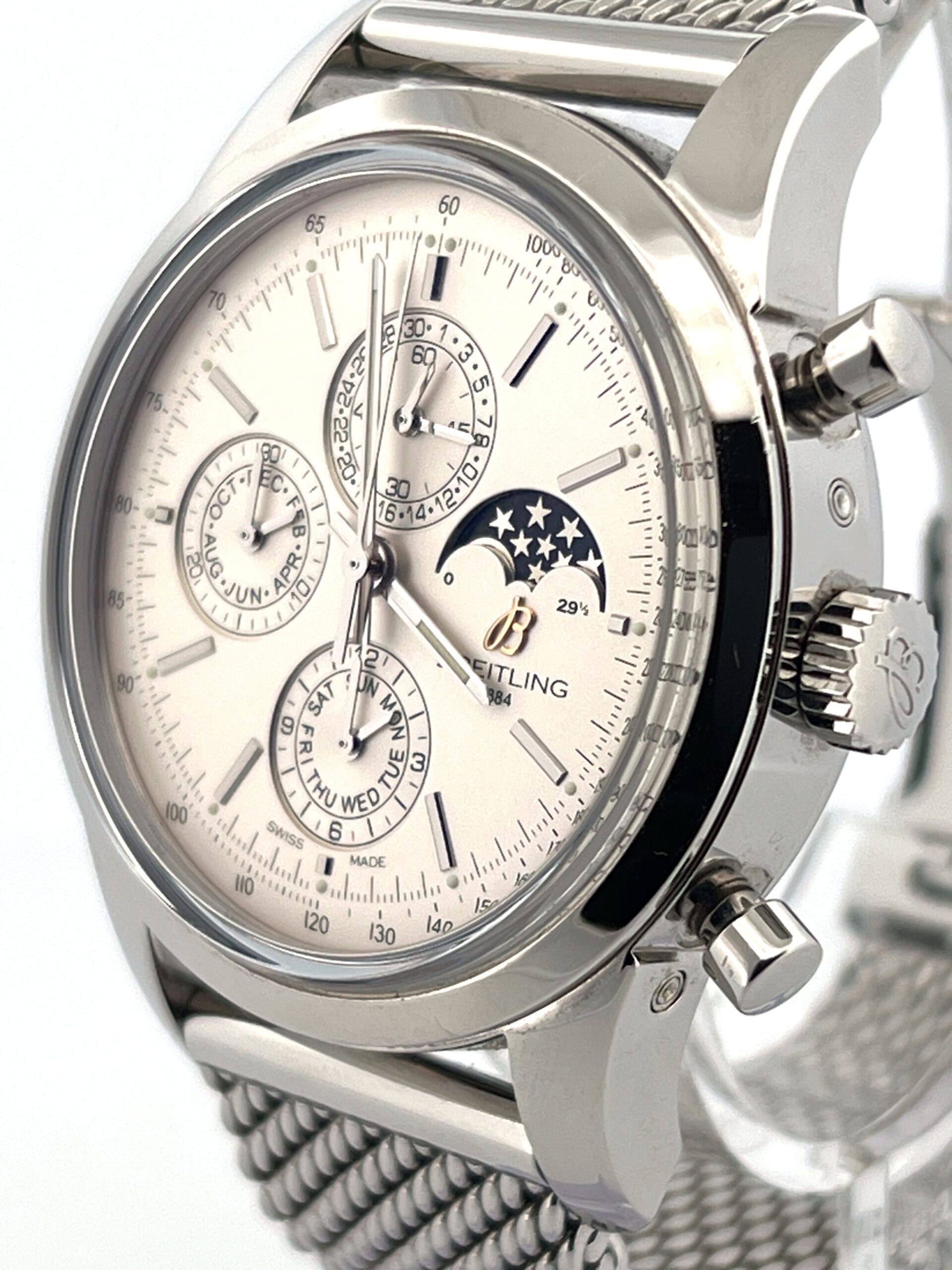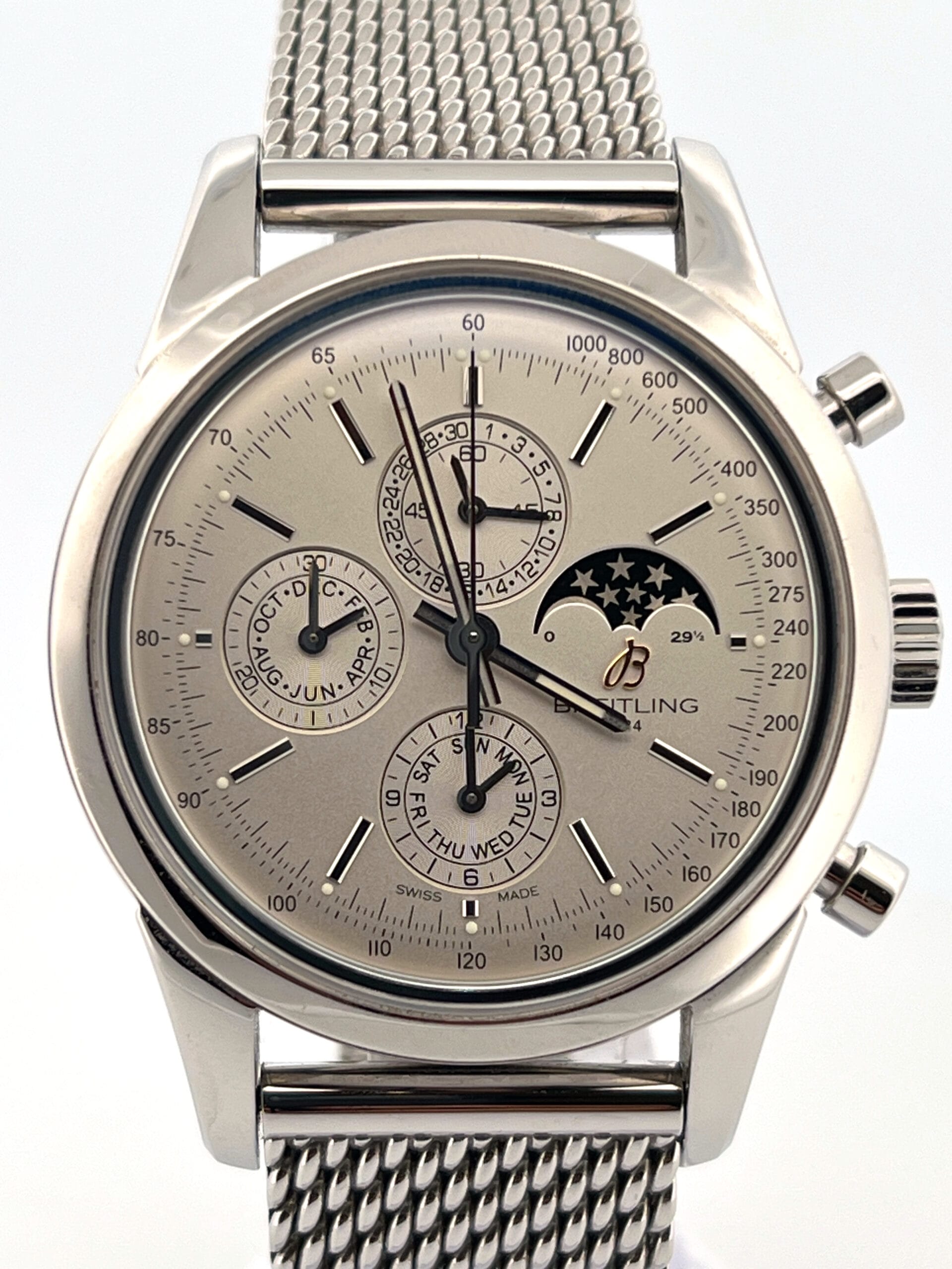The Breitling Transocean Chronograph 1461 Ref. A19310 brings together vintage-inspired elegance and technical sophistication in a substantial 43 mm stainless-steel case with a polished fixed bezel and domed sapphire crystal. Its clean silver dial is accented by applied baton indices, polished hands, three chronograph registers, and a moon-phase aperture — offering a balanced yet functional aesthetic.