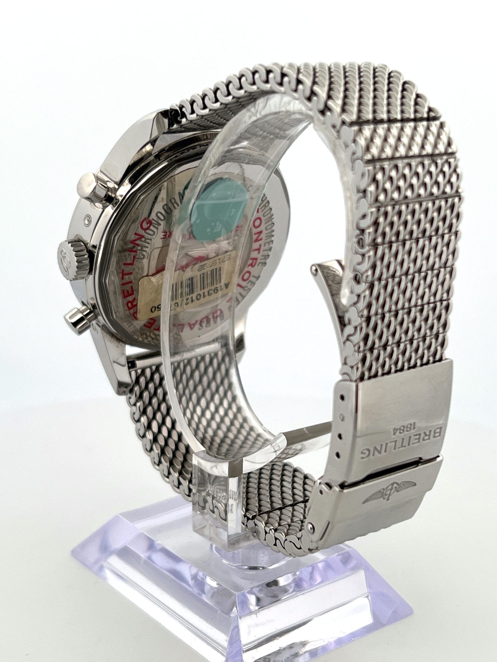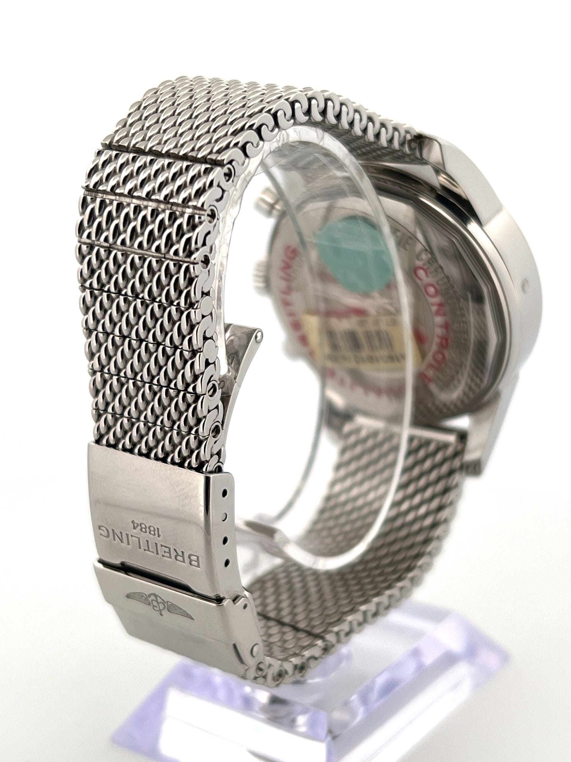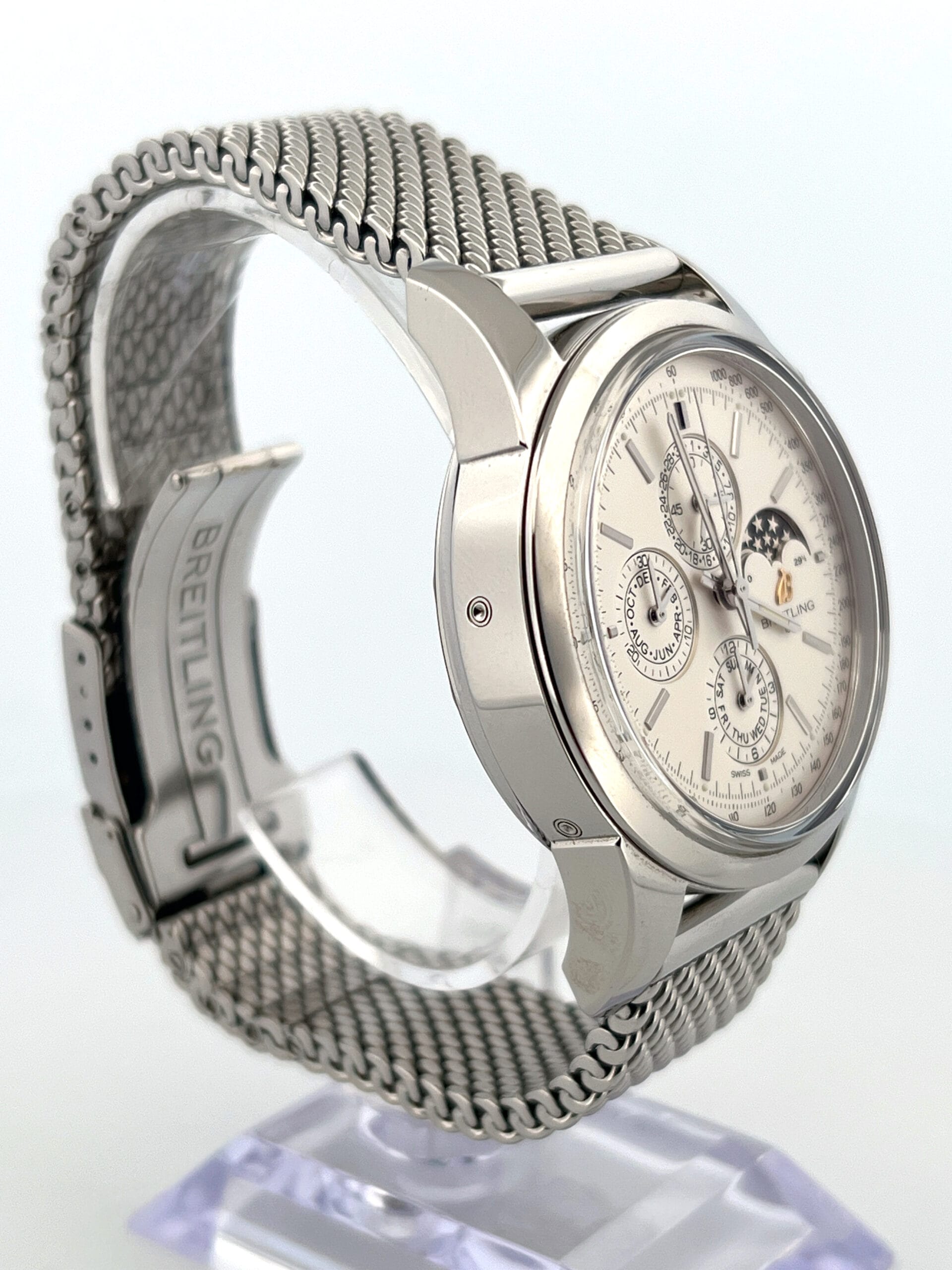 The Breitling Transocean Chronograph 1461 Ref. A19310 brings together vintage-inspired elegance and technical sophistication in a substantial 43 mm stainless-steel case with a polished fixed bezel and domed sapphire crystal. Its clean silver dial is accented by applied baton indices, polished hands, three chronograph registers, and a moon-phase aperture — offering a balanced yet functional aesthetic.
