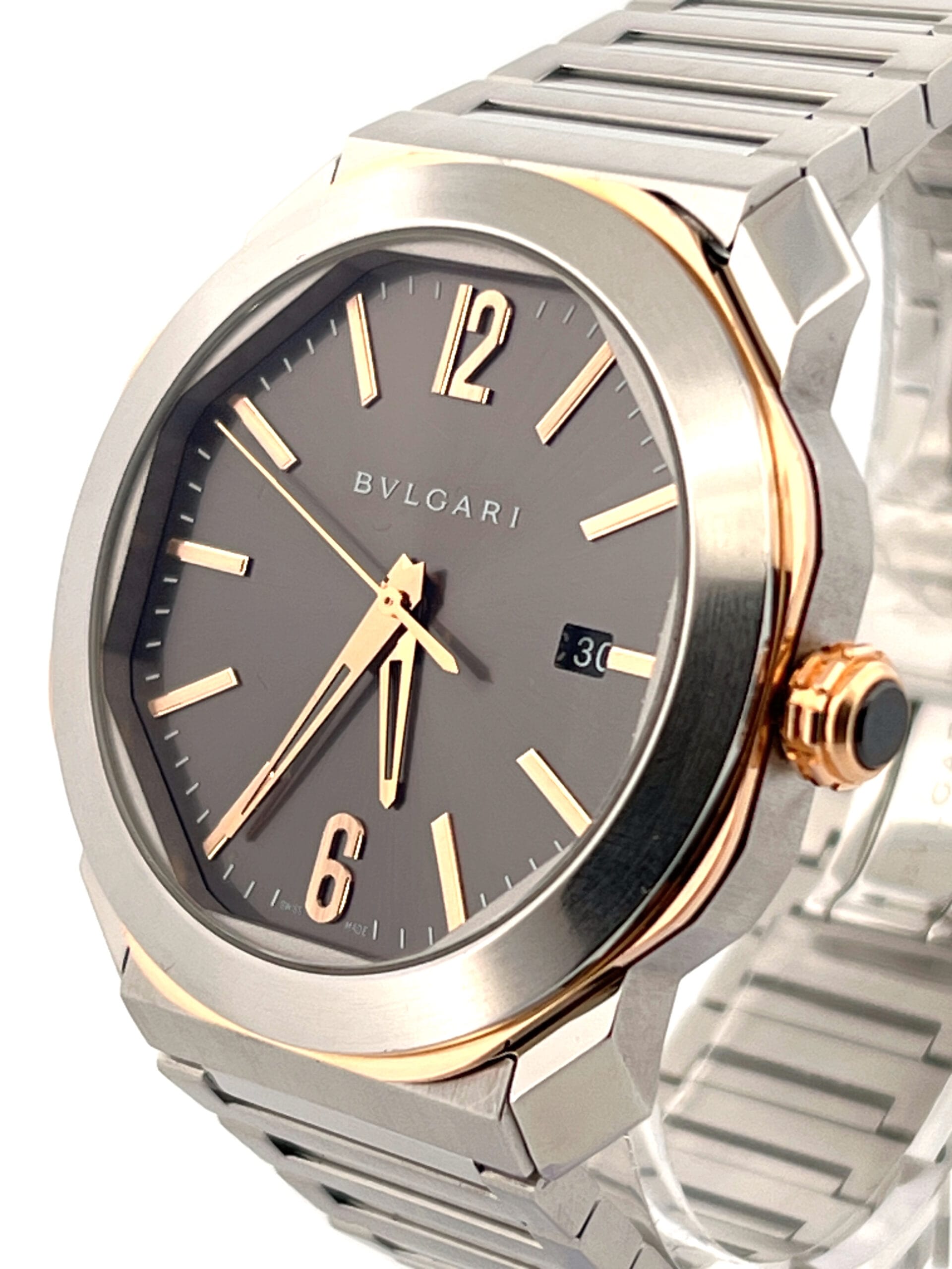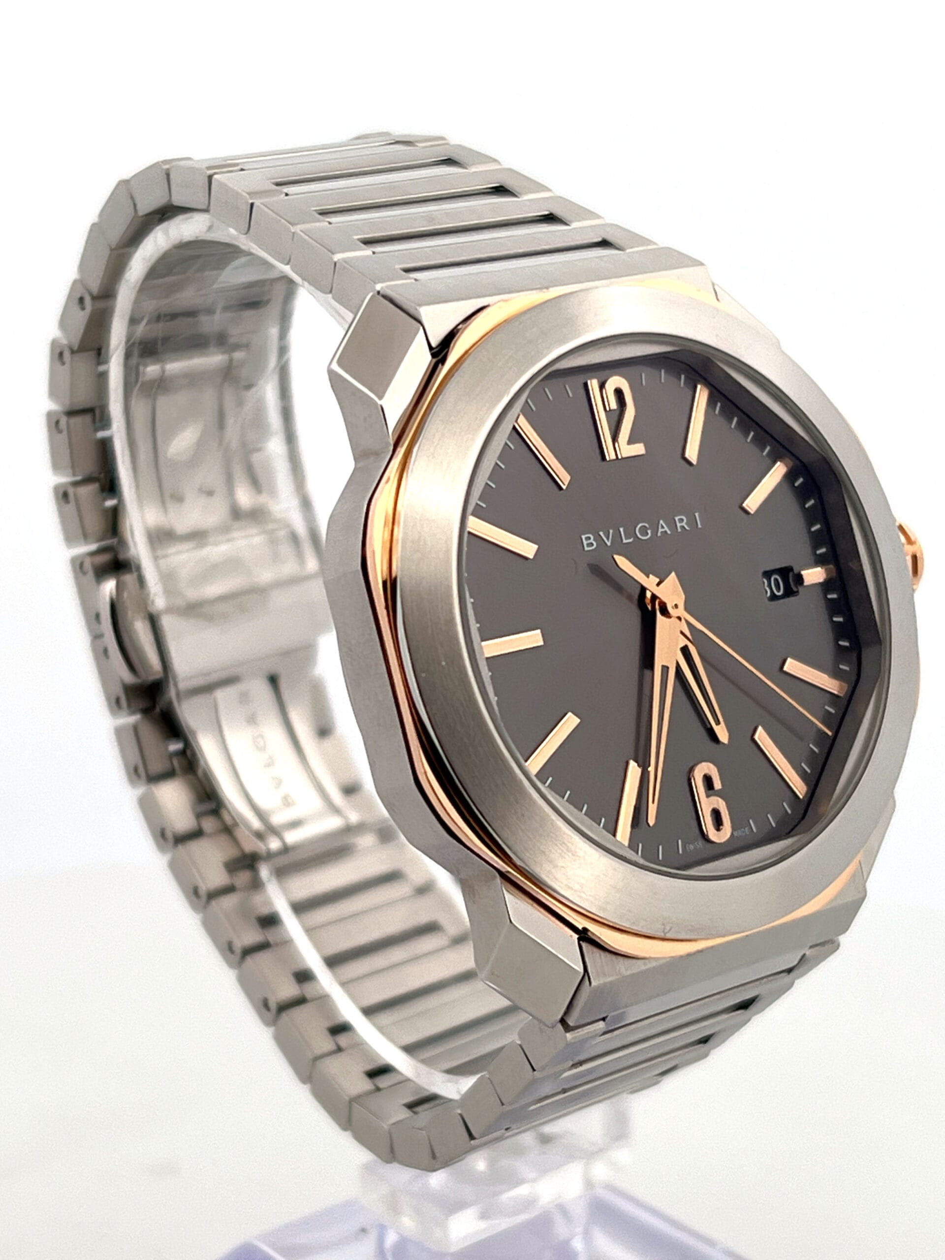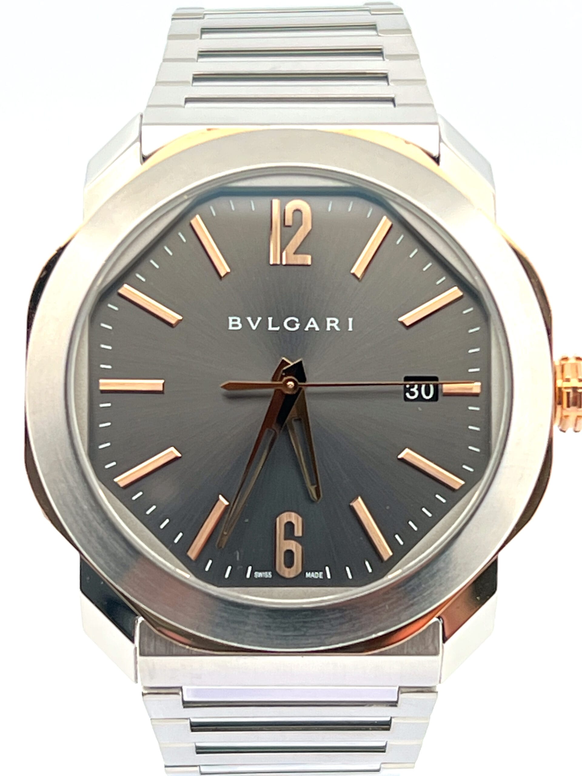 In the world of luxury horology, the Octo Roma 41 mm (Ref. 103083) from Bvlgari positions itself as an elegant union of Italian design flair and Swiss mechanical precision. At 41 mm in diameter and featuring a case crafted from stainless steel paired with an 18 kt rose-gold octagonal bezel, the watch commands presence without overwhelming the wrist. The anthracite/grey sunburst dial (sometimes annotated as “grey” in listings) offers a subdued yet refined canvas—hand-applied indices and rose gold-tone hands lend the piece quiet sophistication.