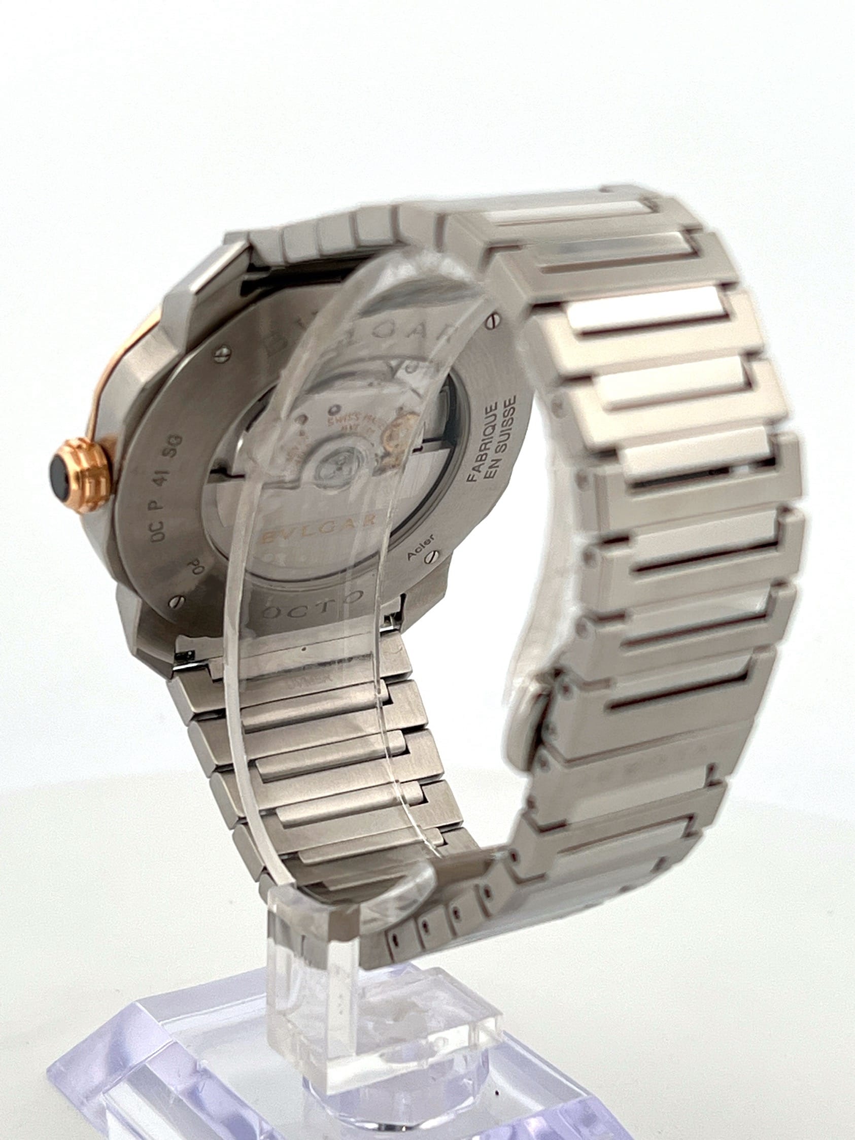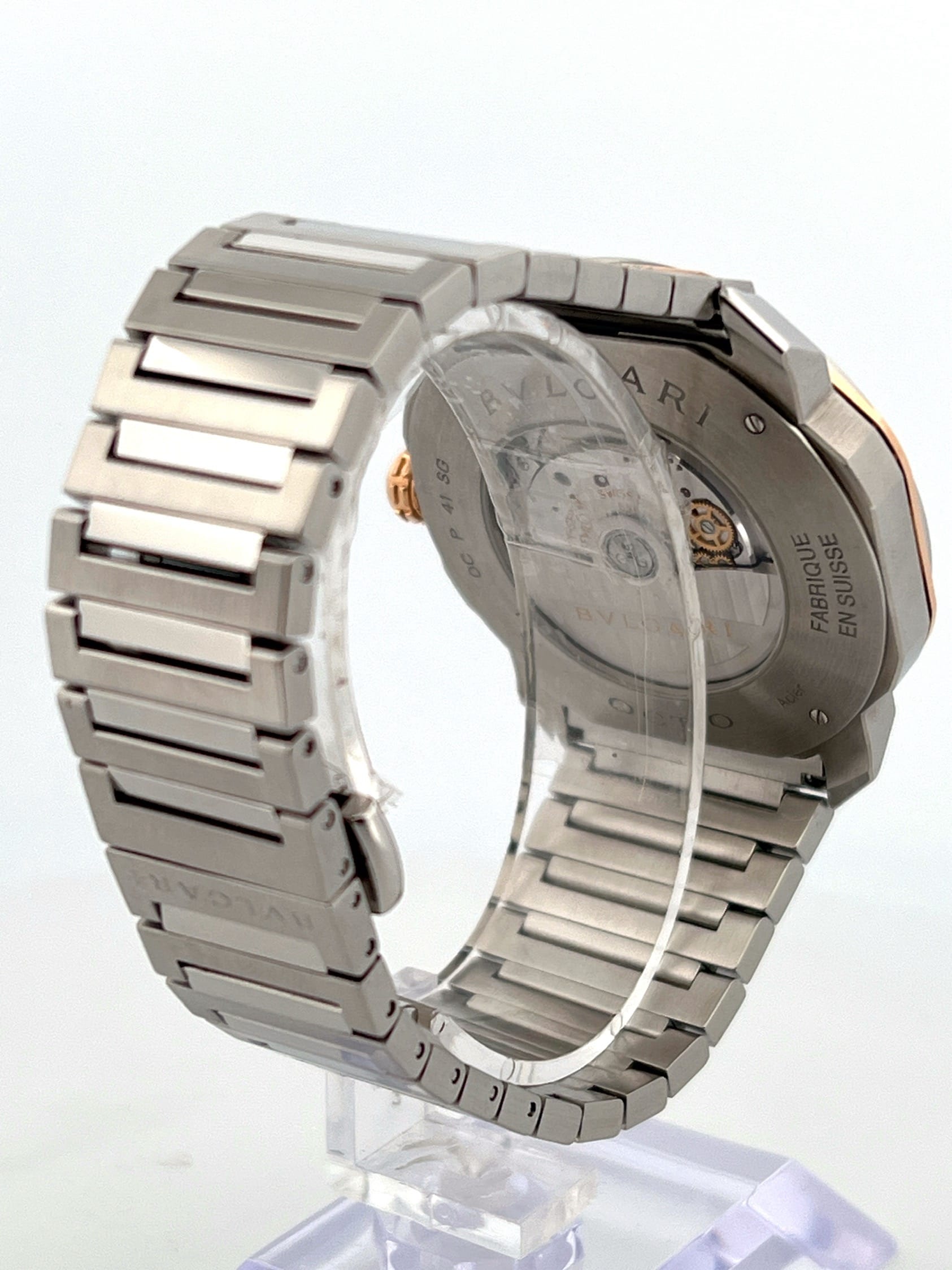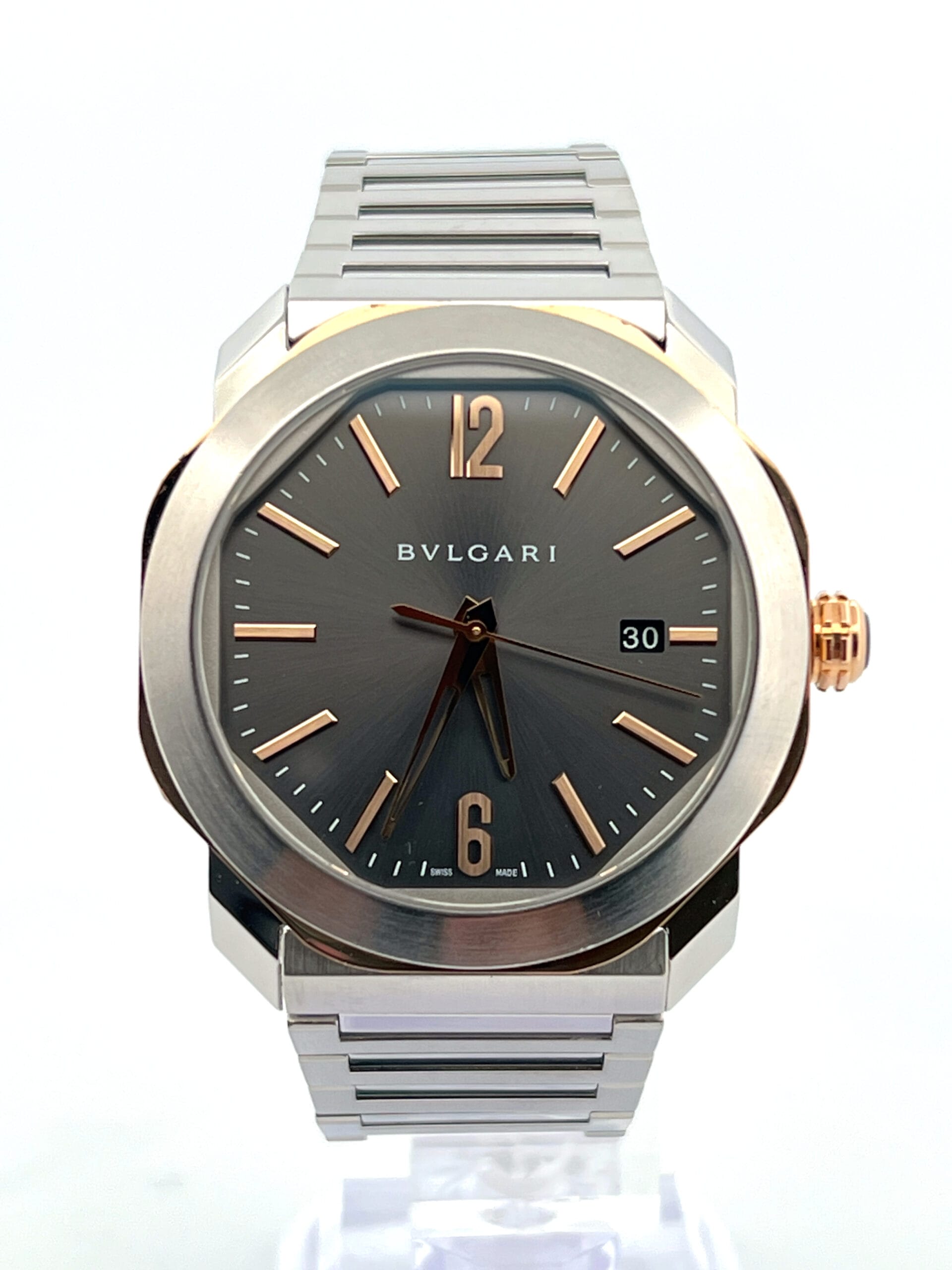 In the world of luxury horology, the Octo Roma 41 mm (Ref. 103083) from Bvlgari positions itself as an elegant union of Italian design flair and Swiss mechanical precision. At 41 mm in diameter and featuring a case crafted from stainless steel paired with an 18 kt rose-gold octagonal bezel, the watch commands presence without overwhelming the wrist. The anthracite/grey sunburst dial (sometimes annotated as “grey” in listings) offers a subdued yet refined canvas—hand-applied indices and rose gold-tone hands lend the piece quiet sophistication.