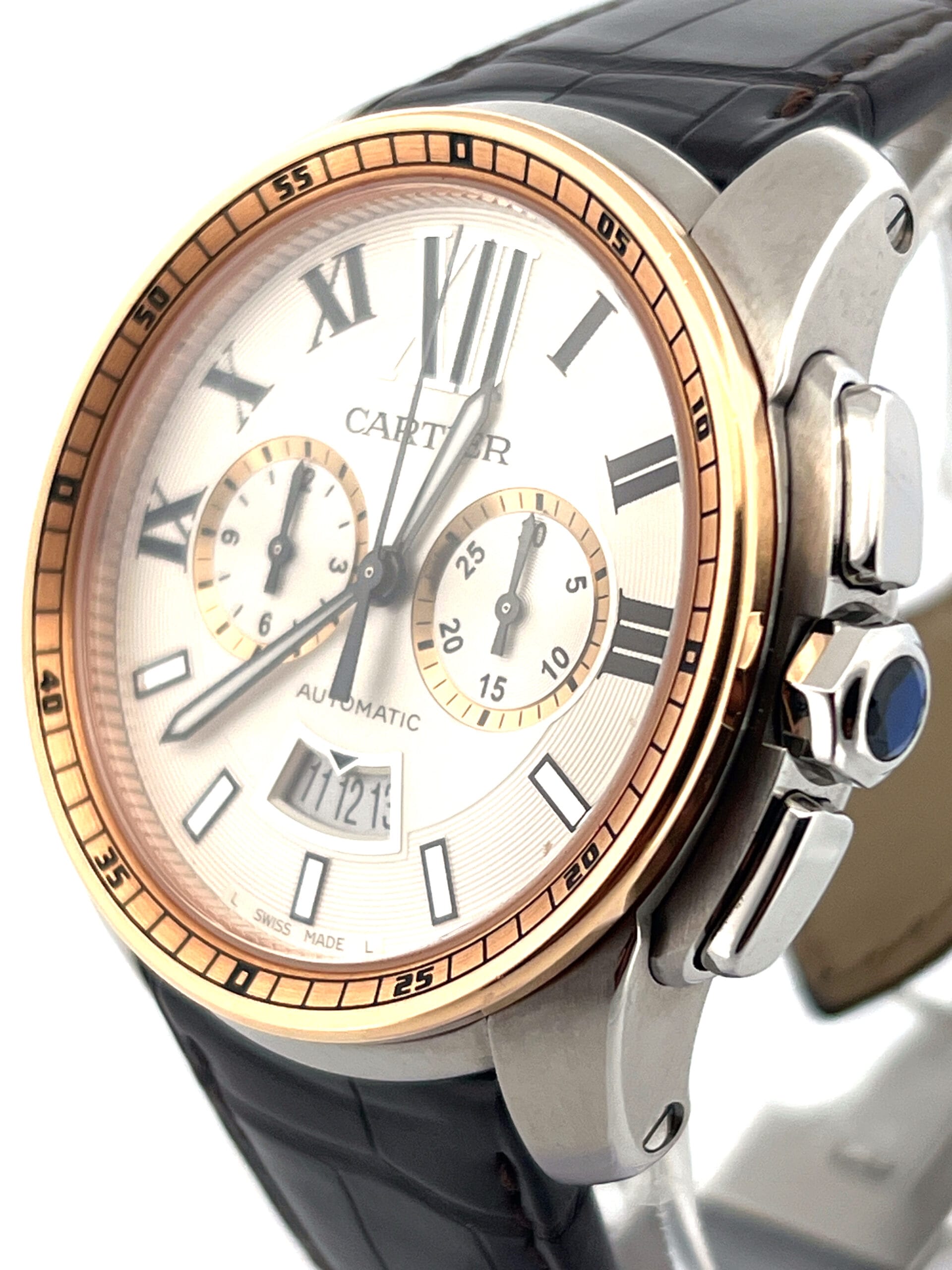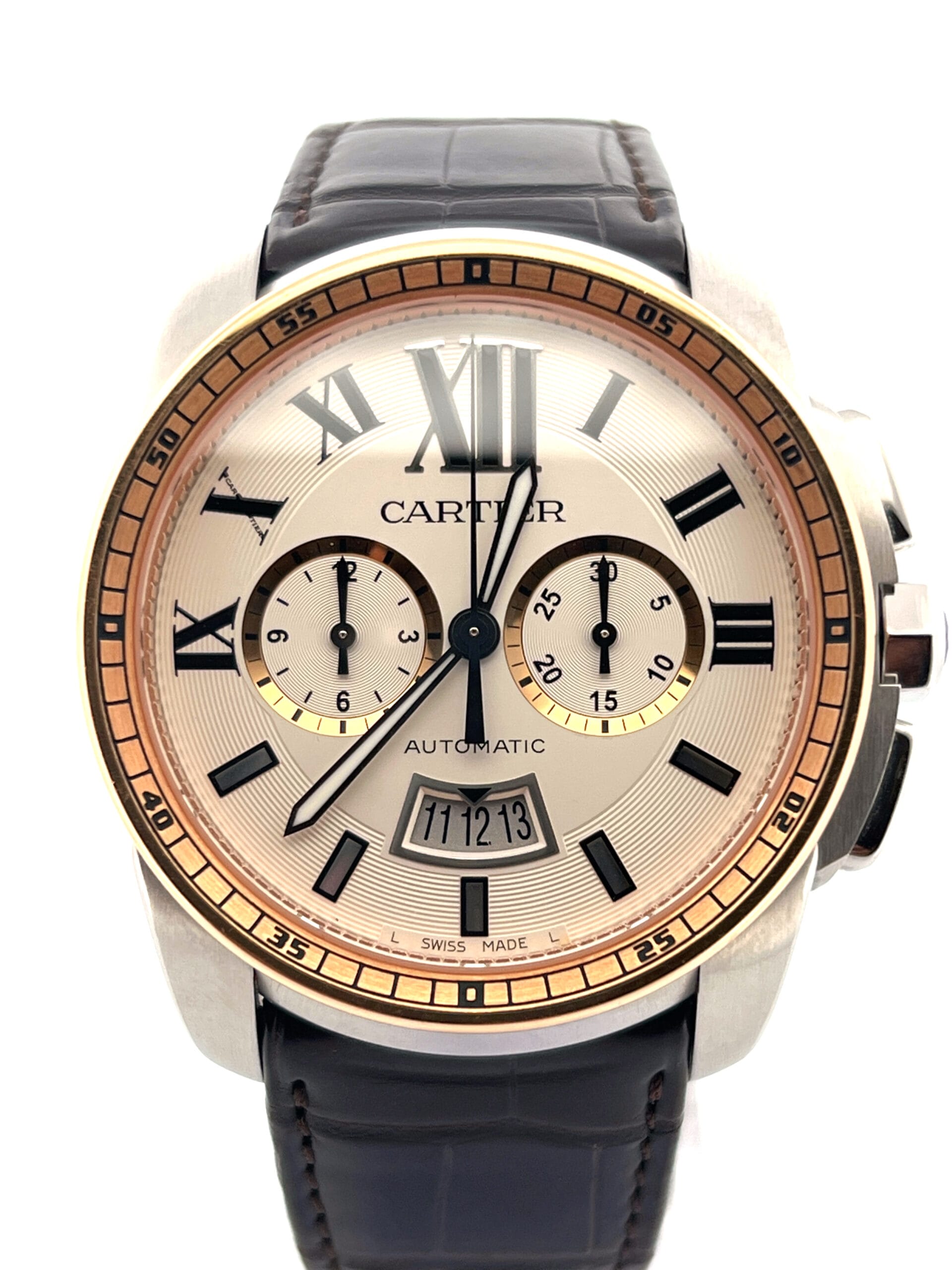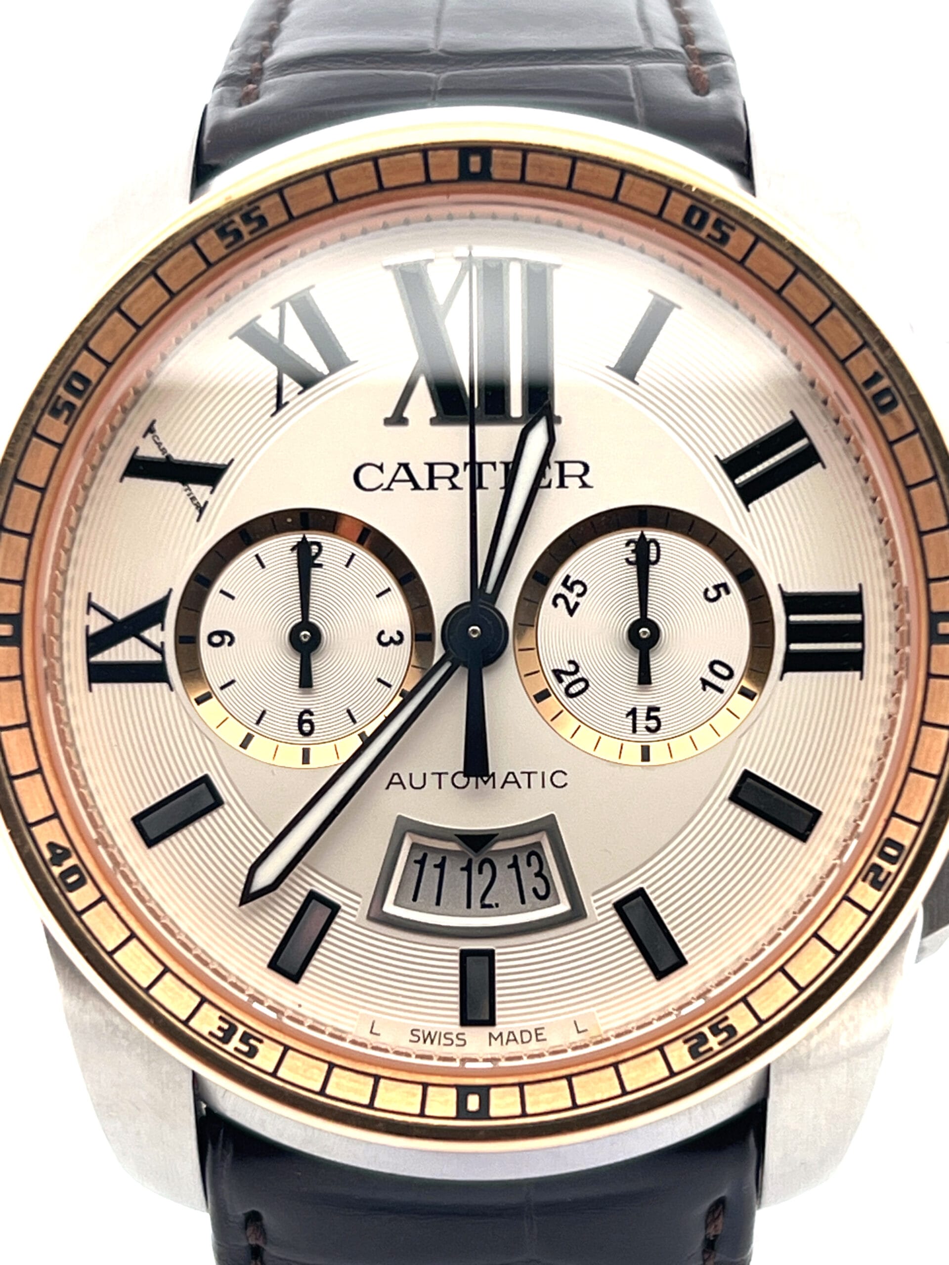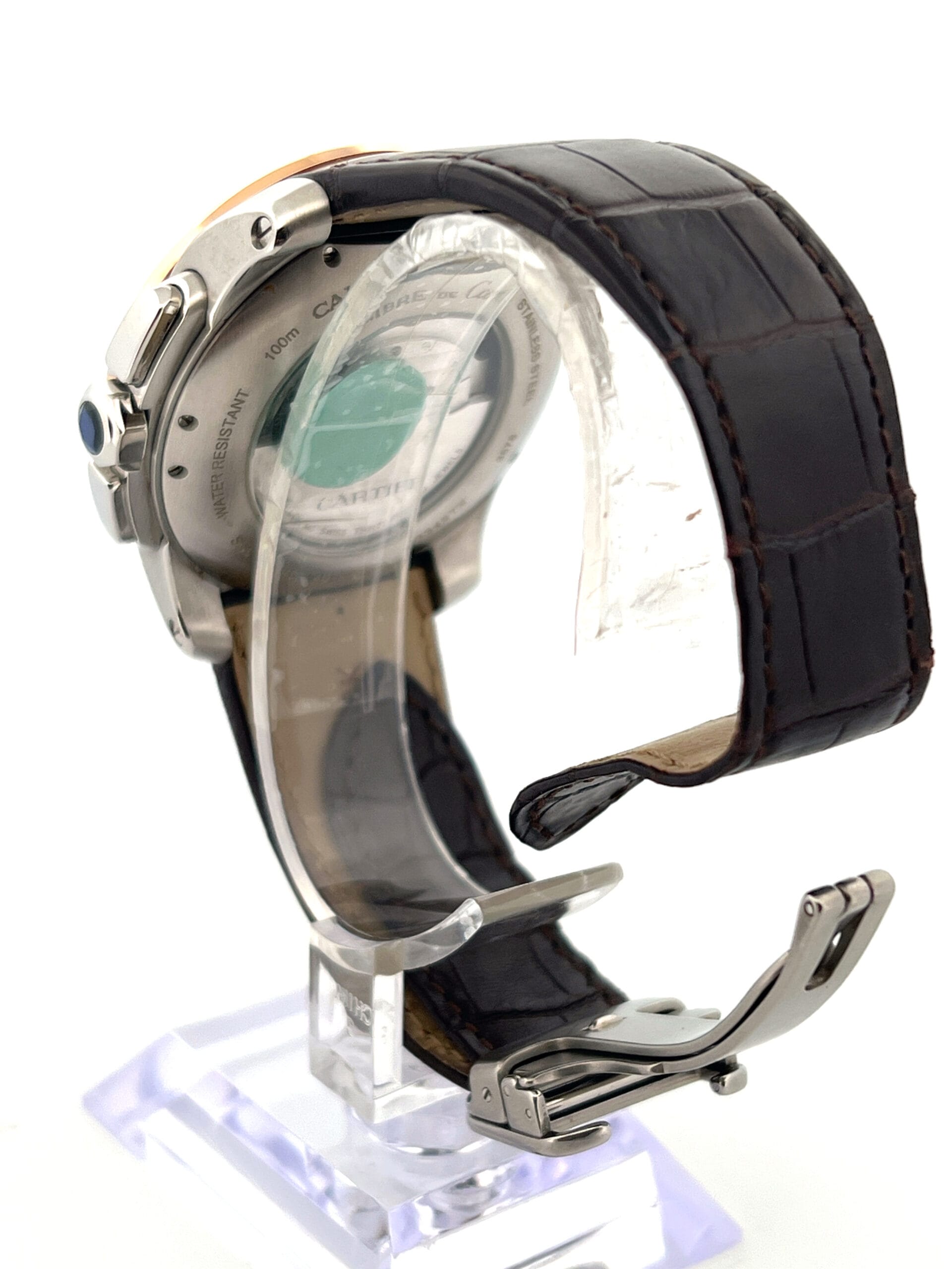By 2013, Cartier expanded the line to include the Calibre de Cartier Chronograph, powered by the 1904-CH MC, the brand’s first in-house automatic chronograph movement. This was not a reworked ETA or outsourced module — it was built from the ground up, featuring a column wheel, vertical clutch, and a bi-directional winding system — all signs of serious horological intent. The reference 3578 represents this key chronograph variant in steel, showcasing Cartier’s move toward robust, technically grounded timepieces.