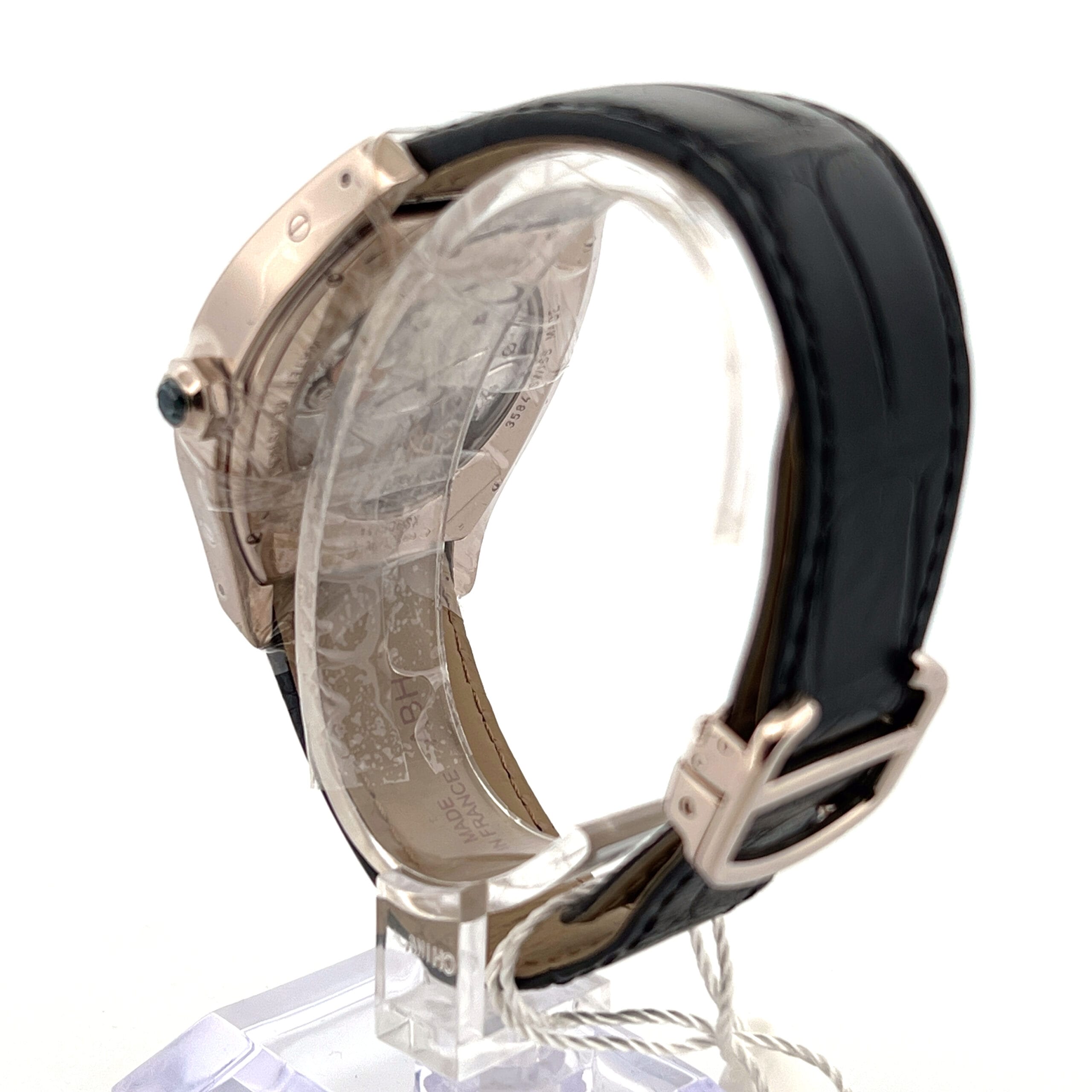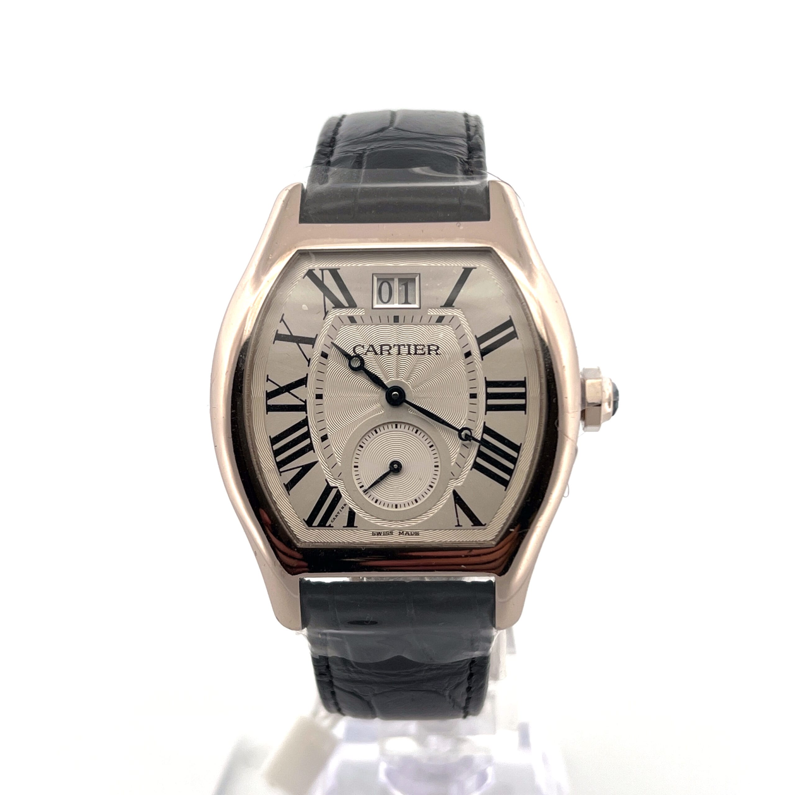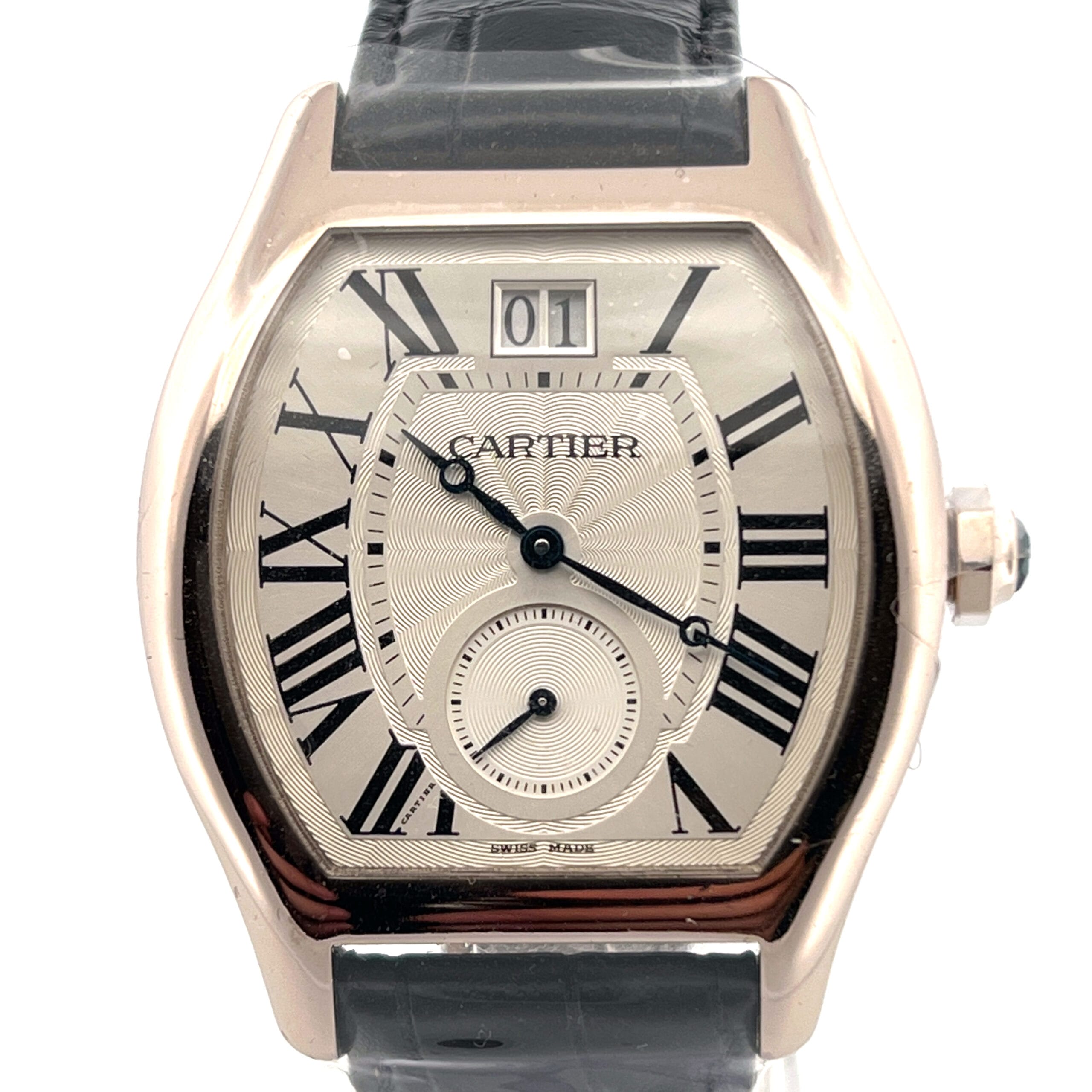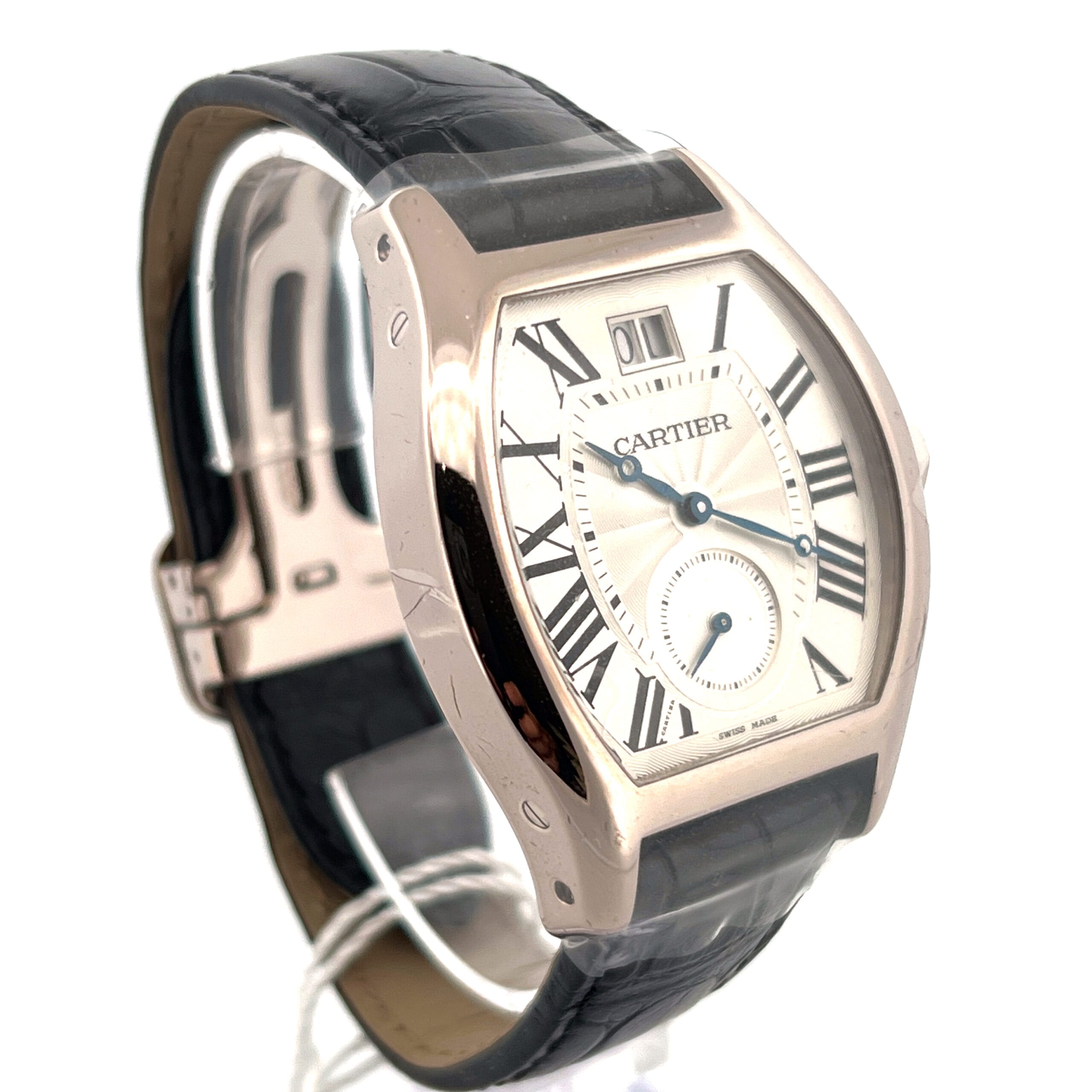 The watch features a silver flinqué dial, adorned with a subtle guilloché pattern that catches the light beautifully, adding depth and texture to the design. Classic black Roman numerals and blued steel hands create a harmonious contrast, staying true to Cartier’s timeless design language.