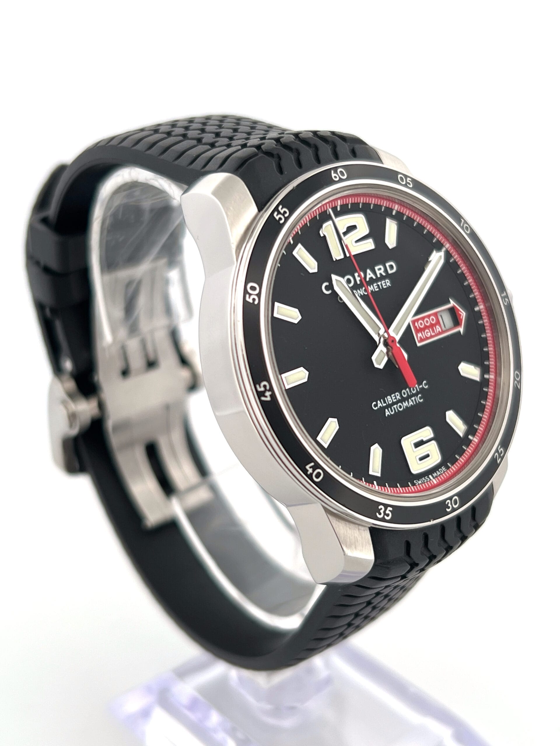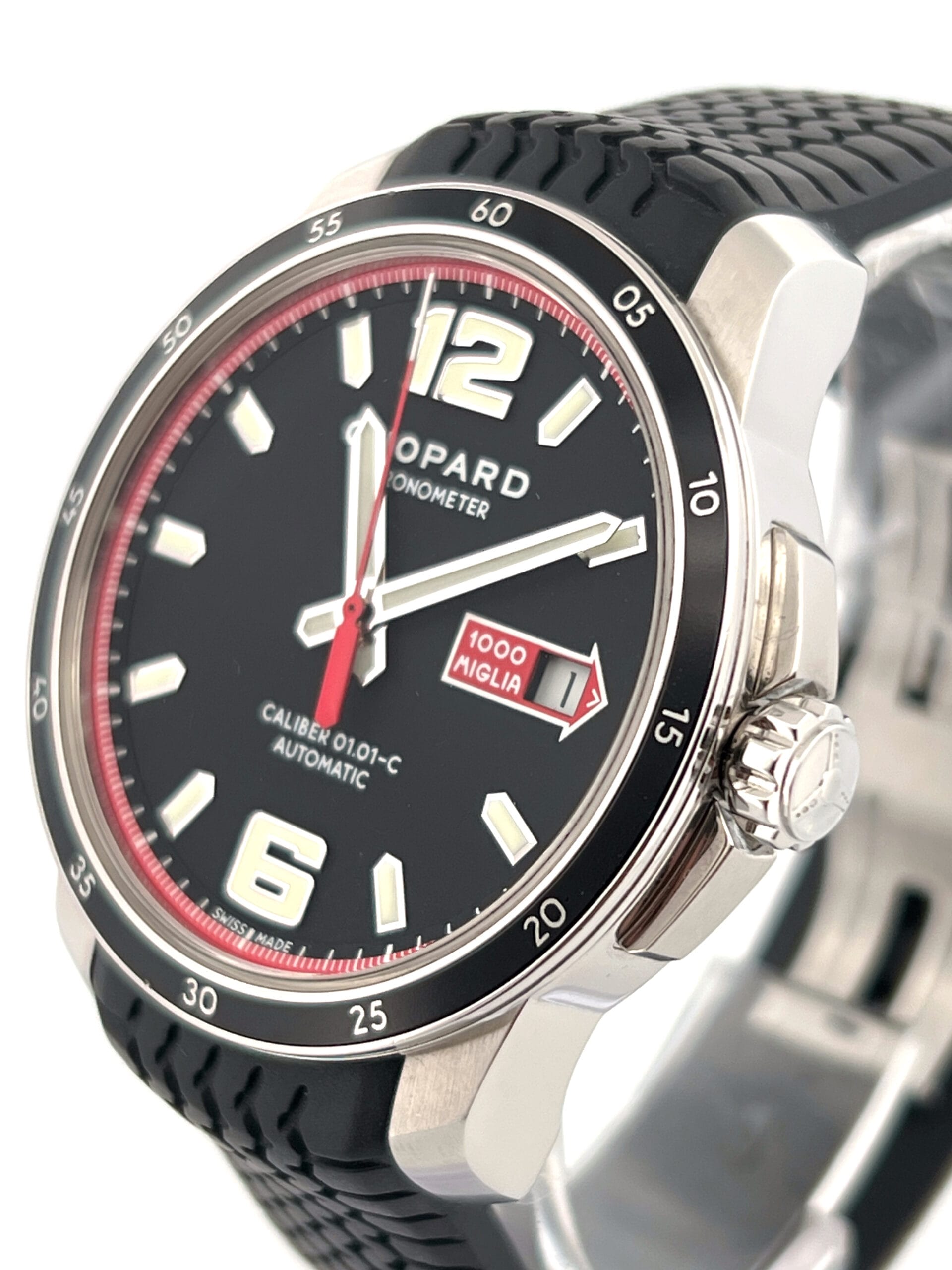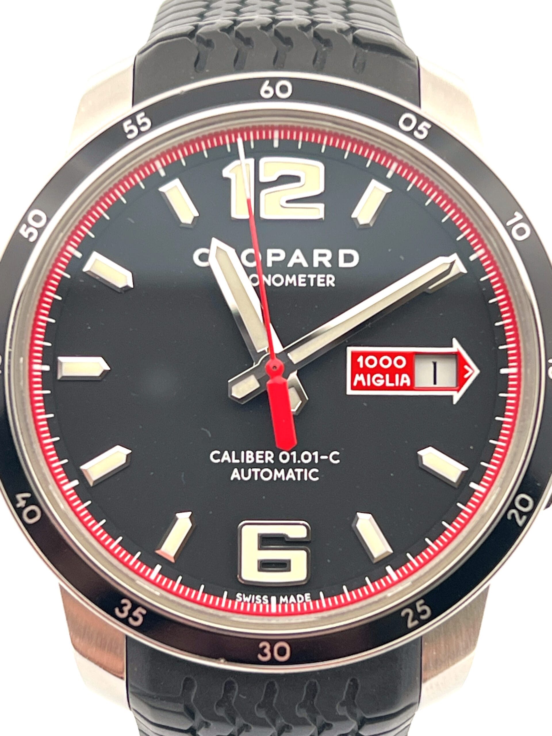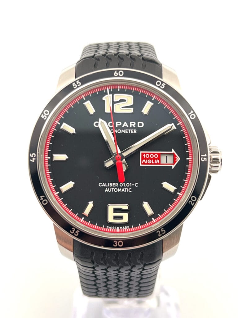 The matte black dial is all about clarity and contrast. Oversized Arabic numerals at 6 and 12 o’clock anchor the layout, while bold baton markers and luminous hands ensure excellent legibility at a glance. A red-tipped seconds hand races across the dial, echoing the red Mille Miglia arrow that frames the date window—an emblem that ties Chopard to the famed Italian road rally since 1988.