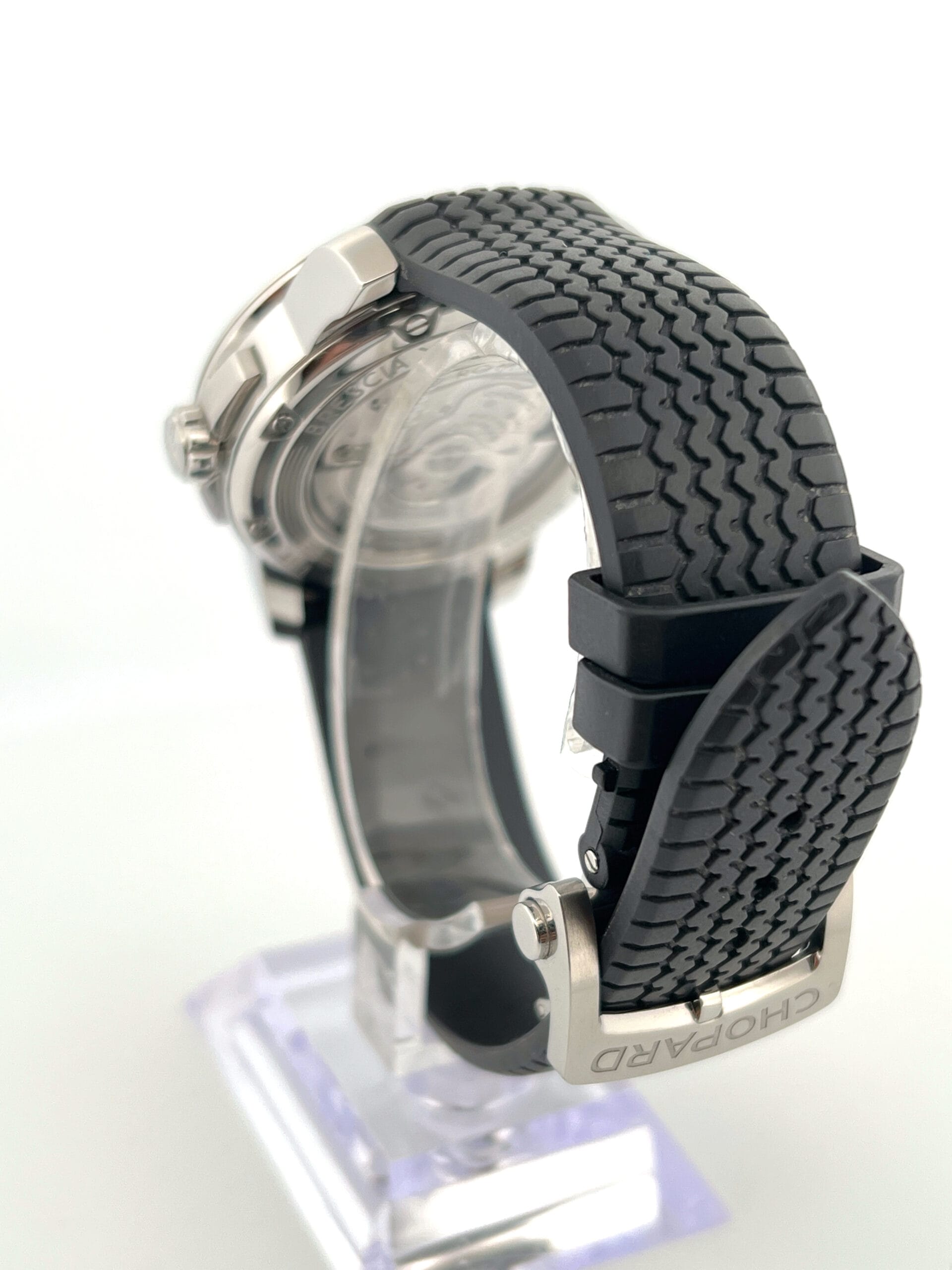 Powering this modern racer is the in-house Chopard Caliber 01.01-C, a COSC-certified automatic movement delivering a 60-hour power reserve and visible through a sapphire exhibition caseback. The movement’s bridges are finished in industrial style, evoking the raw mechanics of a vintage car engine—purposeful, robust, and built to perform.