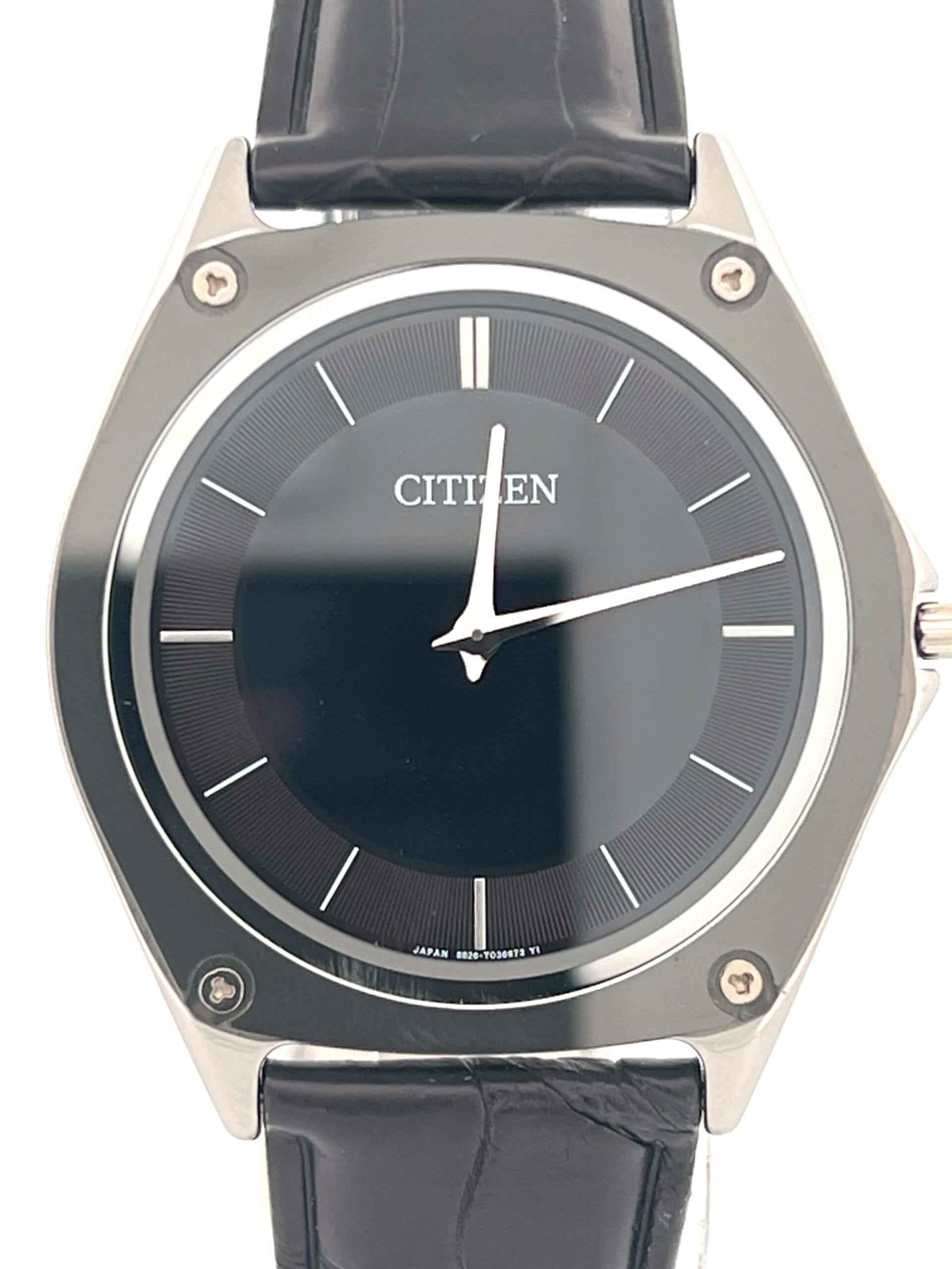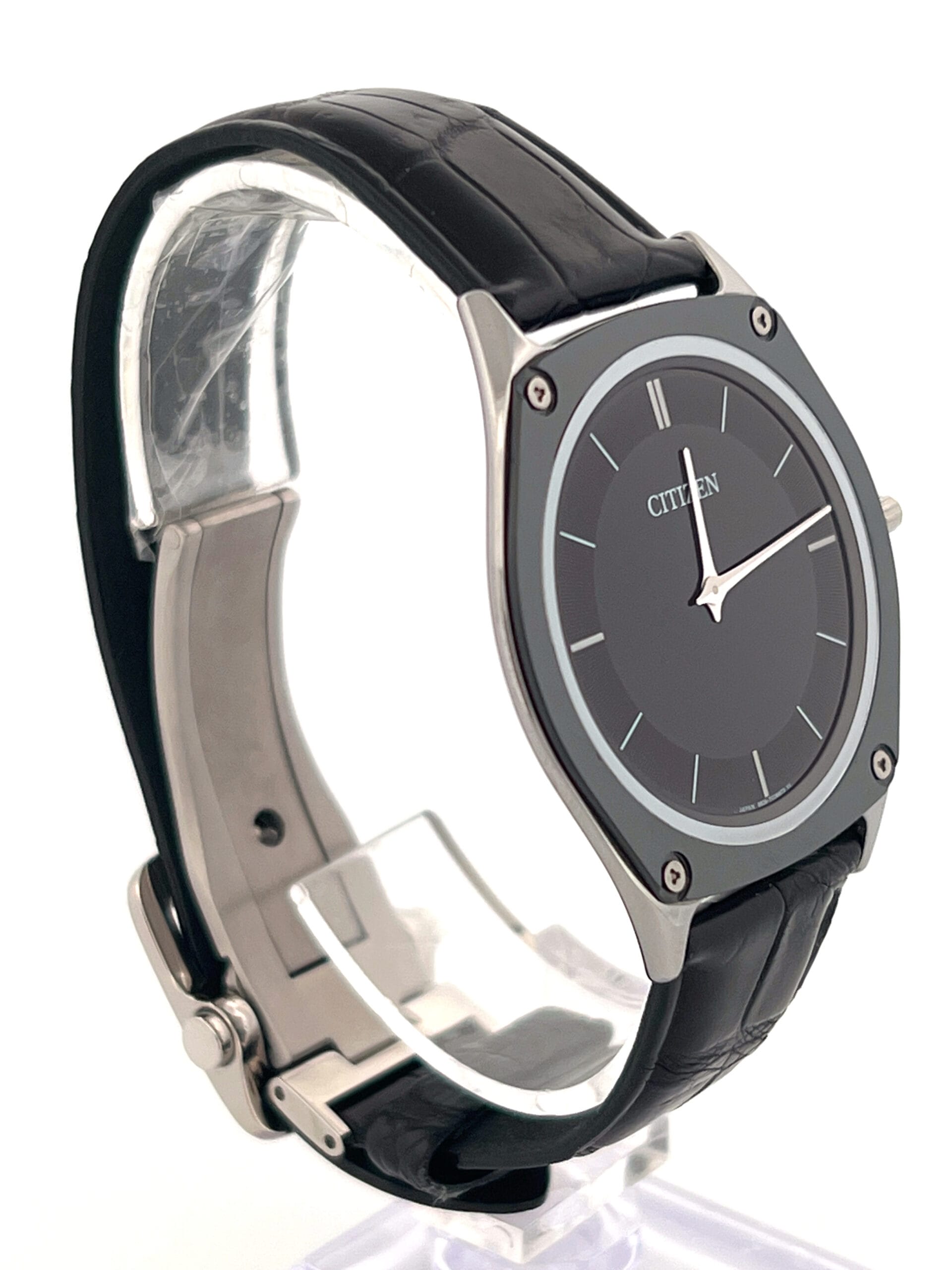 The Citizen Eco-Drive One AR5044-03E presents itself with an understated elegance that becomes more impressive the longer it is handled. The first impression comes from its remarkable thinness, which allows the watch to sit almost seamlessly against the wrist, creating a wearing experience that feels closer to a refined object than a traditional timepiece. The black dial remains clean and disciplined, allowing the slim case profile and subtle finishing to define the watch’s character. On the wrist, it feels composed, precise, and intentionally minimal, offering presence through proportion rather than decoration.