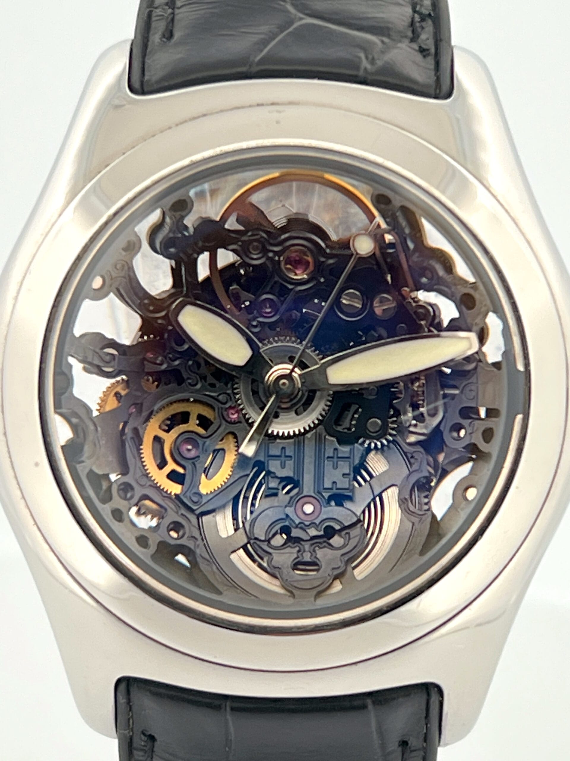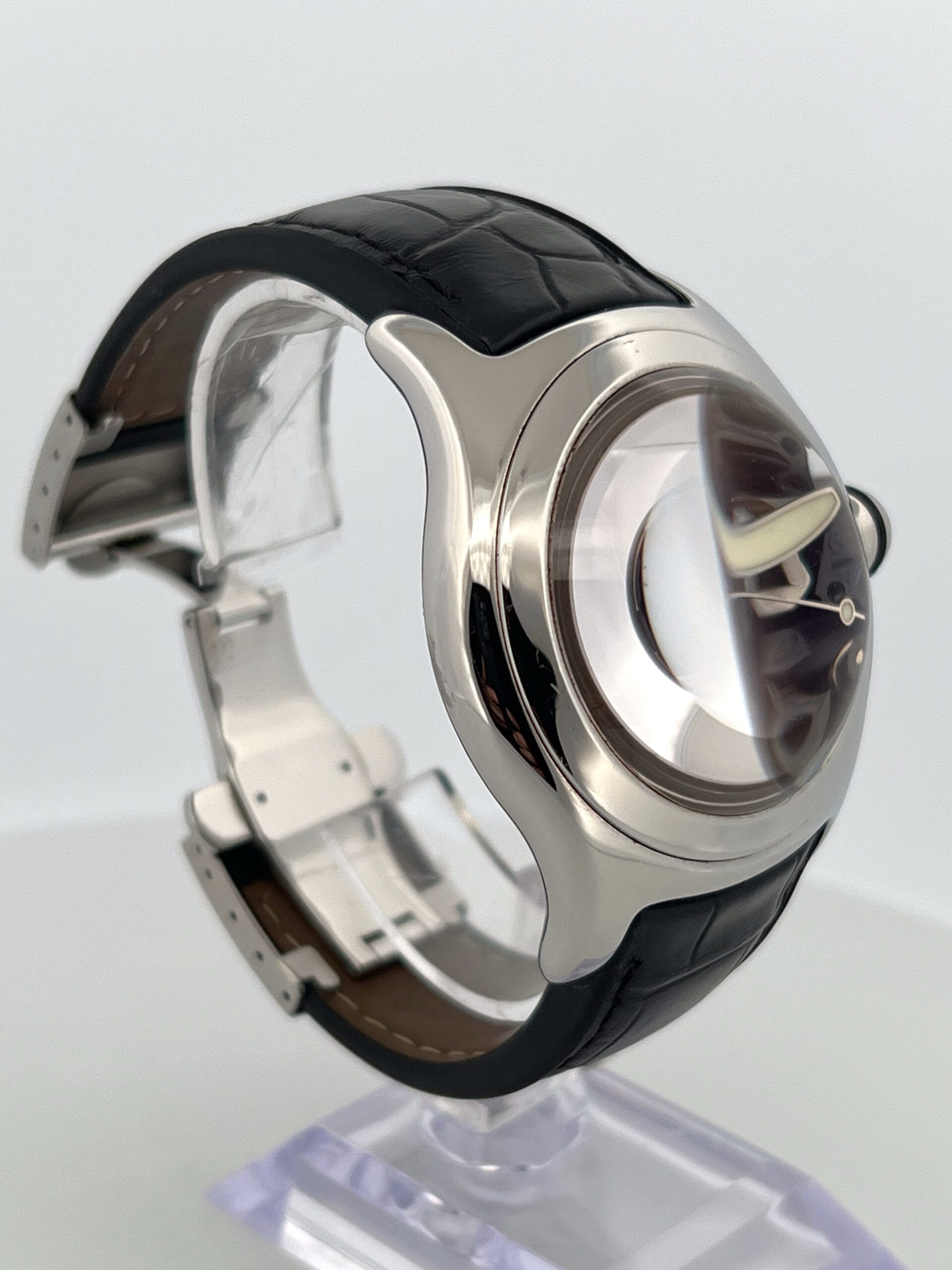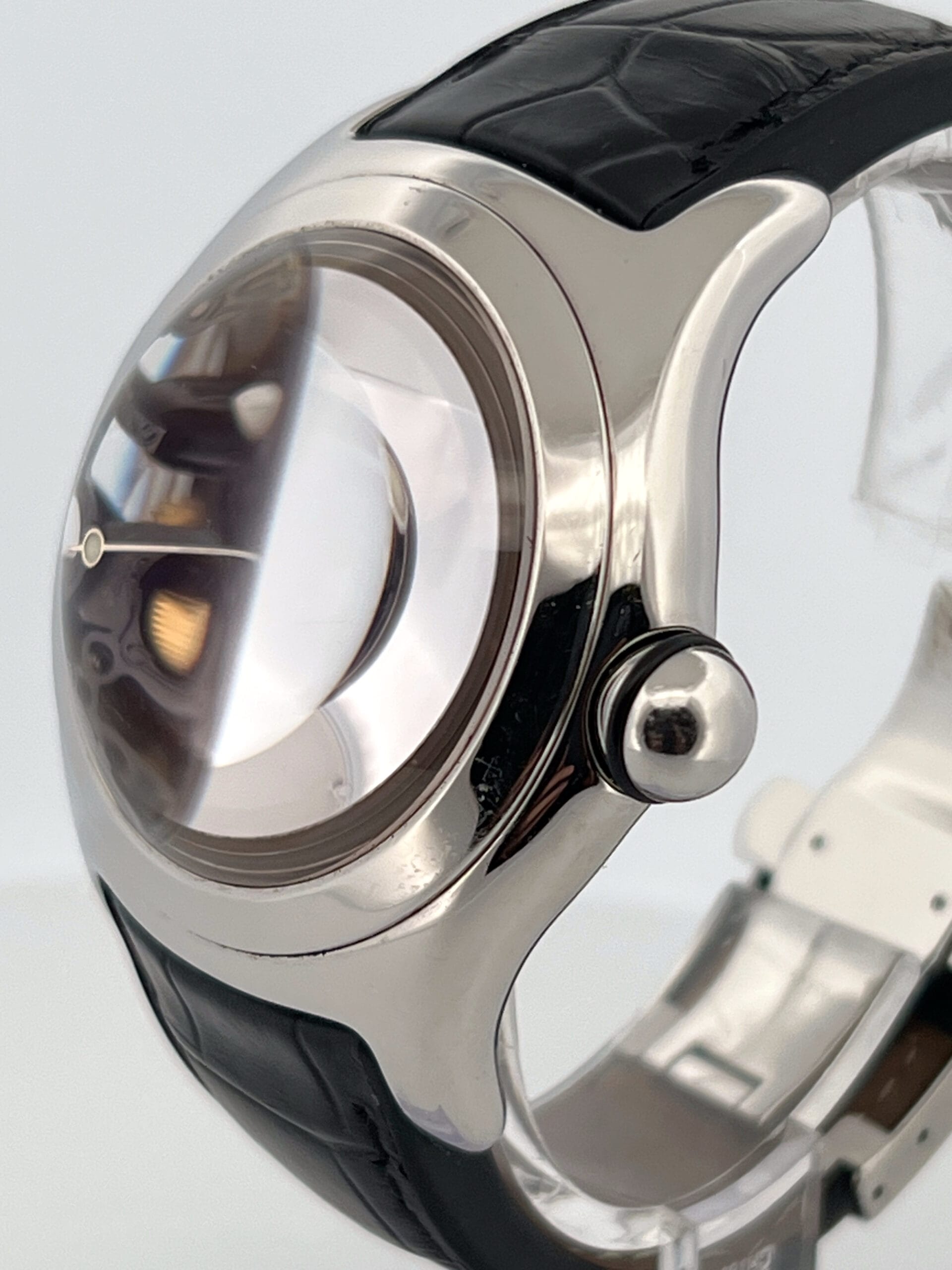 By around 2004, Corum introduced the Bubble Skeleton Ref. 082.130.20, the first skeletonized iteration of the Bubble line. Measuring a commanding 45 mm in diameter and an astonishing 18 mm thick, its case is polished and brushed stainless steel with concave lugs and an exhibition back secured by six screws.