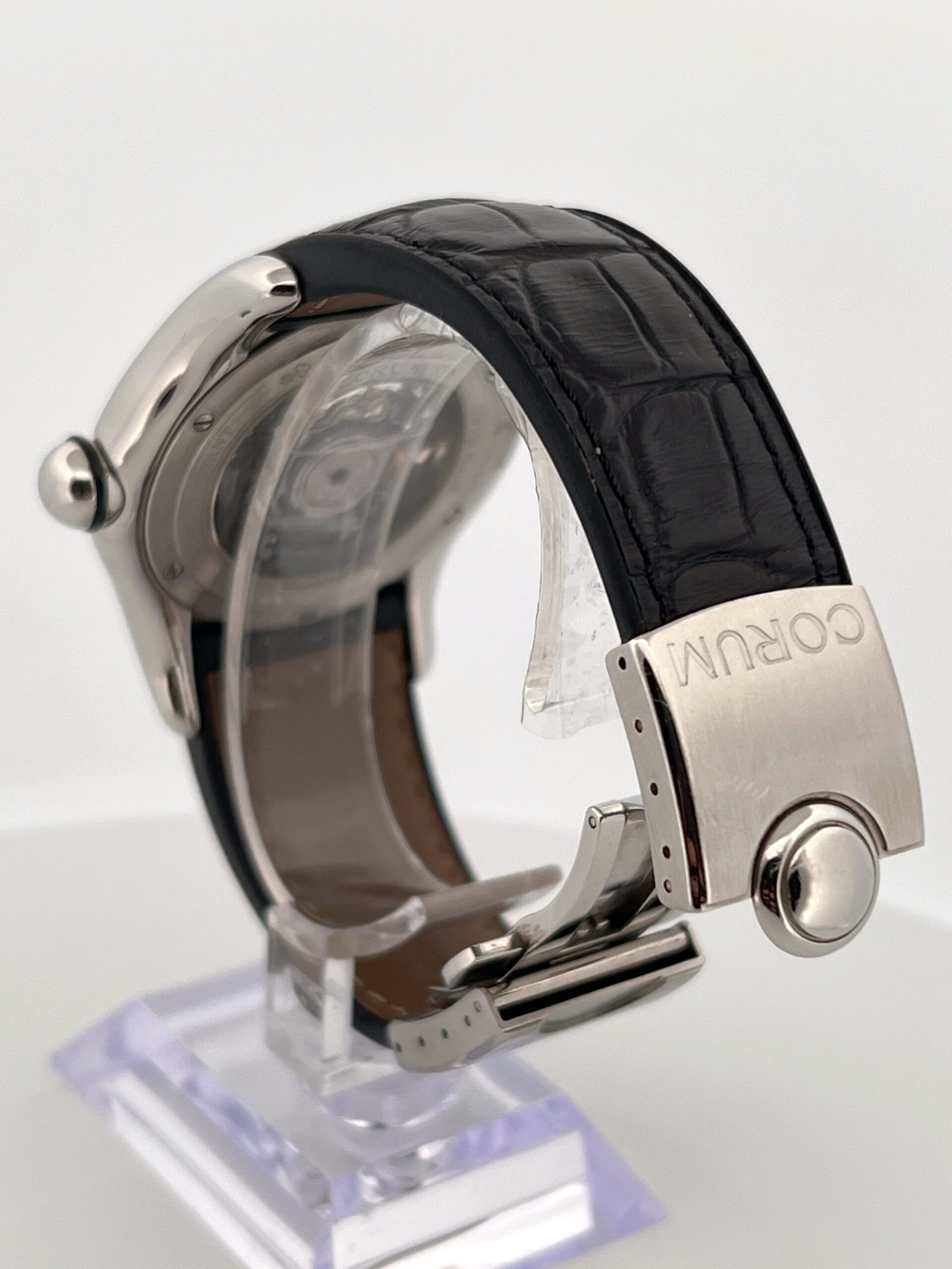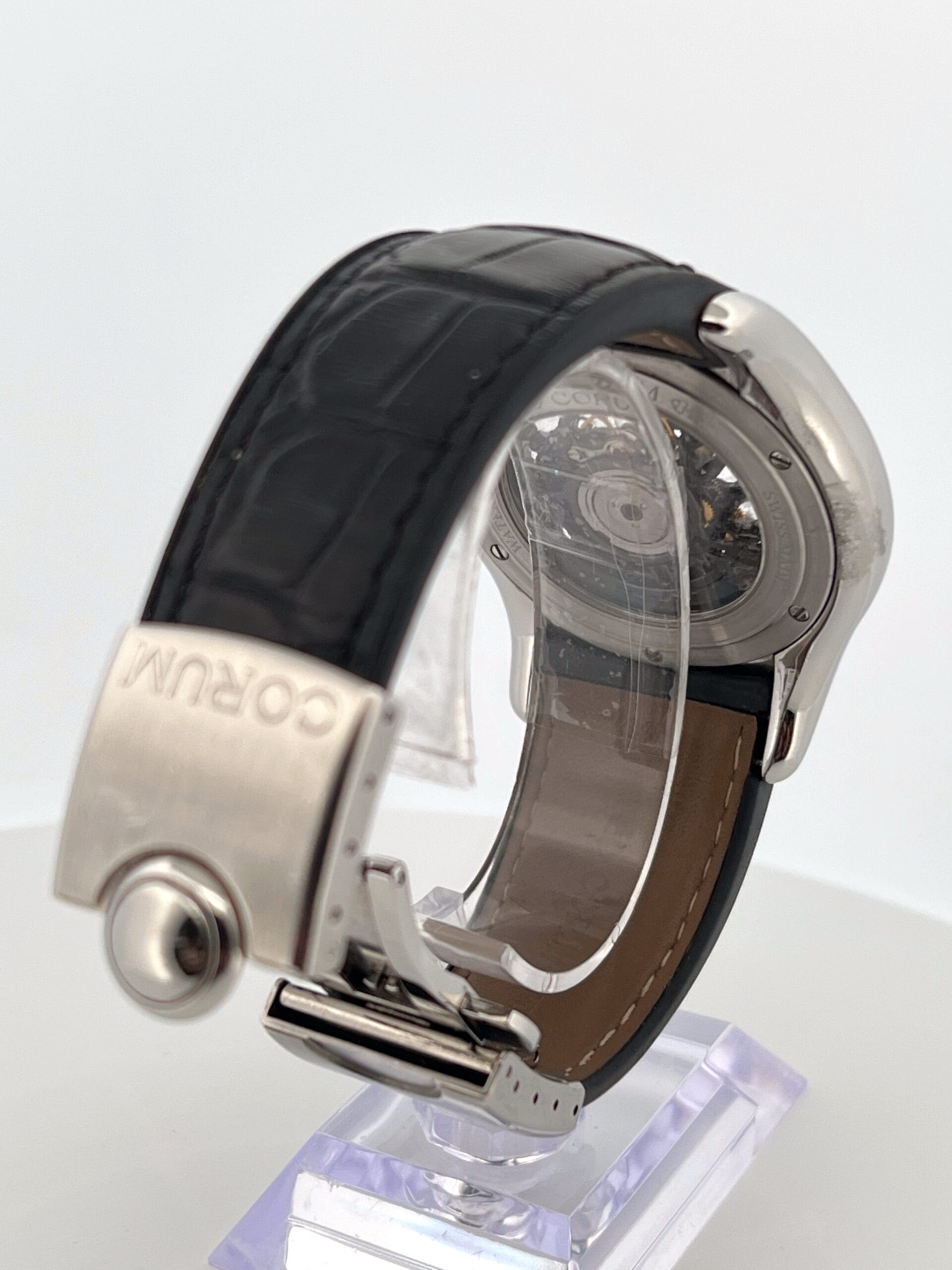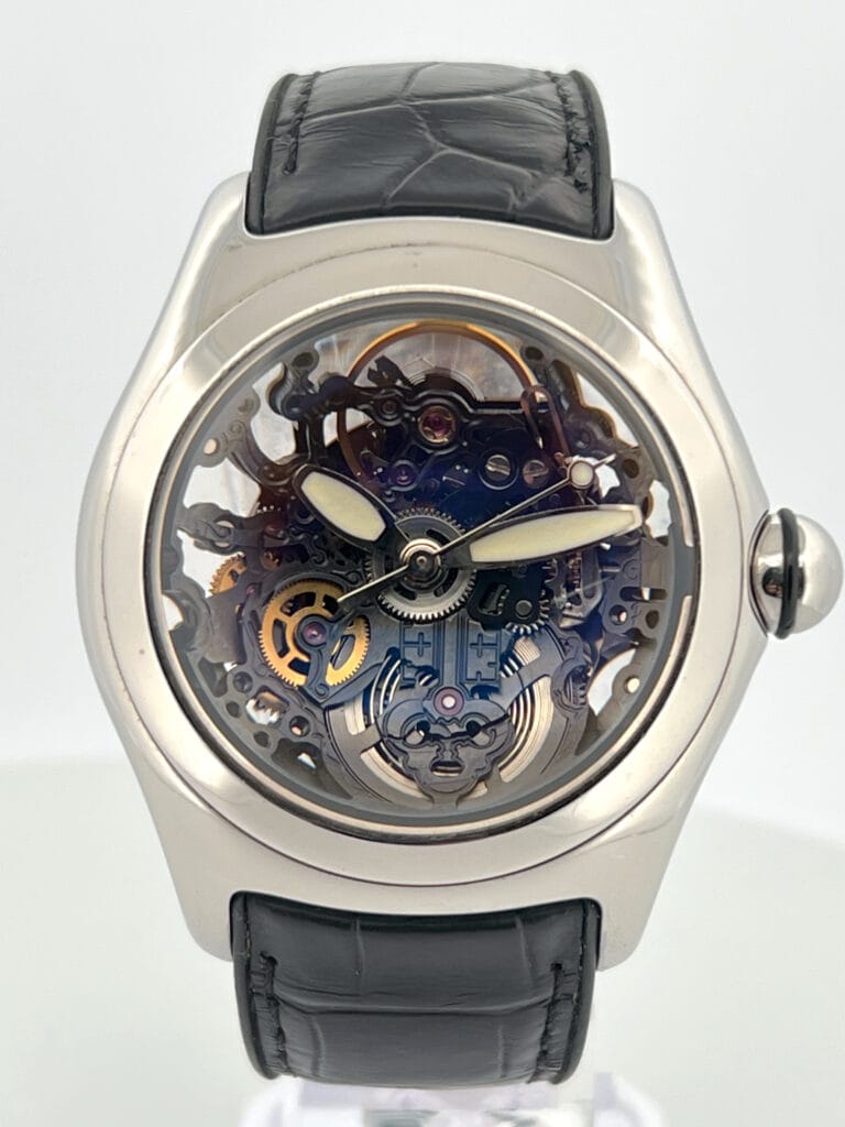 By around 2004, Corum introduced the Bubble Skeleton Ref. 082.130.20, the first skeletonized iteration of the Bubble line. Measuring a commanding 45 mm in diameter and an astonishing 18 mm thick, its case is polished and brushed stainless steel with concave lugs and an exhibition back secured by six screws.