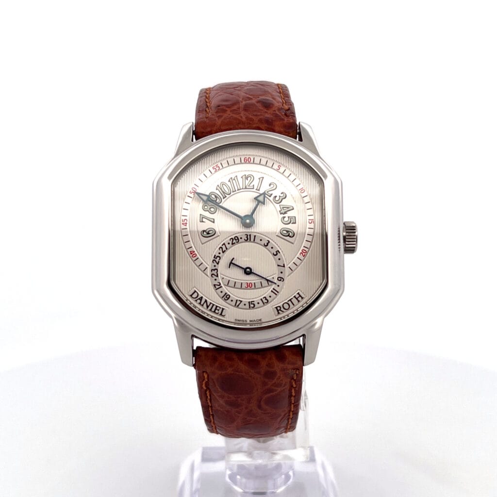 The Daniel Roth Premier Retrograde Leather Men’s Watch 807.L.10 has the iconic case shape Daniel Roth is known for. Fashioned in steel, the 41 x 35 mm case houses a silver textured vertical guilloche dial. On it is a radial formation of applied luminous Arabic numerals for the hours and an outer minute track with 5-minute Arabic numeral mark in red. Overlapping the minute track is a subsidiary dial for the date. Inside this watch is DR700/10 automatic movement with 27 jewels. This is a pre-owned Daniel Roth Premier Retrograde Leather Watch 807.L.10.
