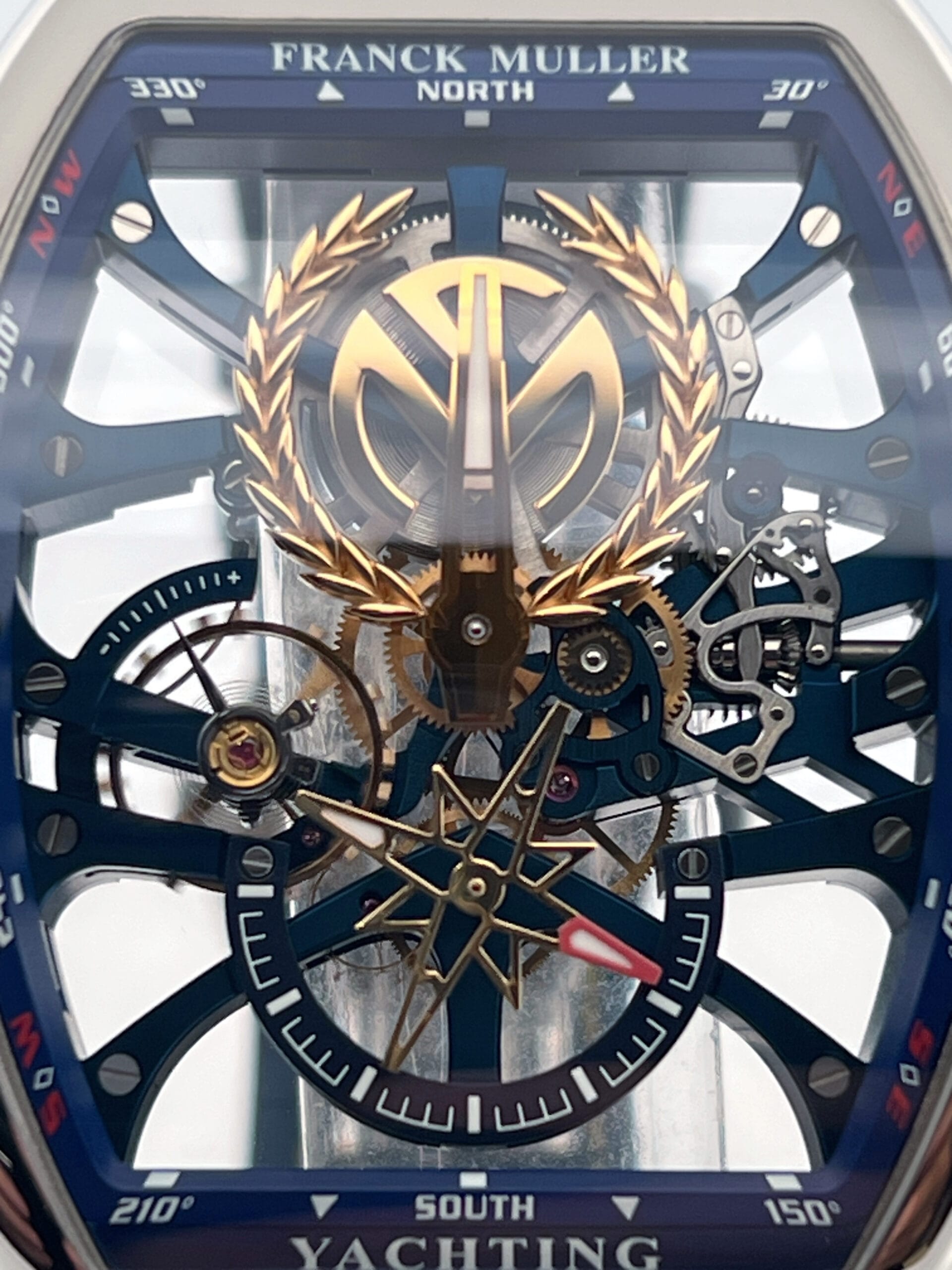 At its heart lies a fully skeletonized manual-winding movement, the Franck Muller Caliber FM 1740-VSYA, where anchor-shaped bridges, rendered in deep nautical blue, span the movement like rigging across a ship’s deck. The visual drama of the openwork design is balanced by thoughtful restraint: no superfluous flourishes, just pure mechanical transparency.