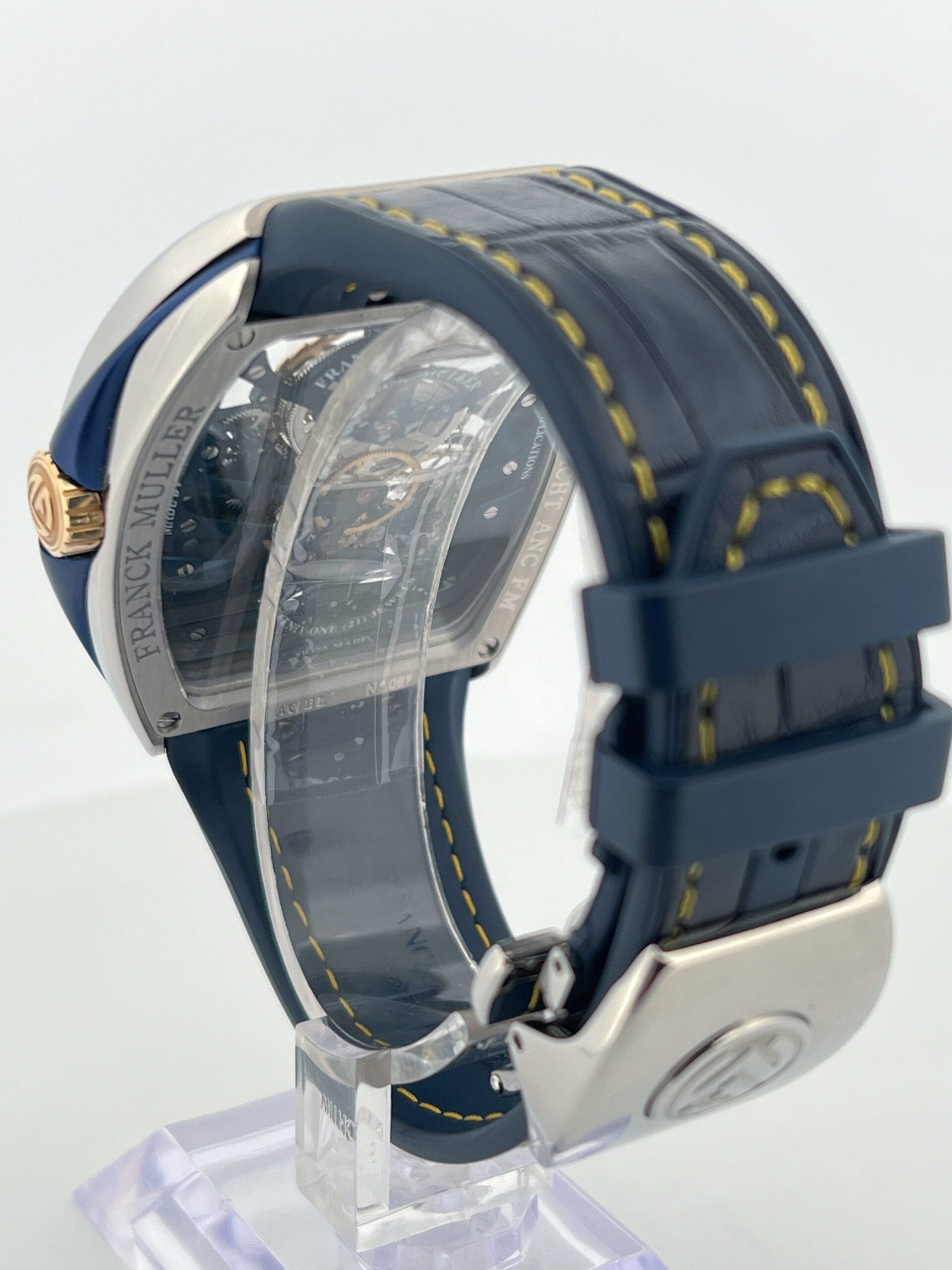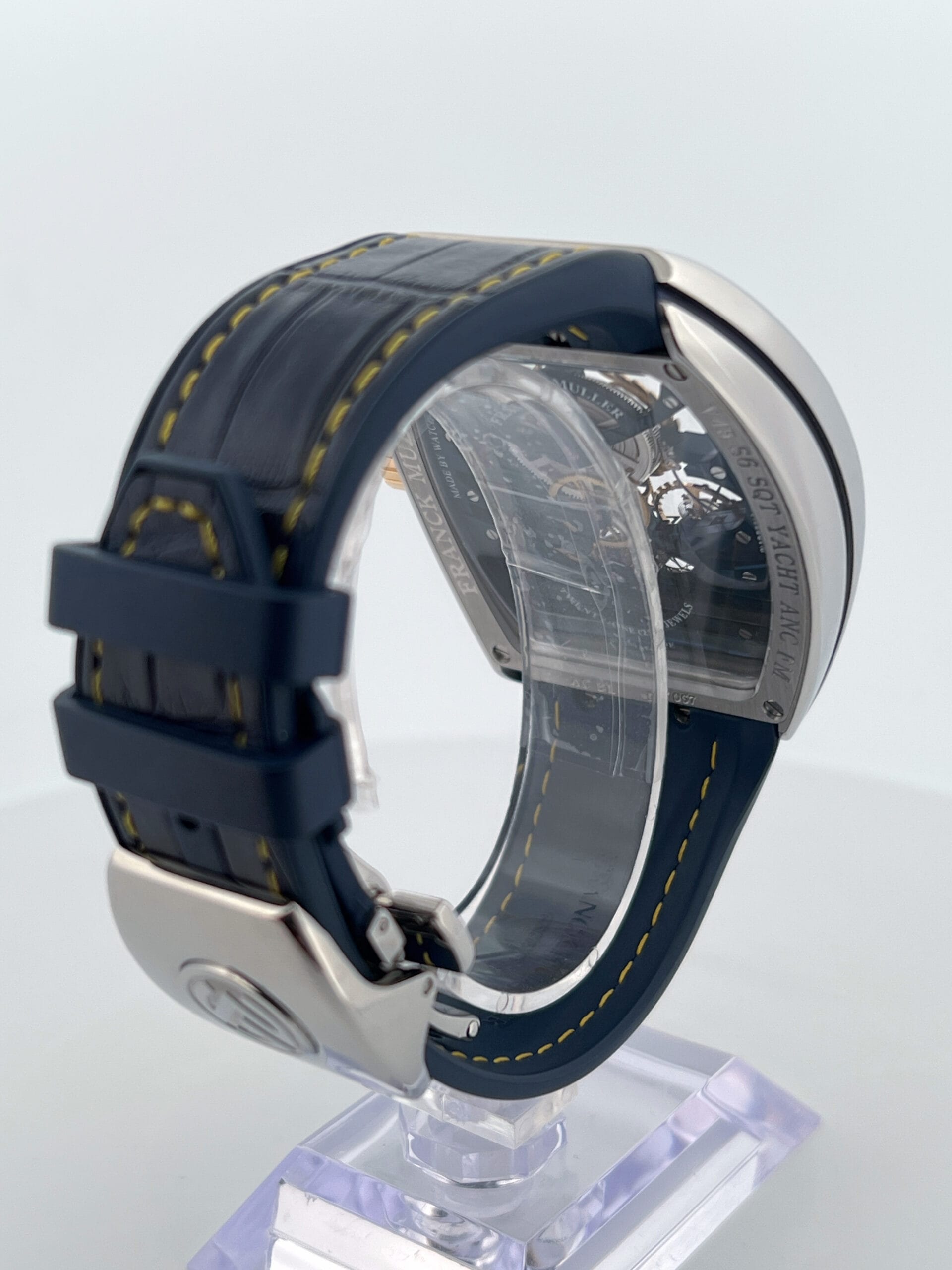 Framed in a polished steel curvex case, the watch carries the commanding proportions typical of the Vanguard line—measuring 44mm wide, 53.7mm long, and sweeping over the wrist like the hull of a racing yacht. But it’s the subtle contrast—the warmth of rose gold accents against the cool gleam of steel—that transforms this piece from a statement into a study in controlled elegance.