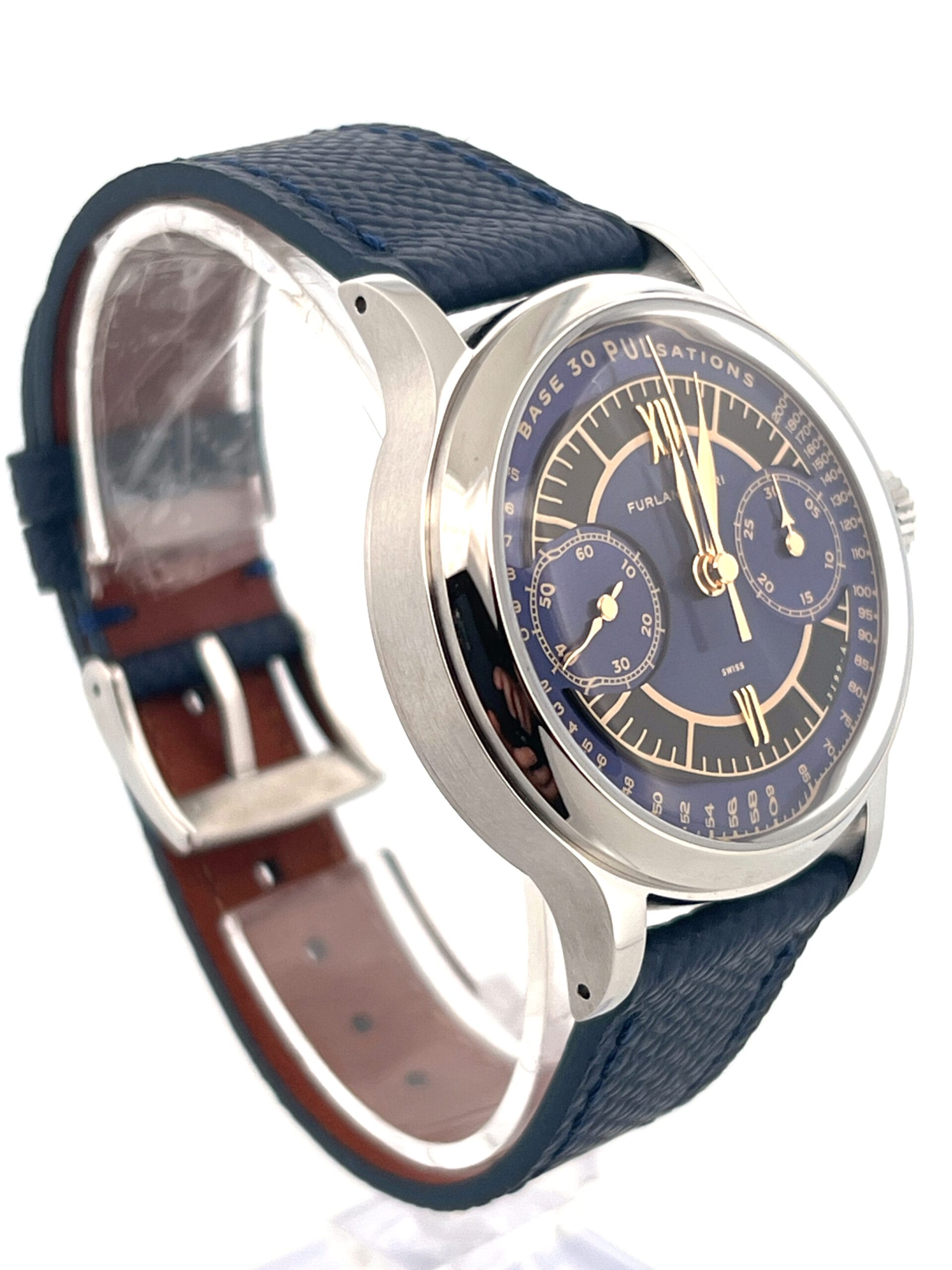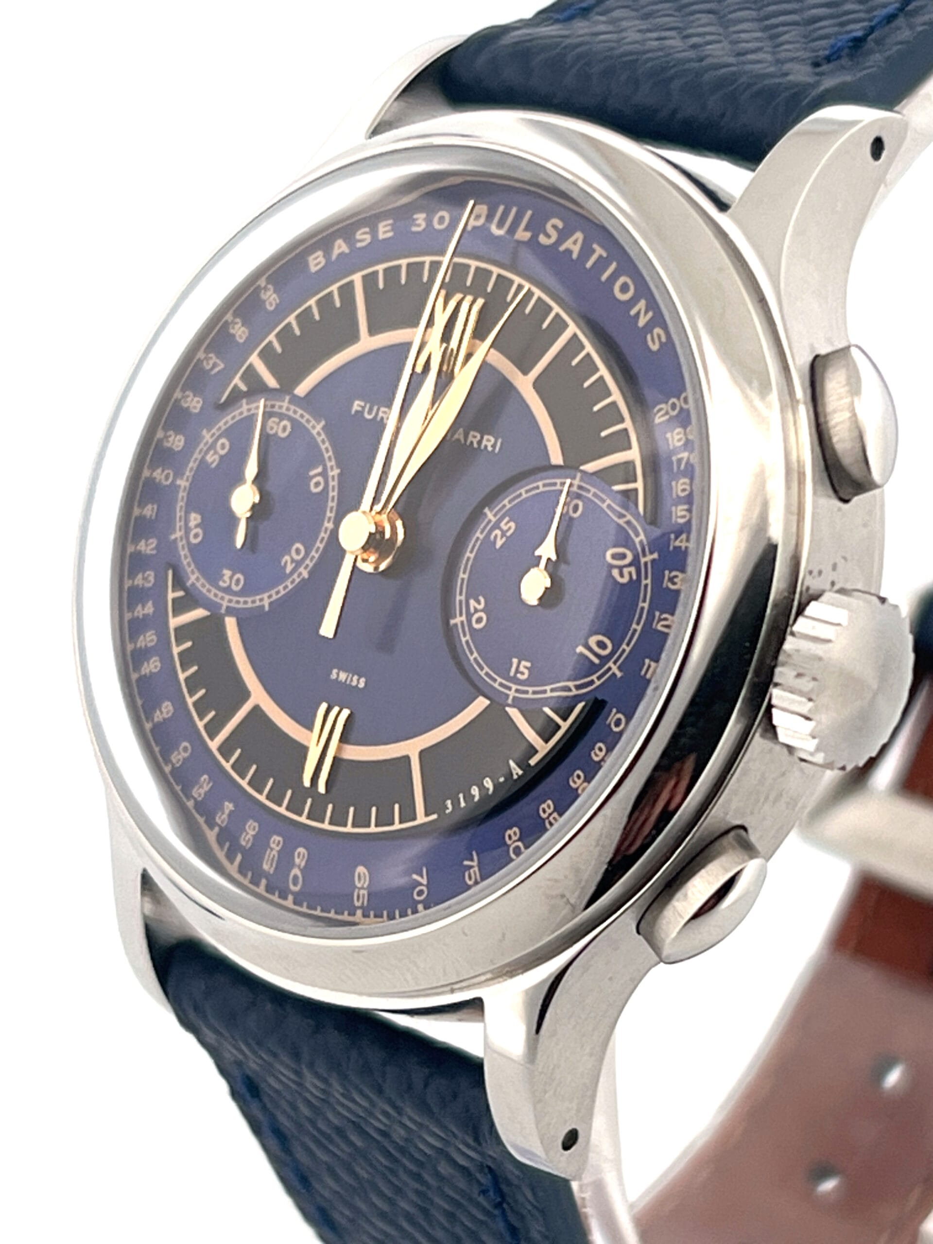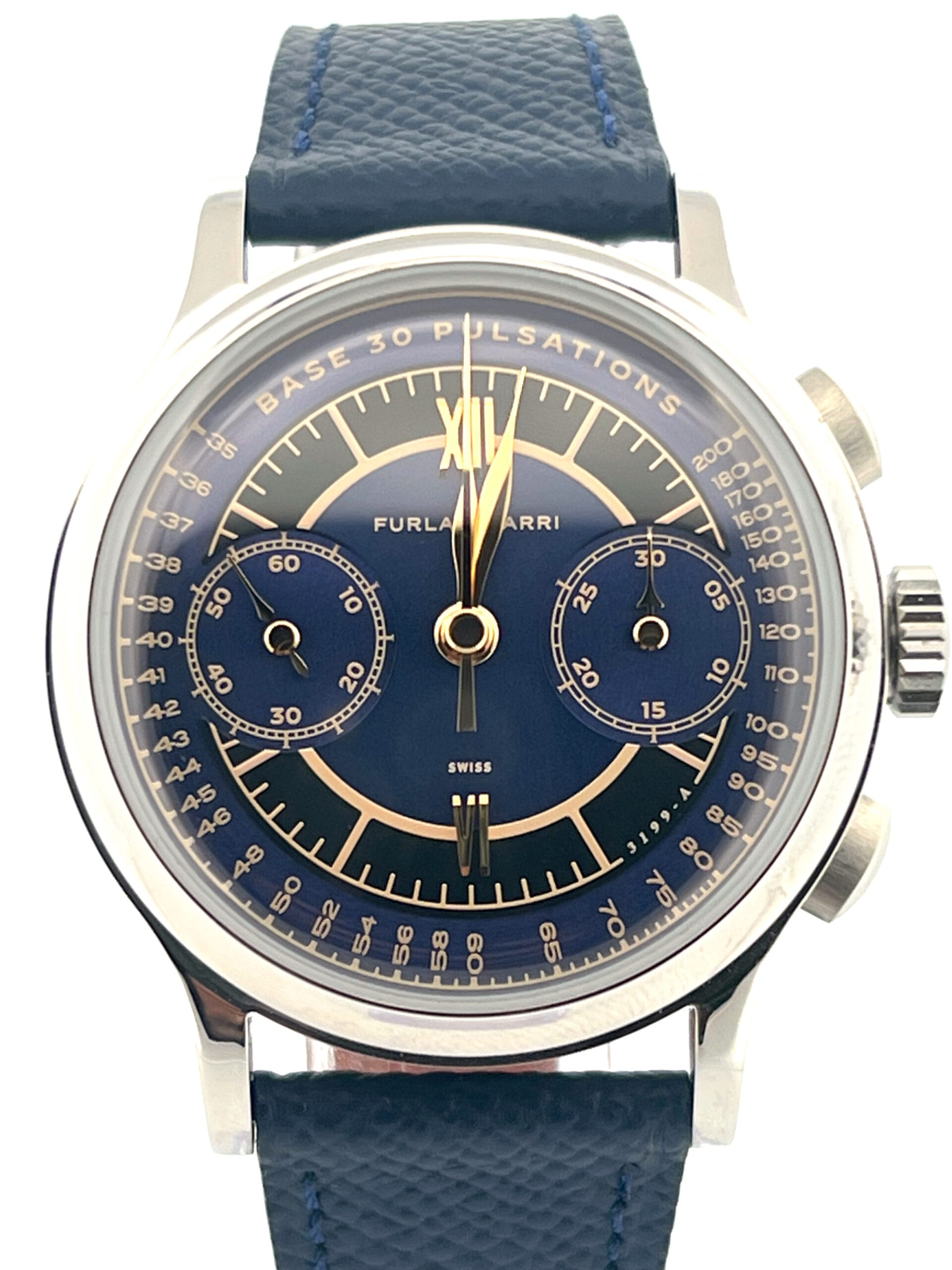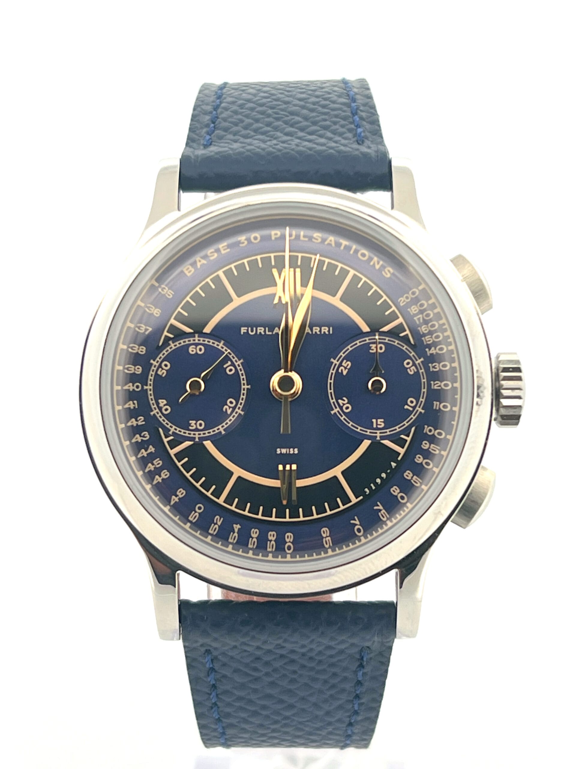 This reference captures the philosophy behind Furlan Marri and its approach to heritage-driven chronograph design. The Honey Blue Flyback builds upon the brand’s reputation for blending classical aesthetics with thoughtful mechanical substance, with the flyback chronograph complication serving as a nod to historically significant tool chronographs. Rather than presenting the complication as a technical showcase, the watch integrates it into a design language influenced by vintage chronographs from the golden era of watchmaking. The colour pairing adds a distinctive identity to this reference, allowing it to feel rooted in tradition while still carrying a recognisable contemporary signature that separates it from conventional vintage homages.