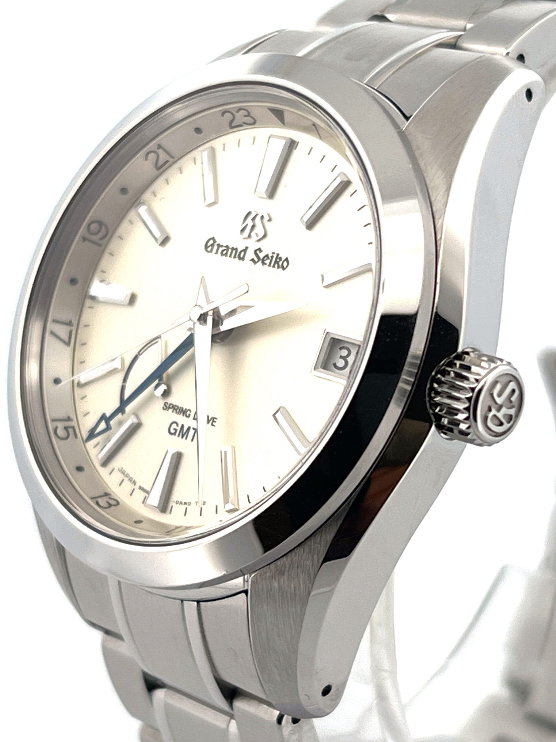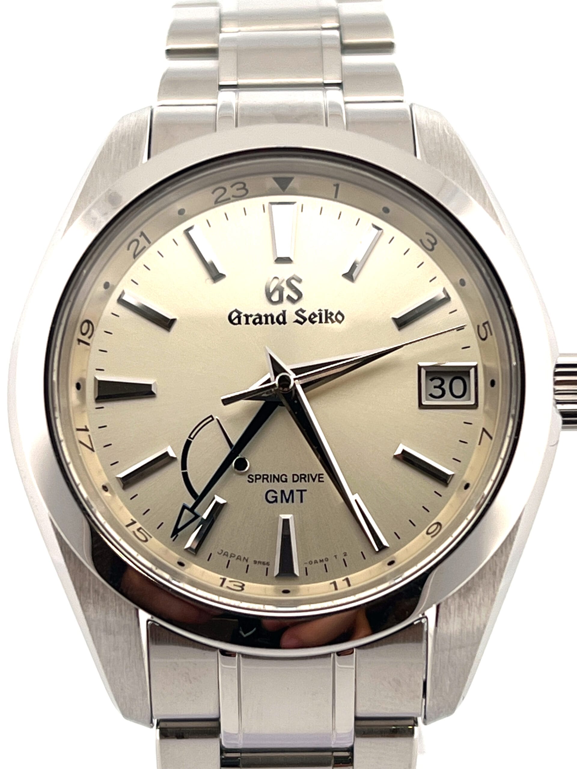 The dial is the SBGE205’s highlight — a subtle champagne-hued surface with a silky texture that shifts beautifully under the light. The blued-steel GMT hand, polished dauphine hour and minute hands, applied indices, and discreet power-reserve indicator all sit beneath a dual-curved sapphire crystal with anti-reflective coating, showcasing Grand Seiko’s hallmark attention to detail.