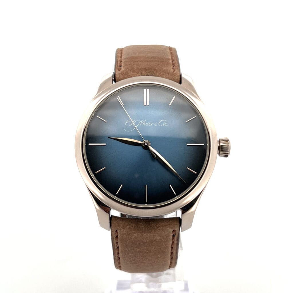The H. Moser & Cie. Endeavour Centre Seconds (ref. 1200-0201) is a distinguished timepiece that exemplifies the brand’s commitment to minimalist design and horological excellence. Housed in a 40mm white gold case, it features the captivating ‘Funky Blue’ fumé dial, renowned for its gradient effect that transitions from a vibrant center to darker edges. This dial is complemented by sleek leaf-shaped hands and appliqué indices, offering a clean and elegant aesthetic. At its heart lies the in-house automatic HMC 200 movement, which provides a robust 72-hour power reserve and is visible through the sapphire crystal case back. The watch is paired with a hand-stitched kudu leather strap, enhancing its sophisticated appeal.
