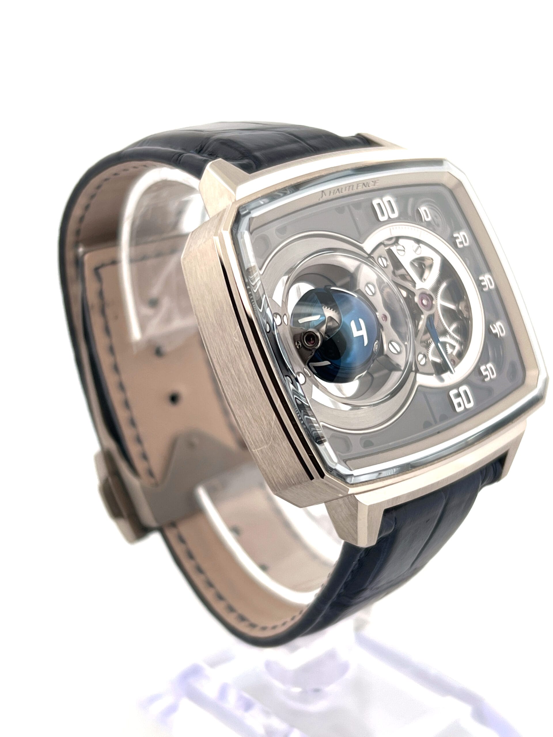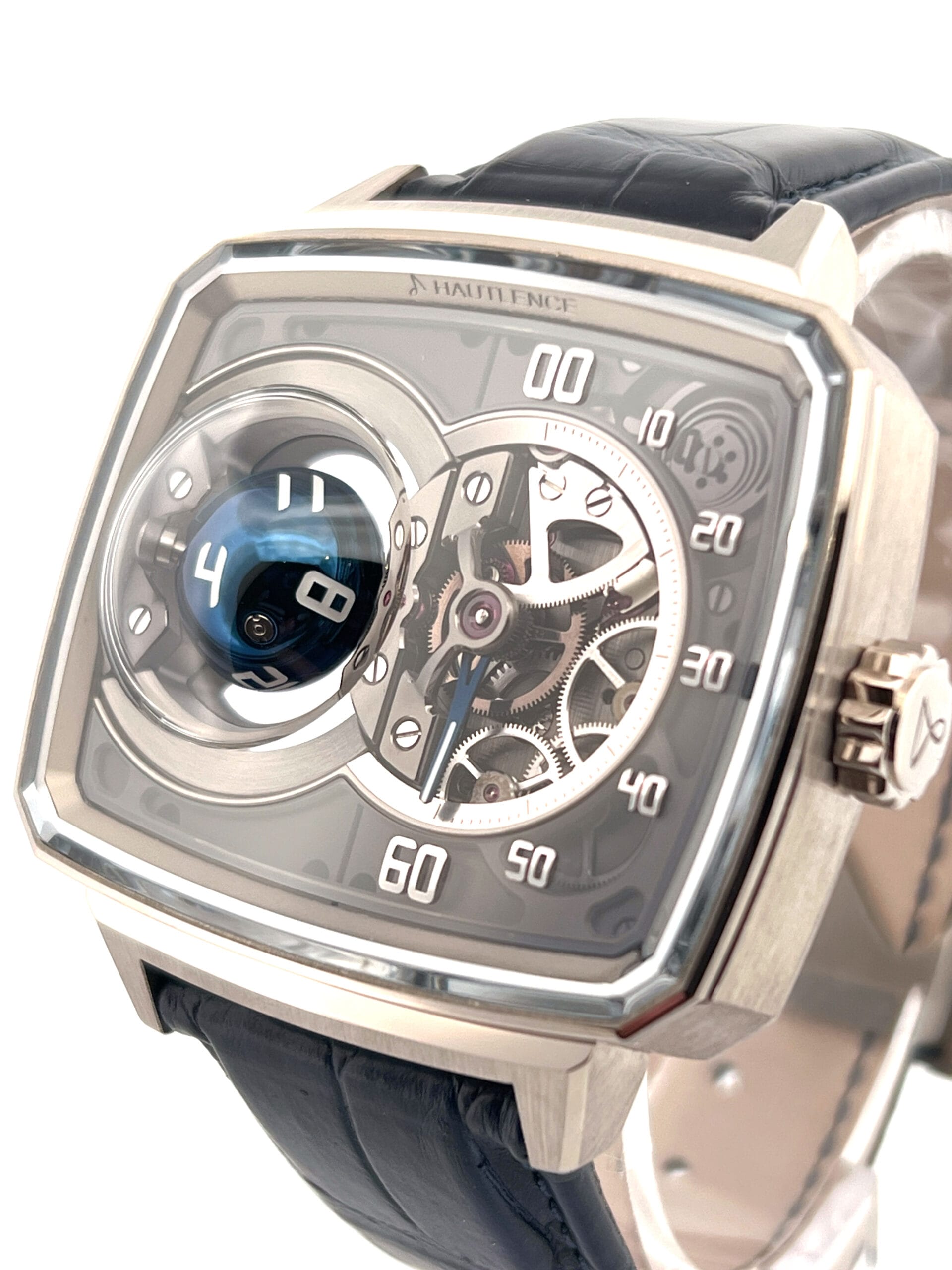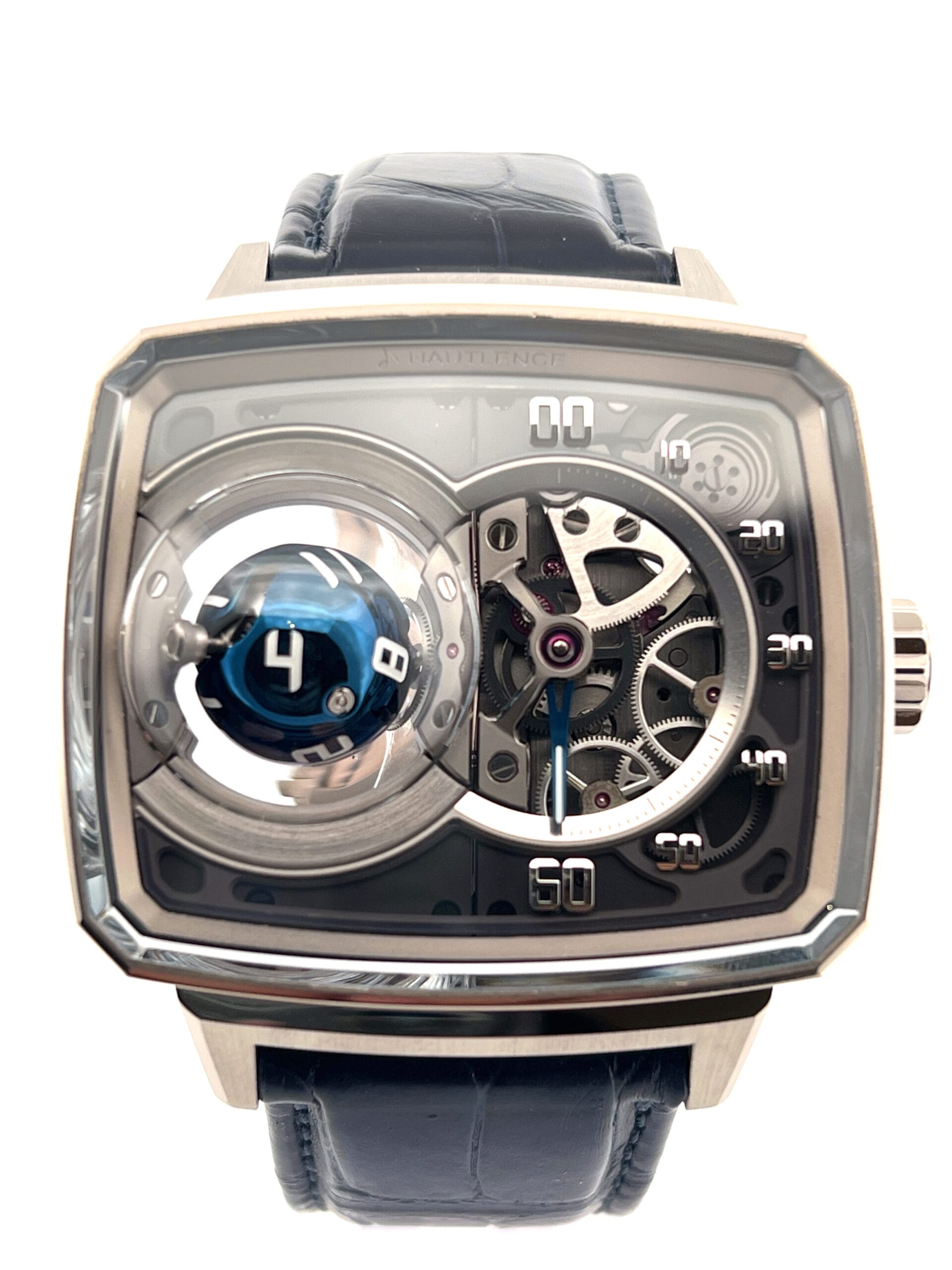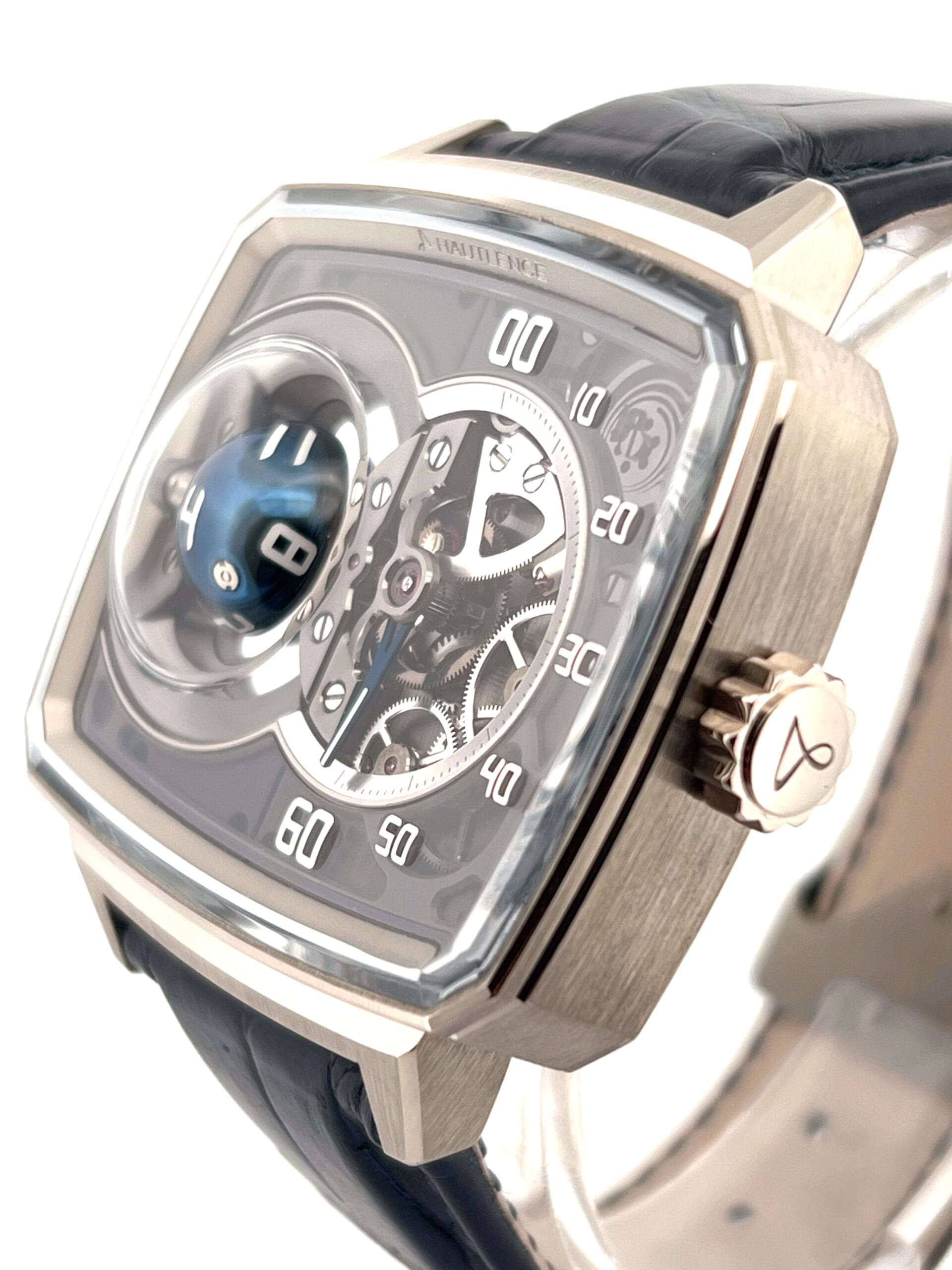In 2023, Hautlence once again redefined the boundaries of mechanical watchmaking with the launch of the Sphere Series 1, a breathtaking limited edition of just 28 pieces that transforms timekeeping into kinetic sculpture. Encased in the brand’s signature TV-shaped stainless steel case, the watch immediately commands attention—not with traditional complications, but with an avant-garde display that appears to defy logic. On the left side of the dial, a blue PVD-coated titanium sphere floats as if suspended in space, its white Super‑LumiNova numerals rotating on three axes every hour to reveal the correct hour with mesmerizing precision. This seemingly magical movement is no trick; it is powered by an intricate system of conical gears and crossed spindles, engineered to execute the sphere’s hypnotic pirouette with mathematical accuracy.