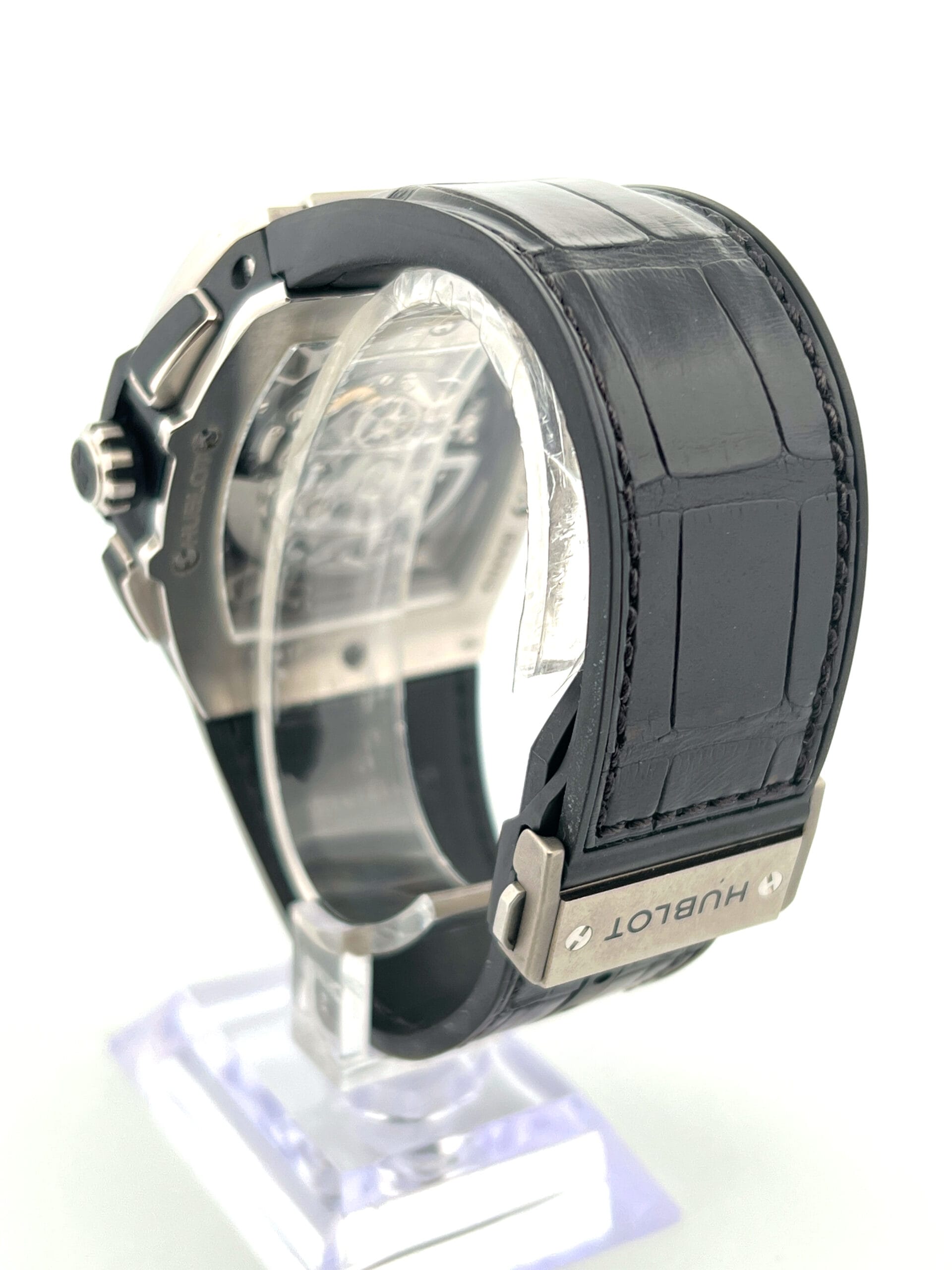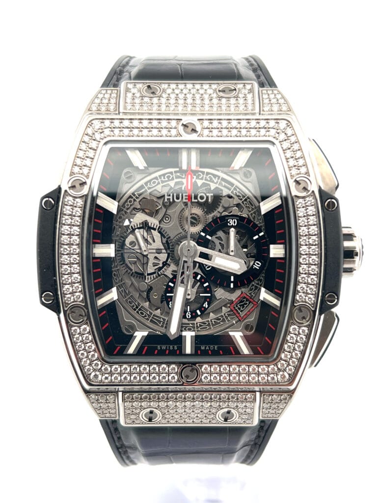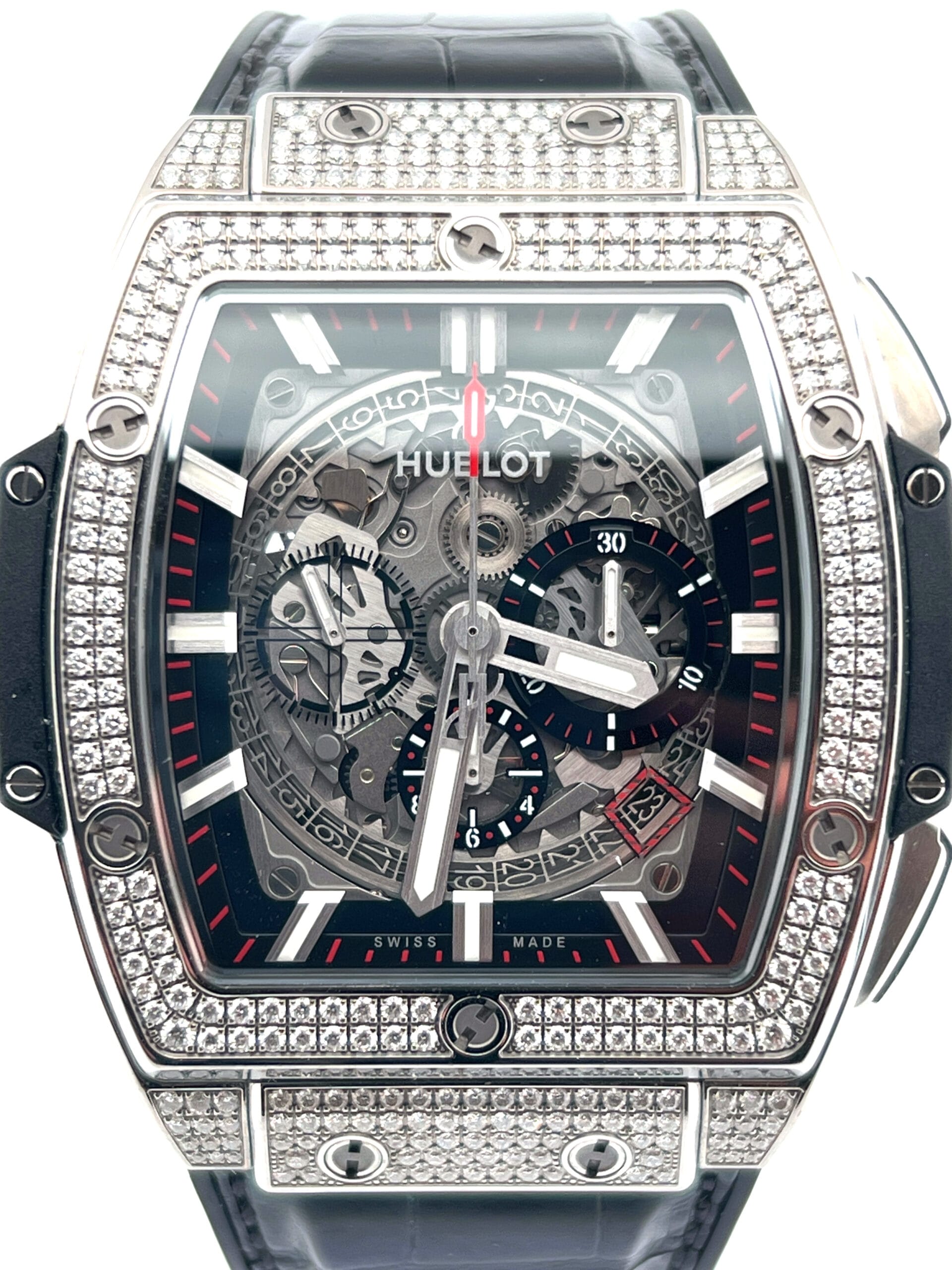 This model comes in a 45mm tonneau-shaped titanium case with a diamond-set bezel, giving it a strong modern profile without losing the signature Hublot identity. Inside, it runs the HUB4700 automatic skeleton chronograph movement — and this is important — it is originally based on the legendary El Primero calibre. That heritage gives the watch high-beat performance, proven reliability, and a direct link to one of the most iconic chronograph movements ever made. The skeleton dial shows off the movement architecture, while the luminescent hands and indices keep it practical and easy to read. It’s water-resistant to 100 meters and comes paired with a comfortable black alligator-rubber strap.