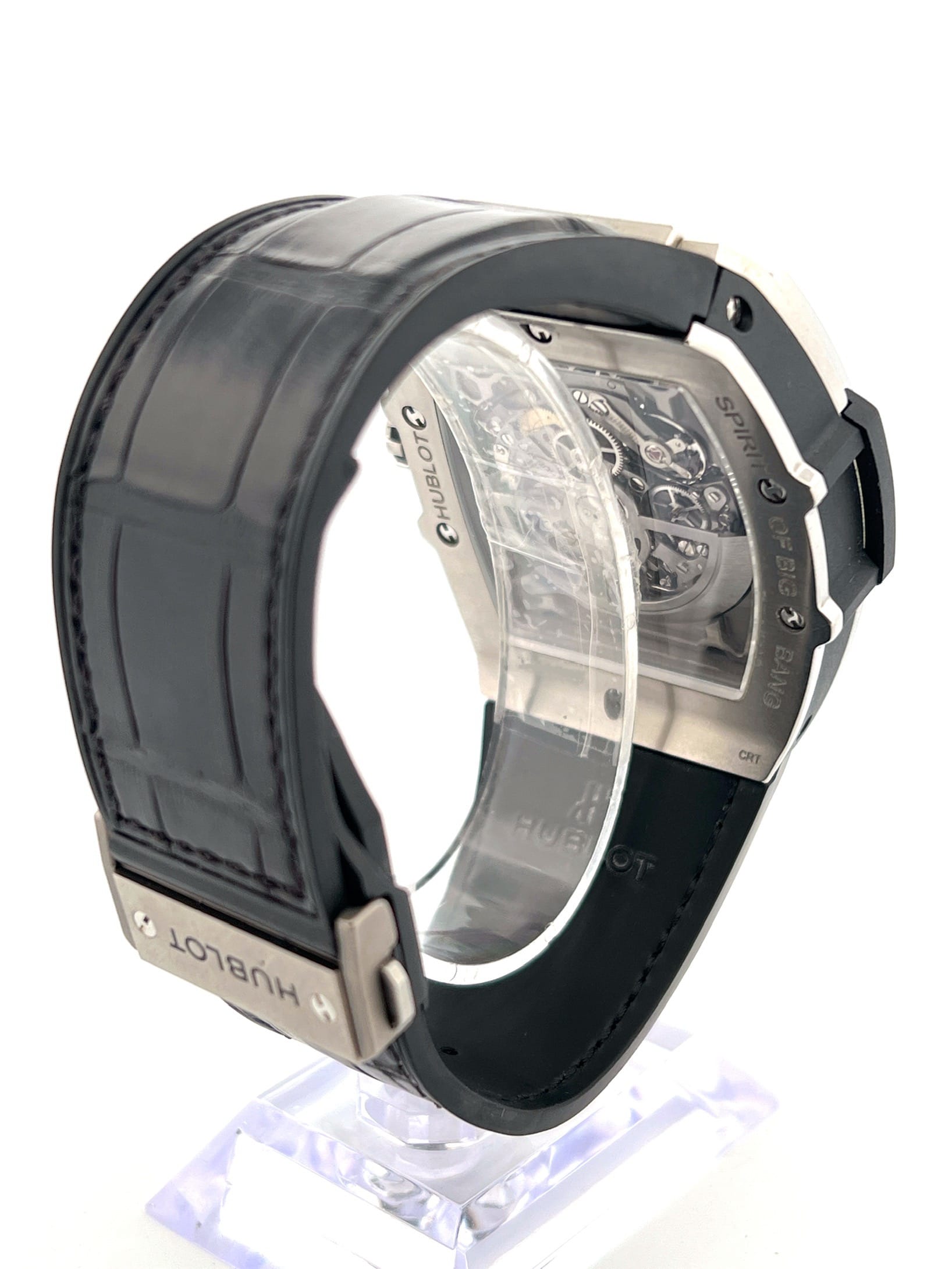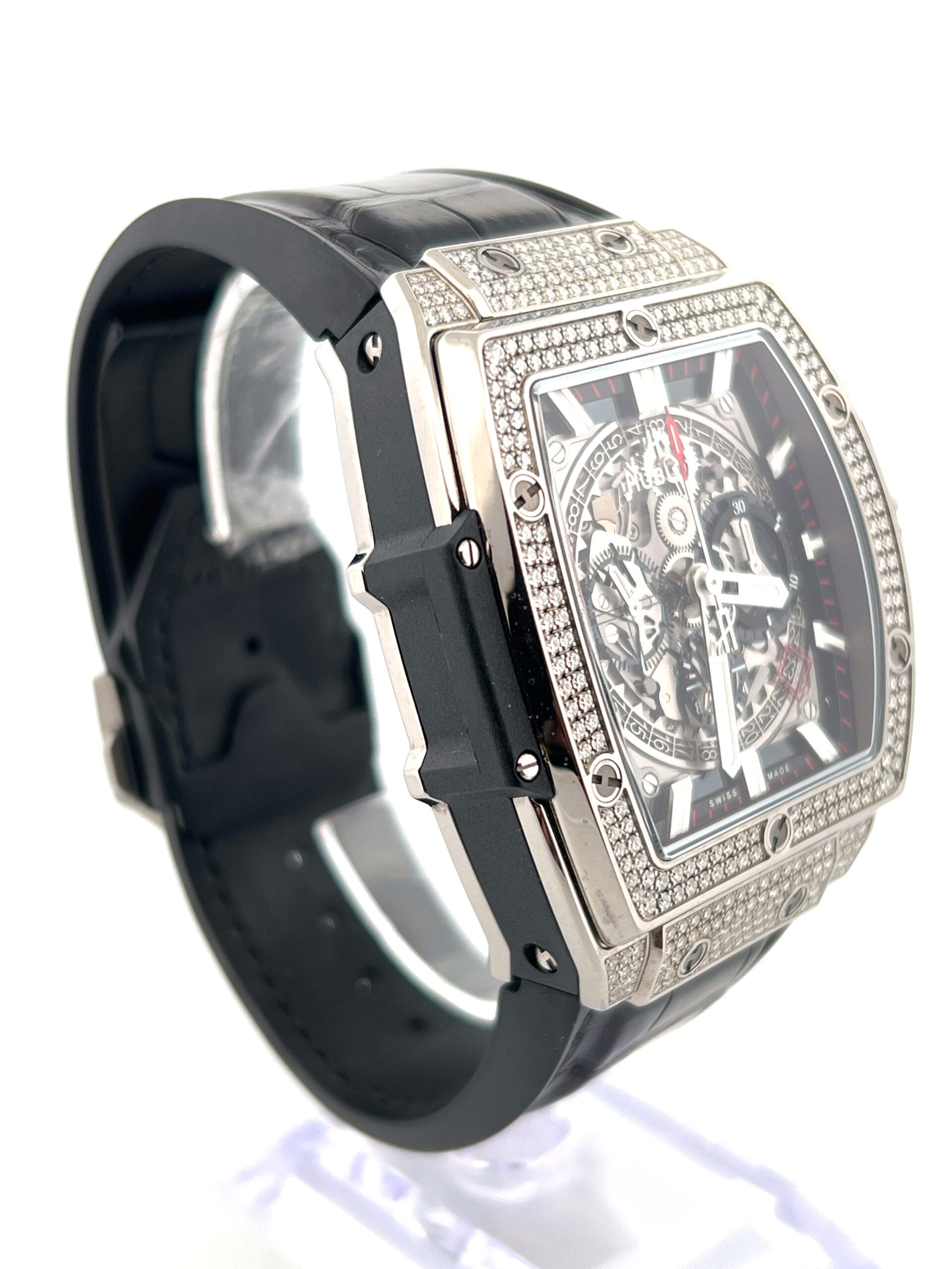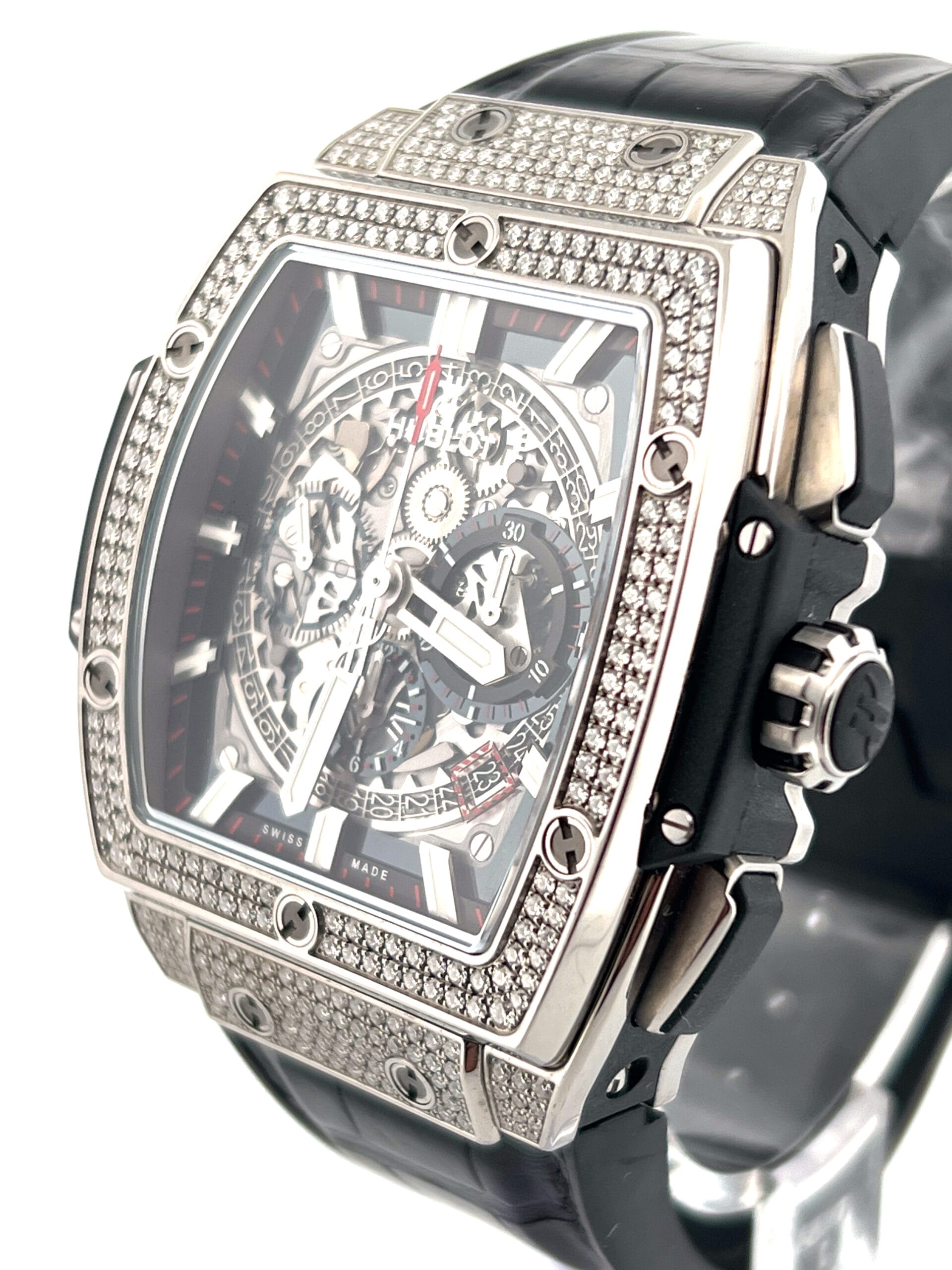 A few interesting facts: the Spirit of Big Bang line was introduced in 2014 as a reinterpretation of Hublot’s design language in a curved tonneau case, giving the brand a new silhouette while keeping its “Art of Fusion” identity. This particular combination of titanium, diamonds, and a skeletonized El Primero-derived movement is a perfect example of Hublot blending modern materials with mechanical heritage.