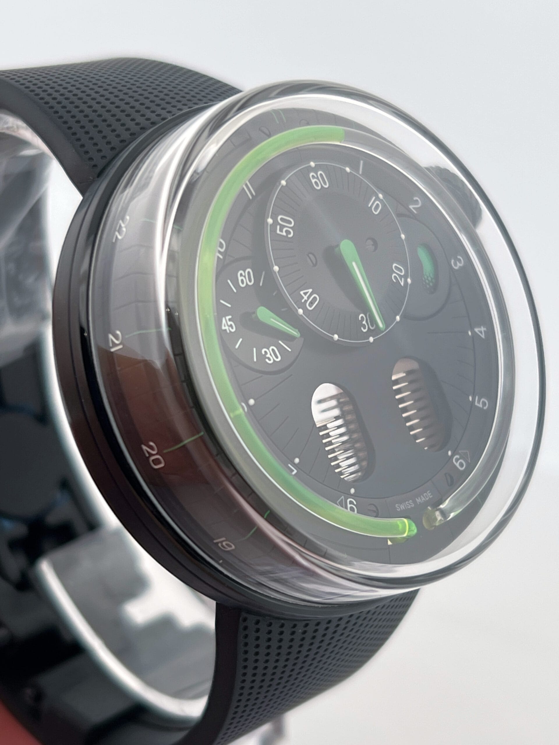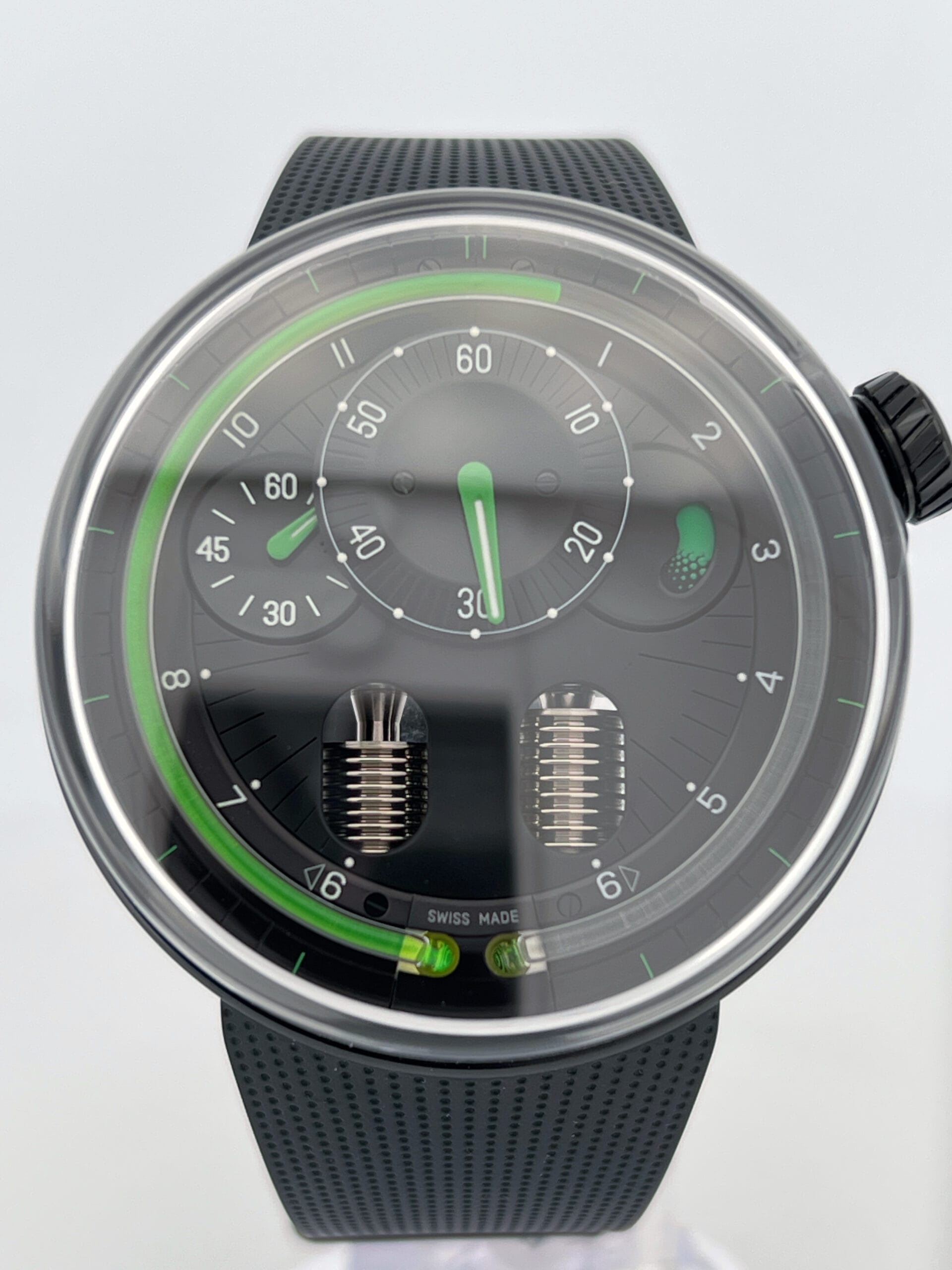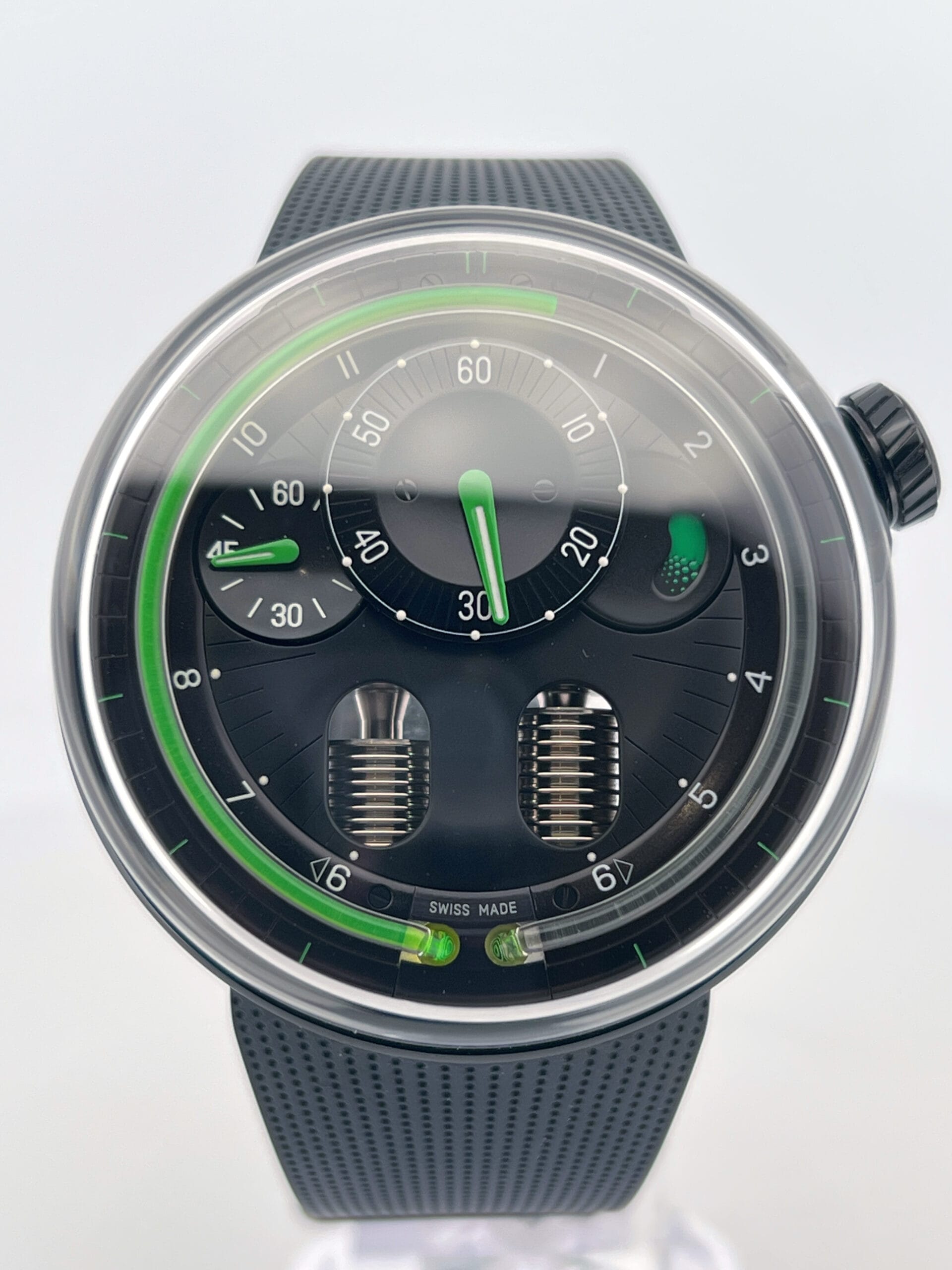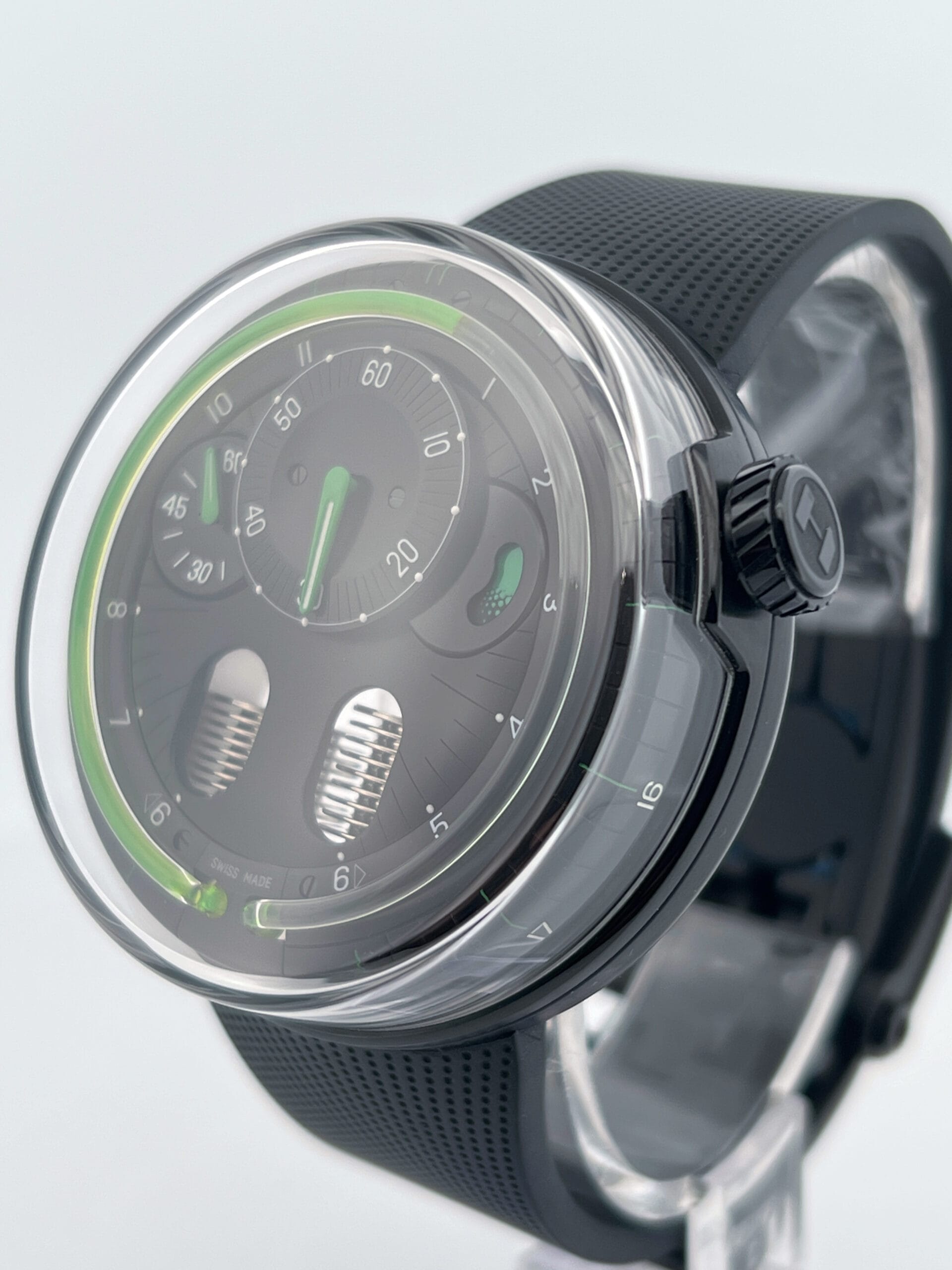 The hours flow continuously, advancing until a mechanical retrograde action returns the green liquid to its origin each day. Minute and power reserve indicators are kept cleanly minimal—Green-tipped hands and subtle Super-LumiNova markings float over a matte black dial, maintaining visual contrast without distraction. There’s no dial as such—just space, light, shadow, and the hypnotic arc of the green meniscus telling the story of time’s passage. With no traditional indexes or subdials to dominate the scene, the H0 Black Fluid invites the wearer into a meditative relationship with time—fluid, flowing, and alive.