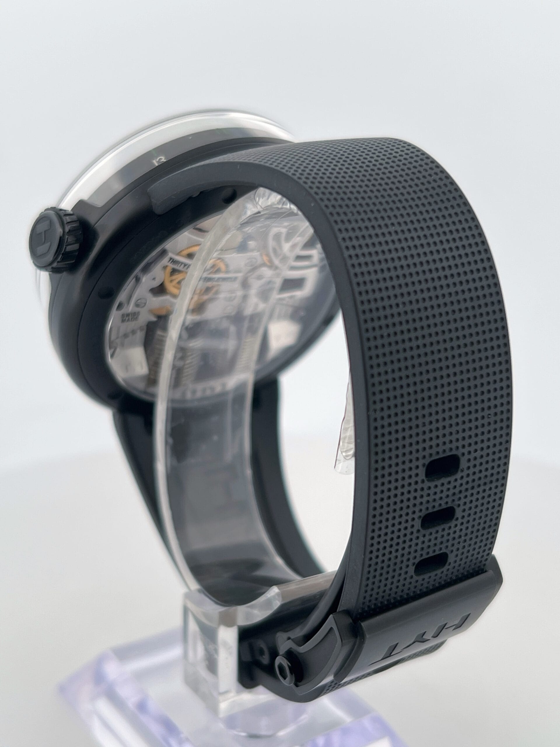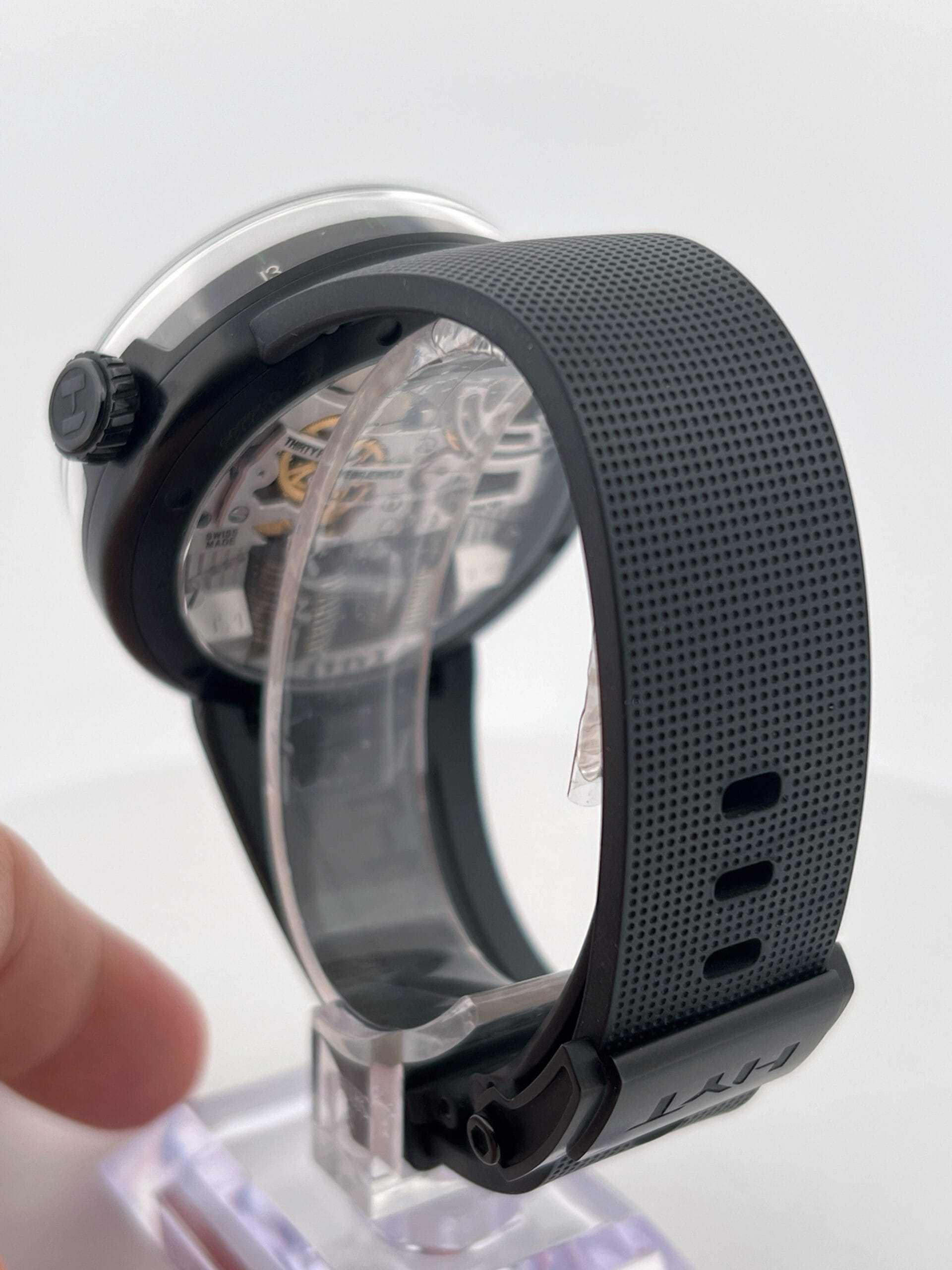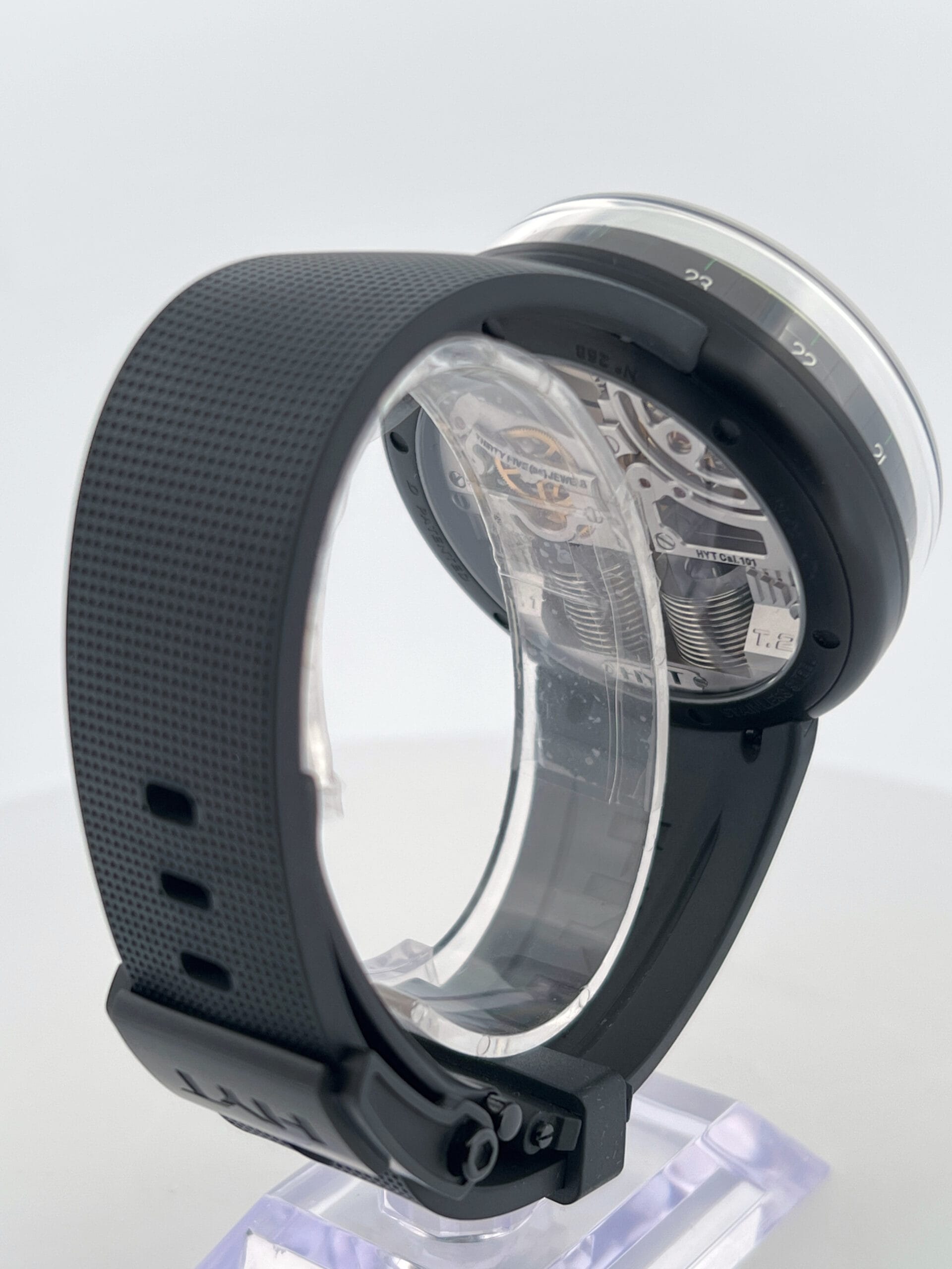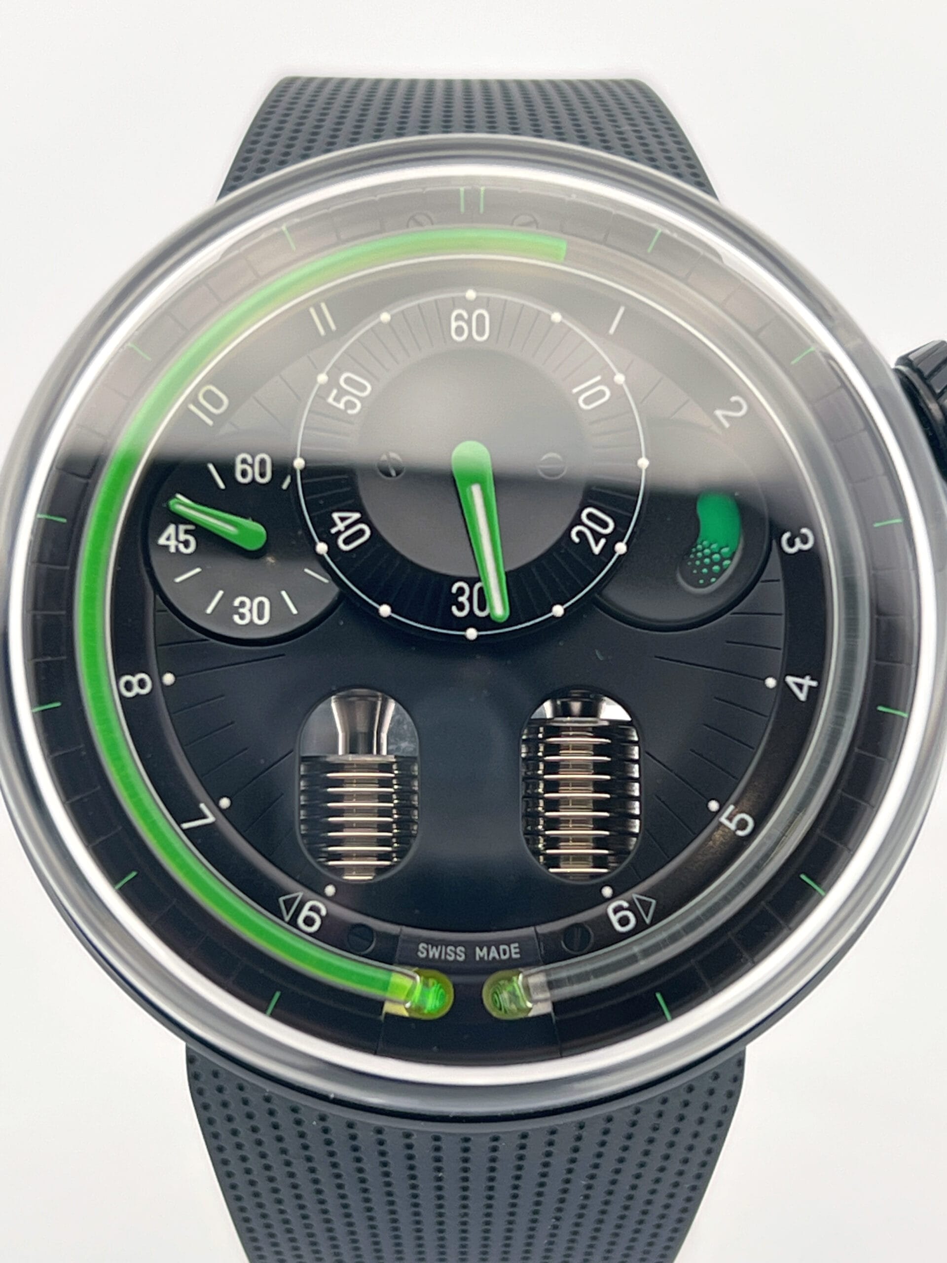 The hours flow continuously, advancing until a mechanical retrograde action returns the green liquid to its origin each day. Minute and power reserve indicators are kept cleanly minimal—Green-tipped hands and subtle Super-LumiNova markings float over a matte black dial, maintaining visual contrast without distraction. There’s no dial as such—just space, light, shadow, and the hypnotic arc of the green meniscus telling the story of time’s passage. With no traditional indexes or subdials to dominate the scene, the H0 Black Fluid invites the wearer into a meditative relationship with time—fluid, flowing, and alive.
