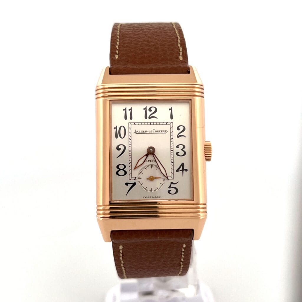 The Jaeger-LeCoultre Reverso 270.2.62 Art Deco, crafted in 18K rose gold, boasts a manual-winding movement within its 42.0 x 26.0 mm rectangular case, distinguished by reeded ends and a slender 9.5 mm thickness. Notable features include a luminous “kite” handset, a small-second sub-dial at 6 o’clock, and its iconic Art Deco skeletonized finish. The Reverso, originating in 1931 and based on the Golden Ratio, innovatively offers a reversible case, making it the first of its kind. Originally designed for polo matches, it has since become a globally recognized timepiece, adorned by renowned figures such as Charlie Chaplin, Amelia Earhart, and the Duke of Windsor
