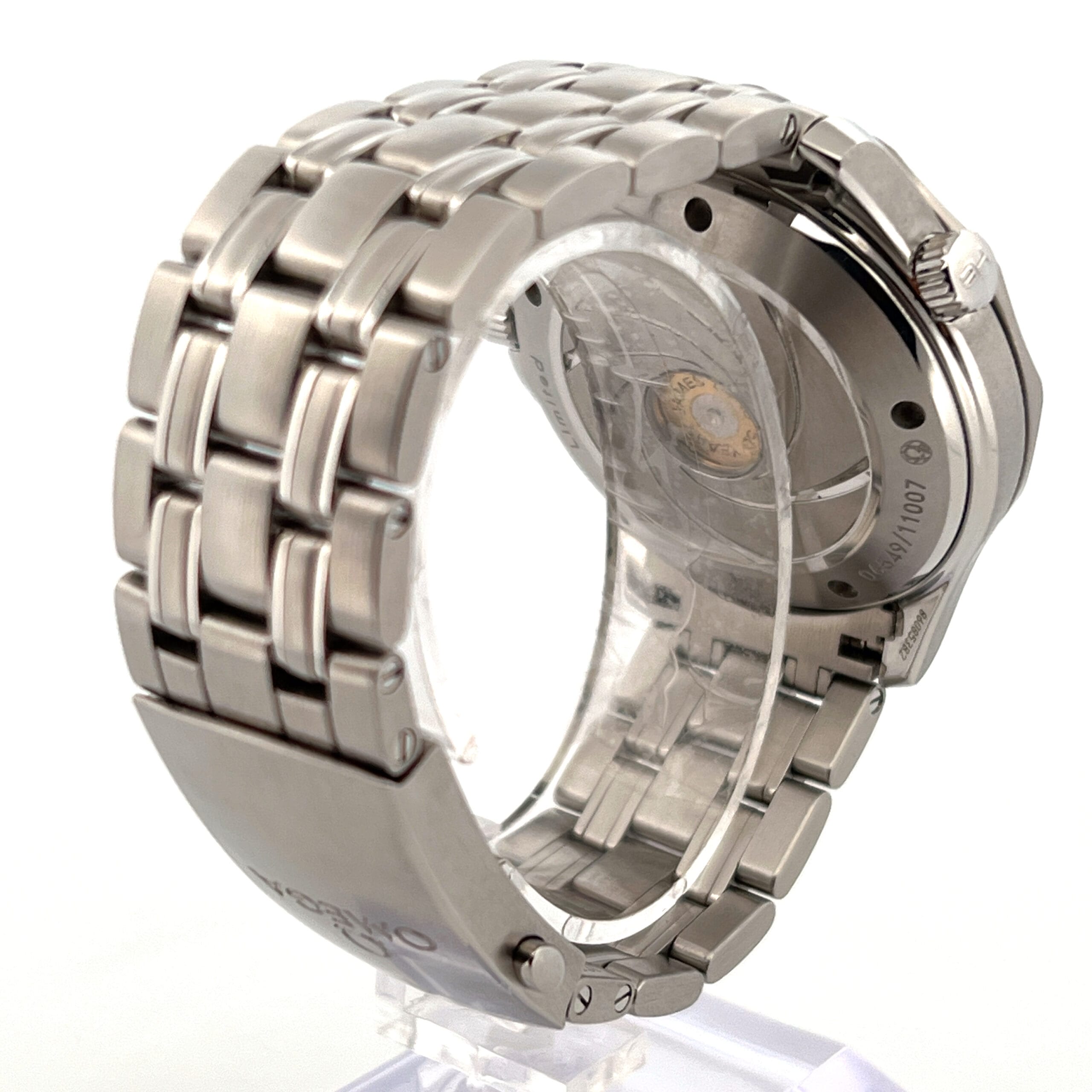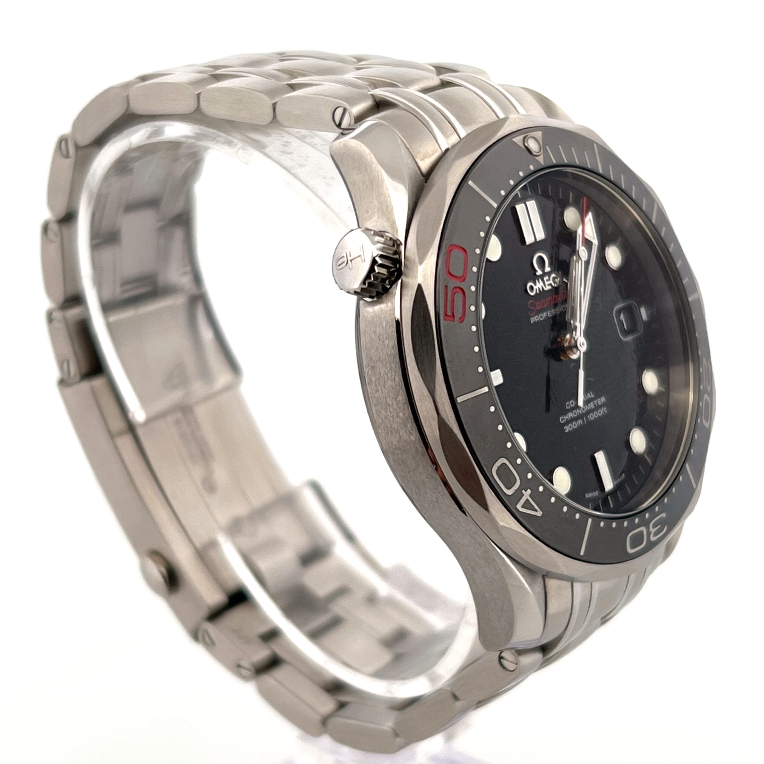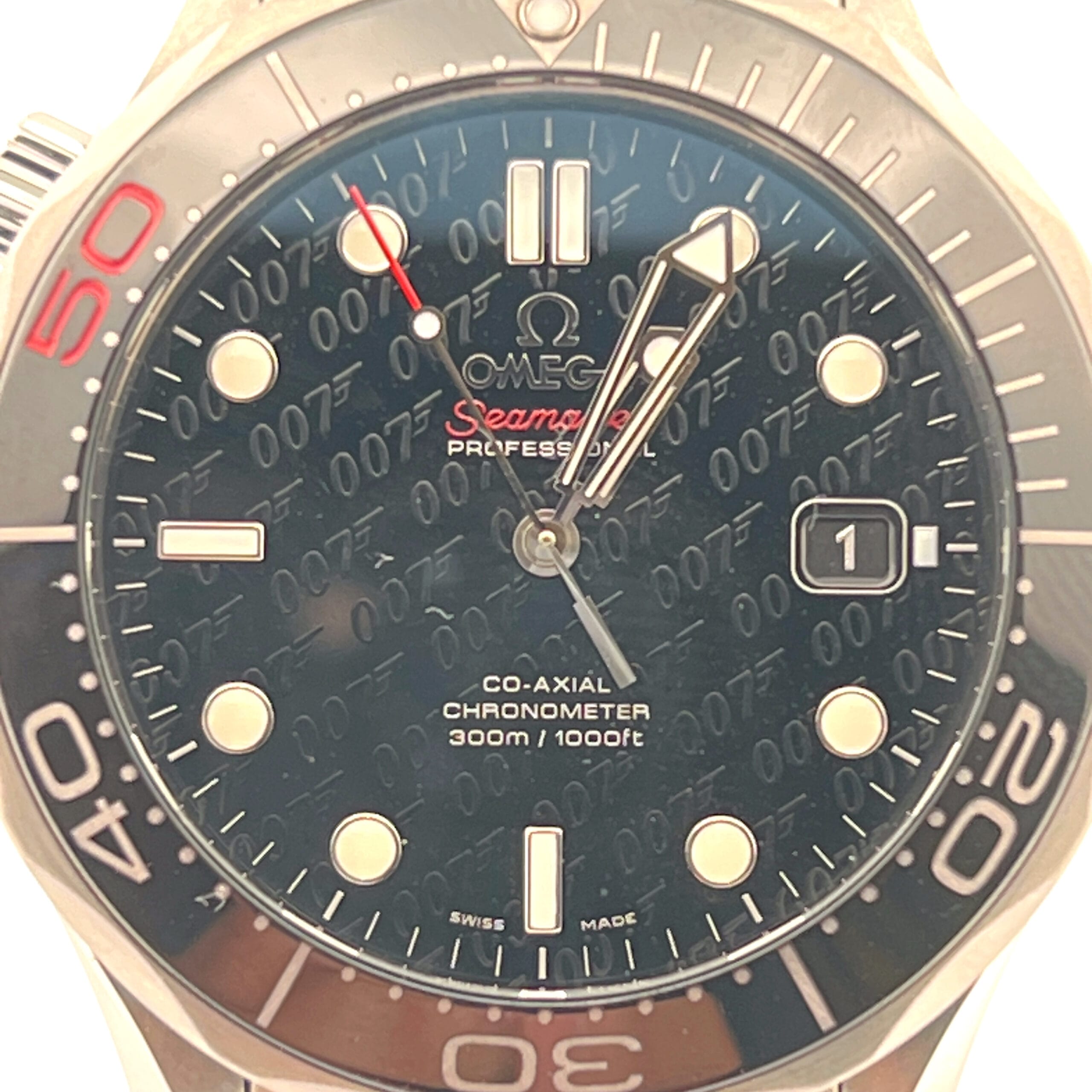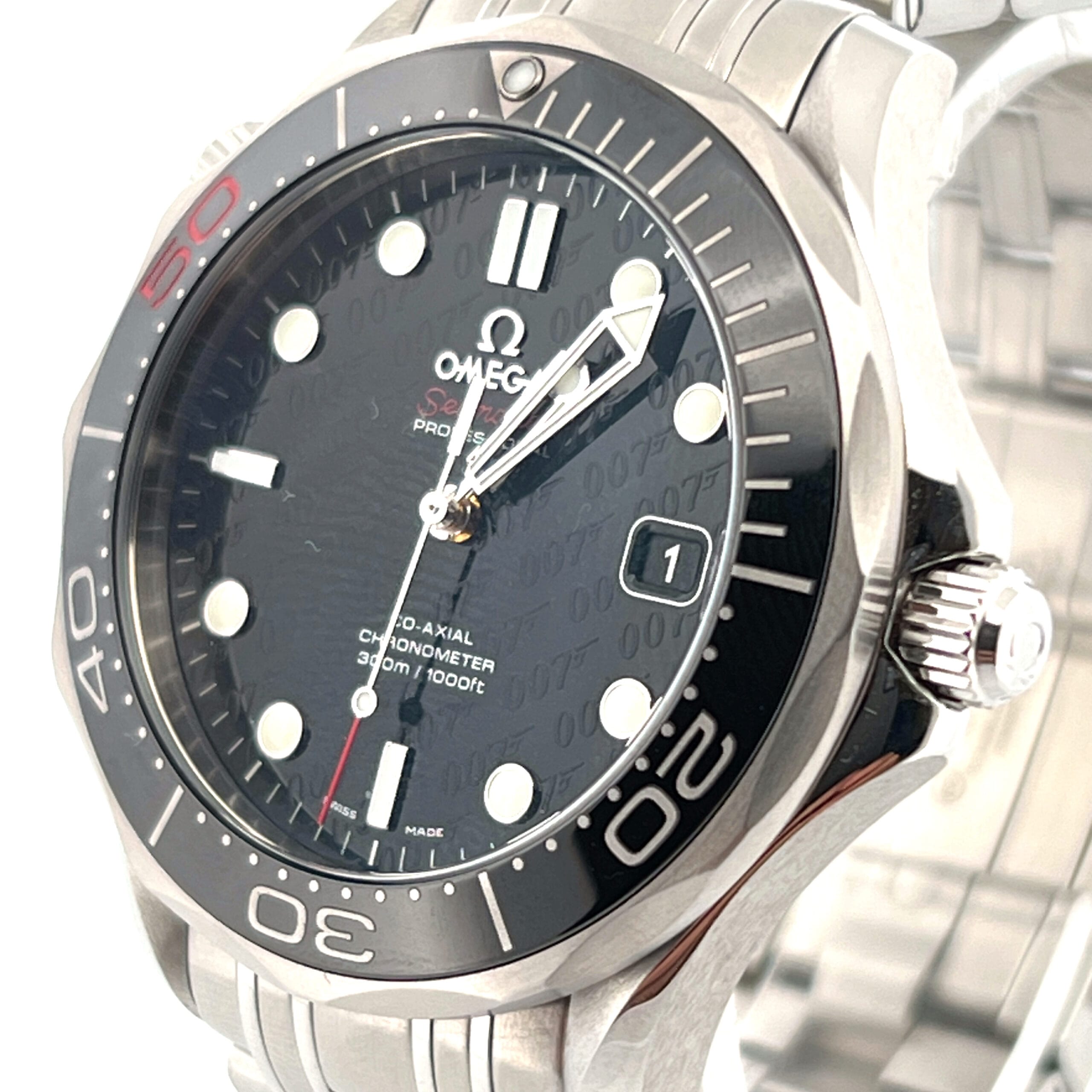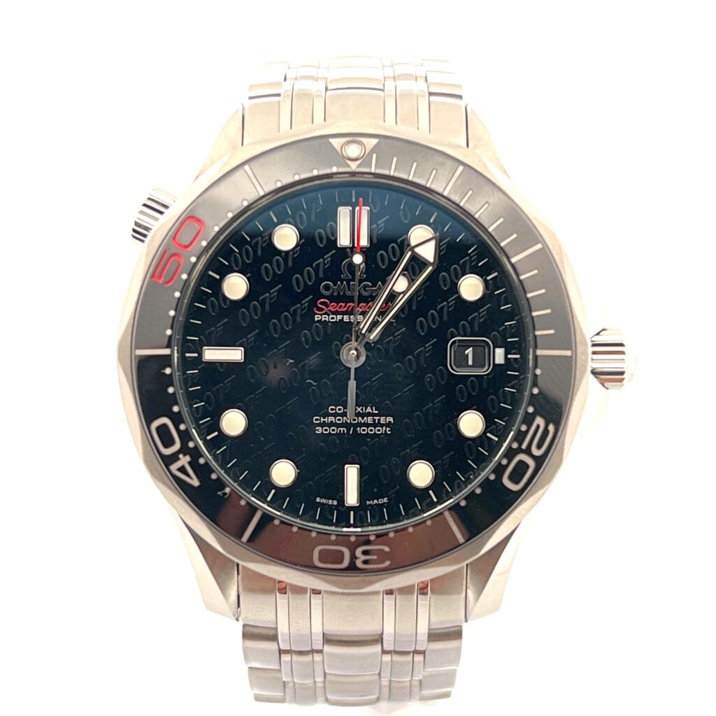 OMEGA’s sporty Seamaster collection is a tribute to the brand’s maritime legacy. This exquisite example of our renowned watchmaking pays homage to OMEGA’s dive watch heritage and our adventurous pioneering spirit. This Seamaster Diver 300M commemorates 50 years of James Bond. It features a black dial decorated with the James Bond 007 logo in a diagonal pattern and a date window at the 3 o’clock position. The distinctive dial is visible through a scratch-resistant sapphire crystal. The black ceramic unidirectional rotating bezel is mounted on a 41 mm stainless steel case with a helium-escape valve at 10 o’clock. The watch is presented on a stainless steel bracelet. The unique caseback is stamped with a gun-barrel design with a “bullet” decoration on the rotor. This certified chronometer is powered by the Co-Axial calibre 2507.