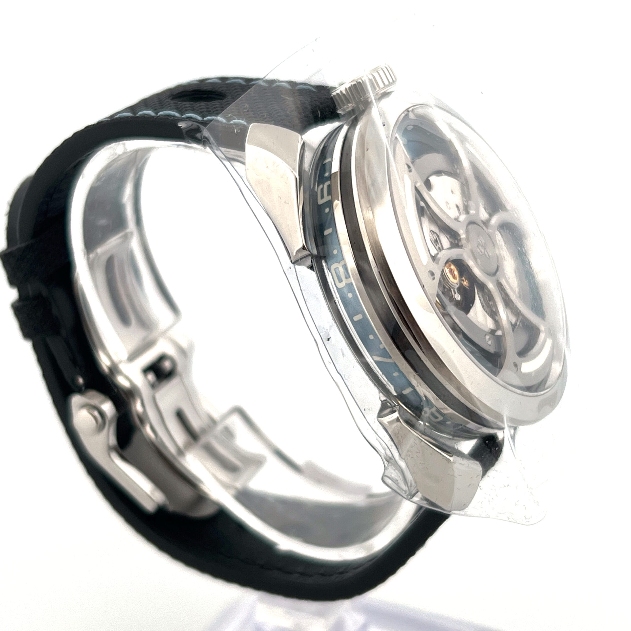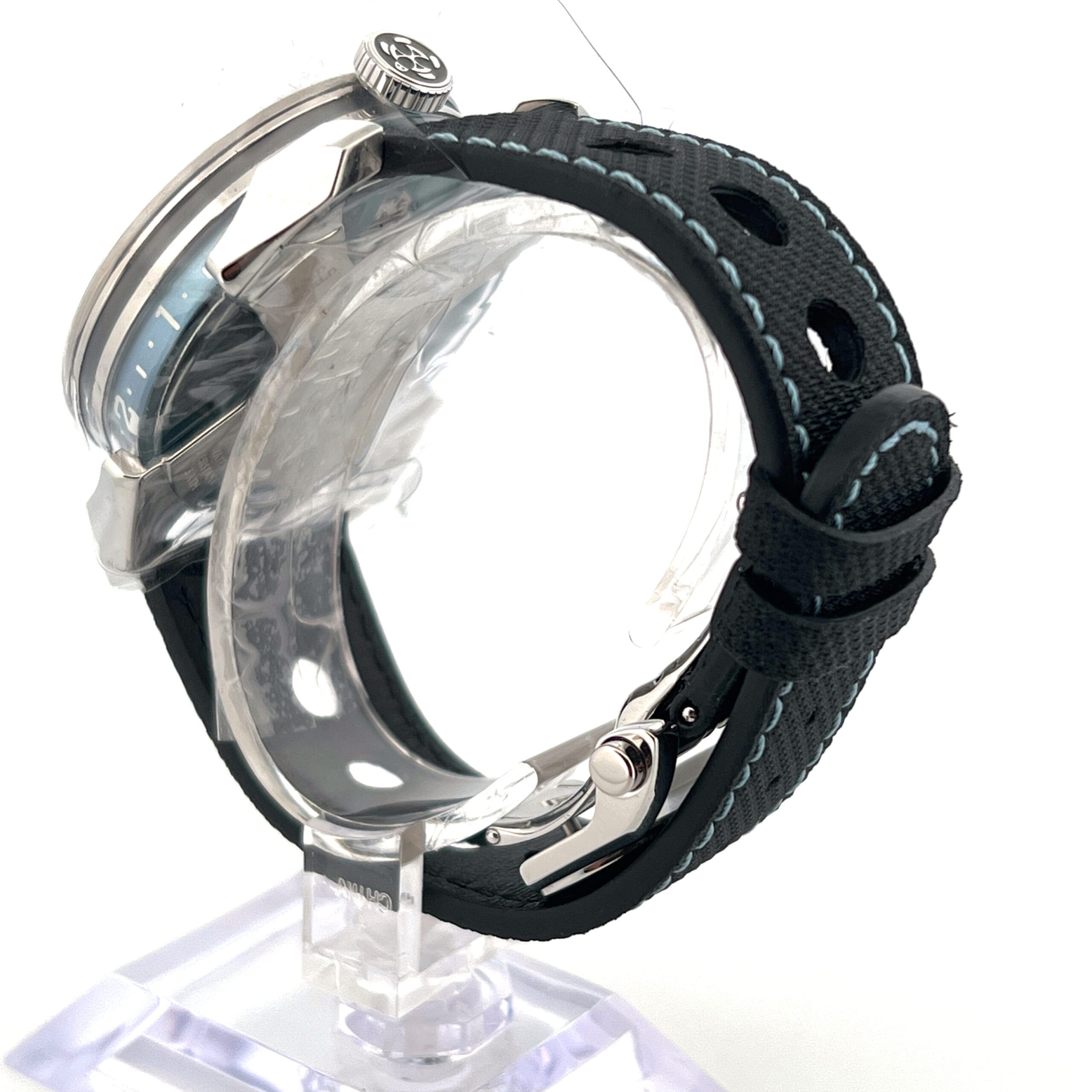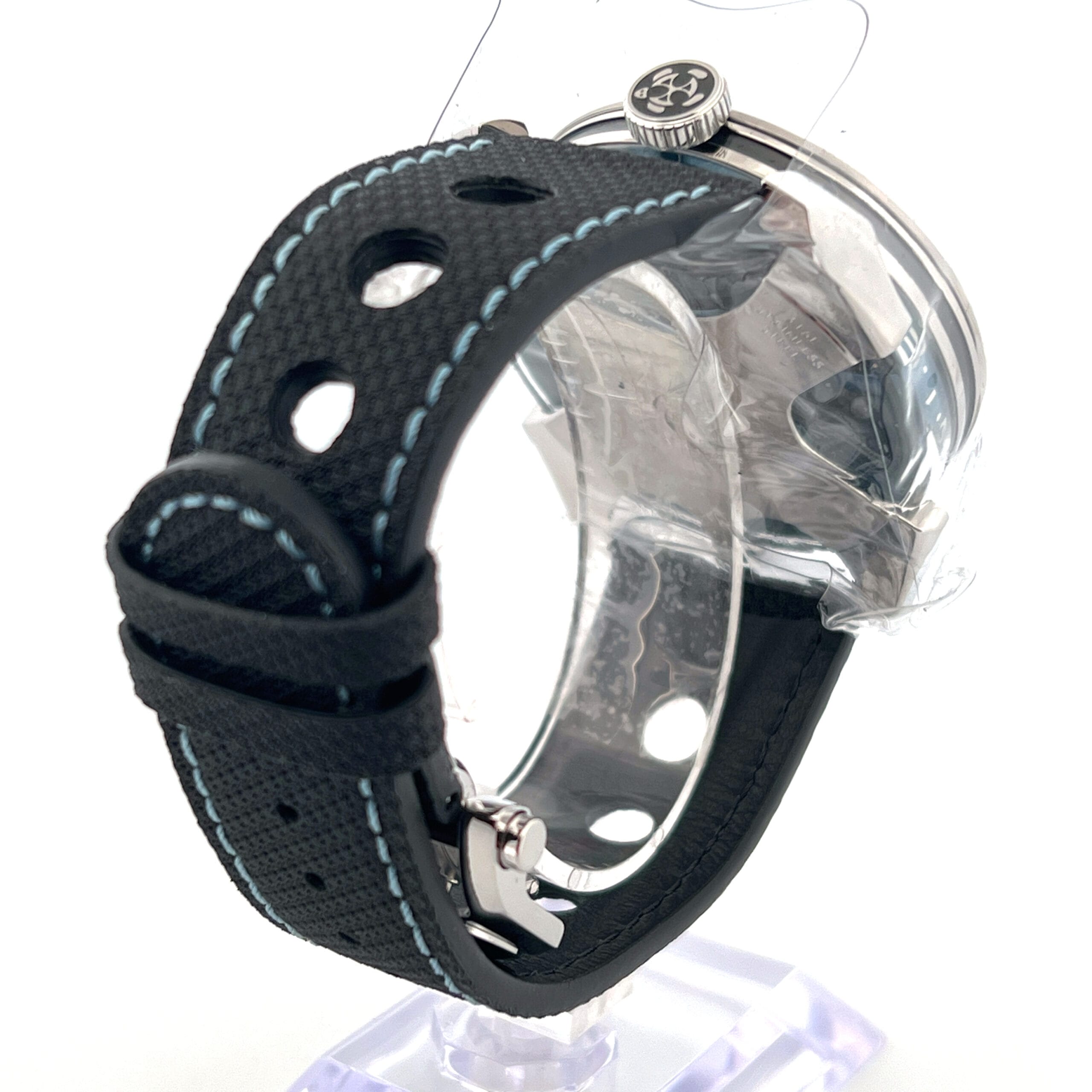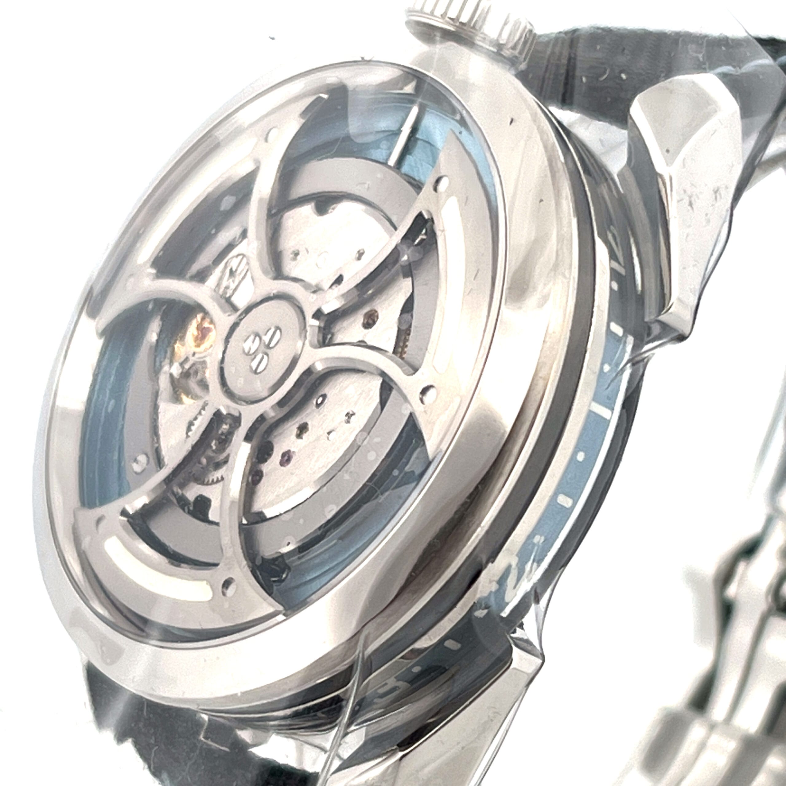 The MB&F M.A.D.1S Blue is a bold evolution of independent watchmaking—now sleeker and more refined. The 42mm stainless steel case retains its futuristic silhouette but is notably slimmer at 15mm, enhancing comfort without losing its distinctive presence. The centerpiece remains the mesmerizing inverted titanium and tungsten rotor, now finished in a captivating ice blue that spins freely beneath the domed sapphire crystal, drawing the eye with every movement.
