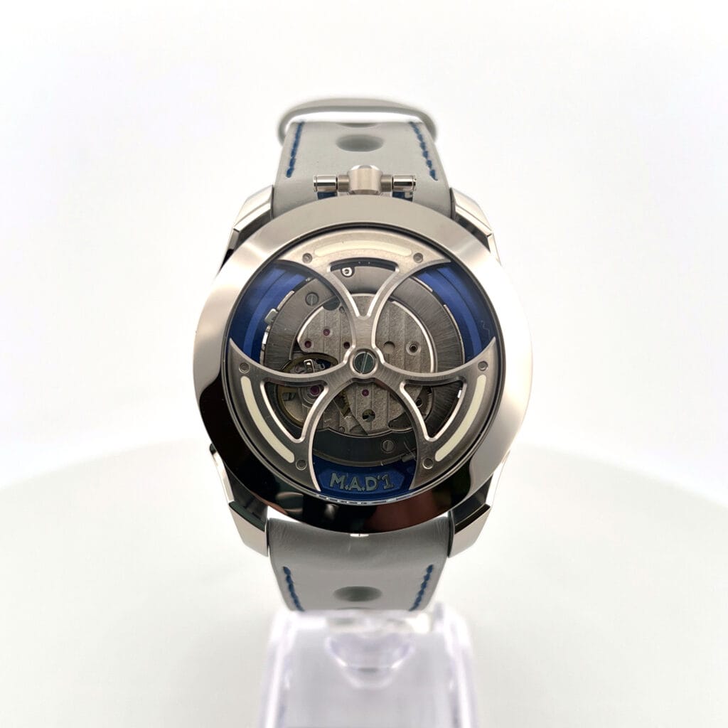 The M.A.D 1 is the debut piece from Max Büsser’s new brand: M.A.D Edition. The name, which is in reference to Max’s other project named the M.A.D Gallery, stands for Mechanical Art Devices. It is not difficult to see what Max is trying to achieve here, with the M.A.D 1. The MB&F M.A.D. 1 Blue / Edition 1 was introduced in 2021 as a limited edition of 450 pieces exclusively available / offered to friends of the brand. The MB&F M.A.D. EDITION 1 has a mineral glass cased encased in a stainless steel frame, with a sapphire crystal on top. This watch is powered by Miyota’s caliber 821A. which is inverted and adjusted for a lateral time display.