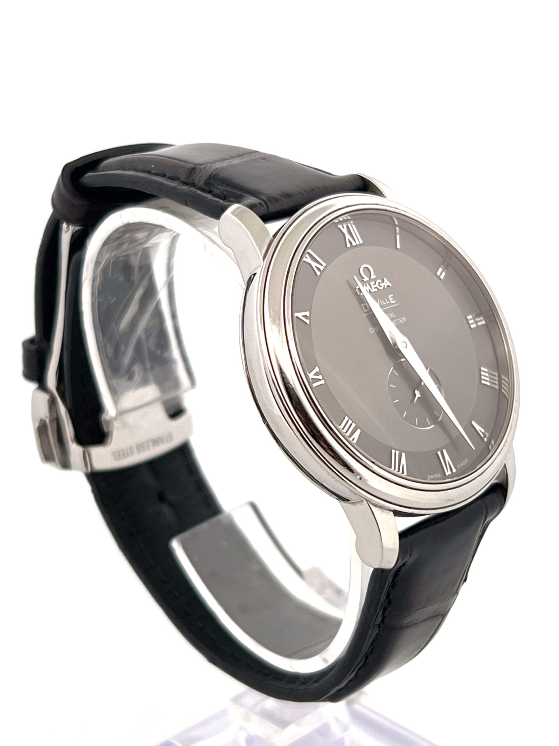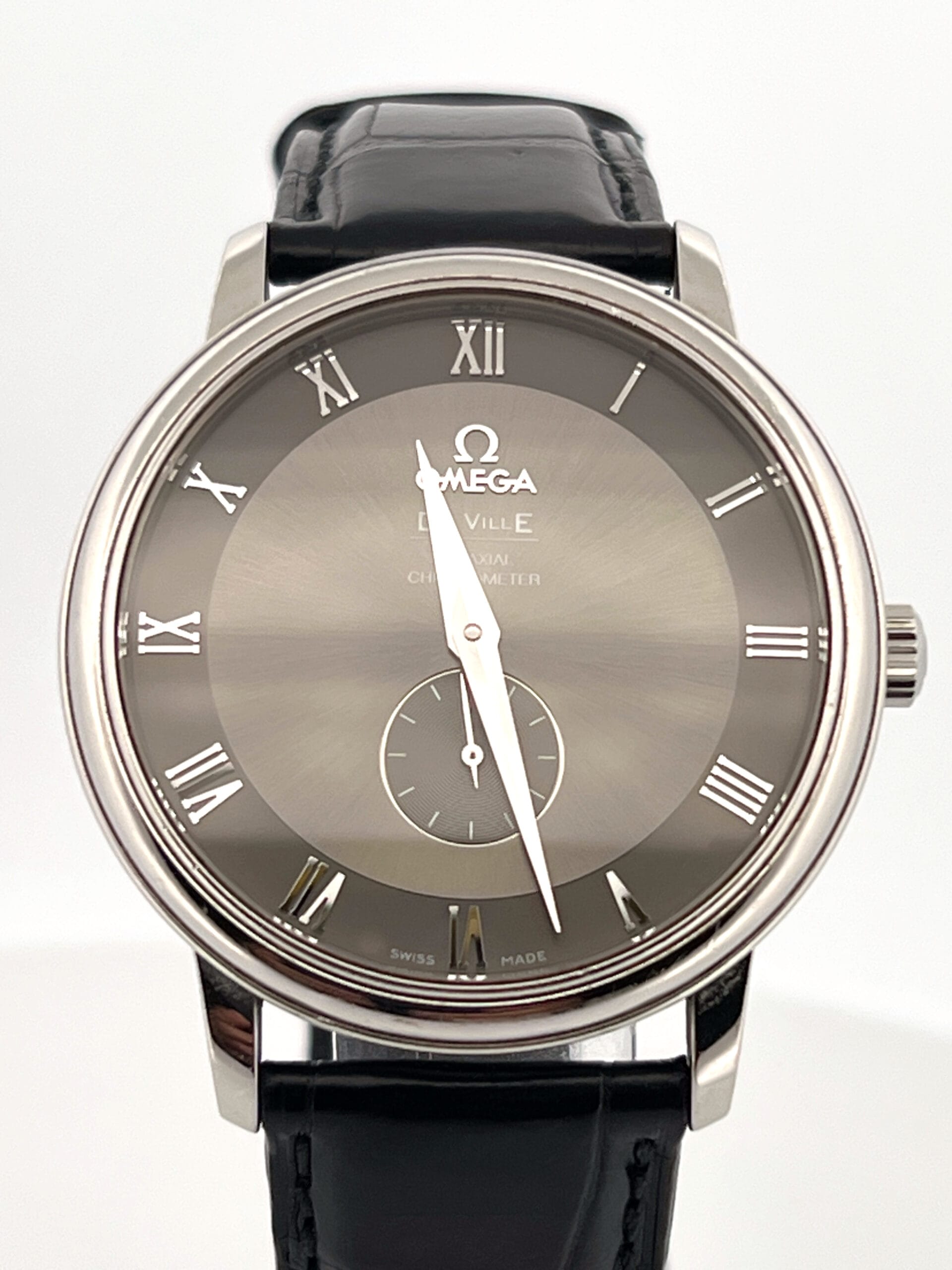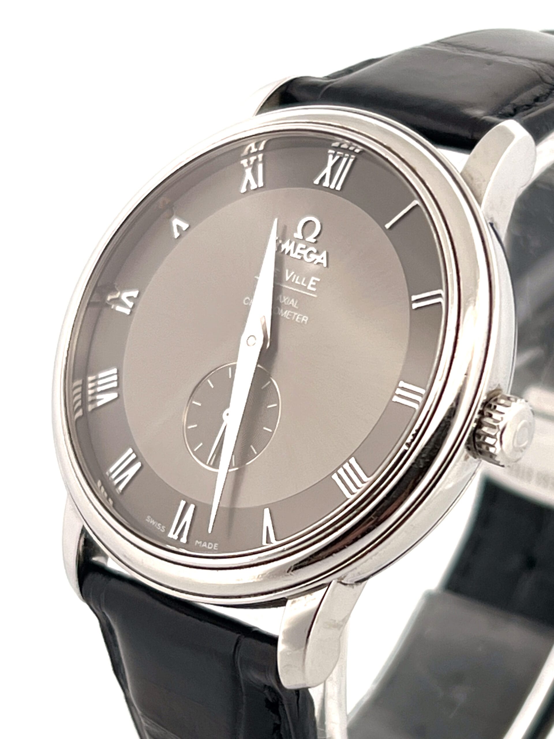 Imagine a design born from mid-century elegance, yet refined with modern mechanical innovation—that’s how the Omega De Ville Prestige Small Seconds, Ref. 4813.40.01, came to life. Omega proudly presented this watch as part of the Prestige family, a line characterized by pared-down aesthetics and timeless refinement. The model features a clean, two-zone grey dial with Roman numerals, and a petite small-seconds subdial at 6 o’clock, all framed by a gentle 39 mm stainless steel case topped with a domed sapphire crystal.
