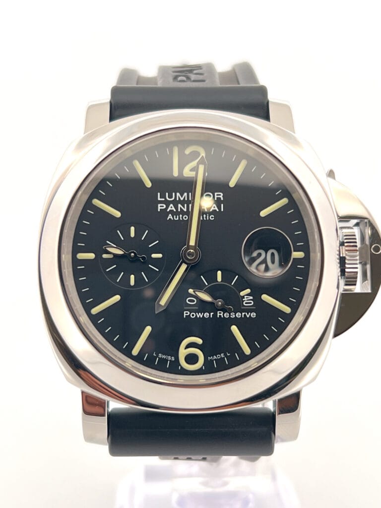 The Panerai Luminor Power Reserve PAM00090 is one of those Panerai references that instantly speaks to the brand’s identity, yet brings a layer of practicality collectors appreciate. Housed in the iconic 44 mm Luminor case with its unmistakable crown-guard bridge, the watch balances its bold military DNA with a complication rarely seen in Panerai’s early modern lineup: a power reserve indicator. Placed at 5 o’clock, it provides a quick visual of the remaining autonomy of the automatic OP IX calibre (a COSC-certified ETA-based movement), delivering a solid 42-hour power reserve. A date display at 3 o’clock with a cyclops magnifier and small seconds at 9 o’clock round out its useful features, while the sandwich dial construction and luminous markers give it unmistakable Panerai legibility even in low light.