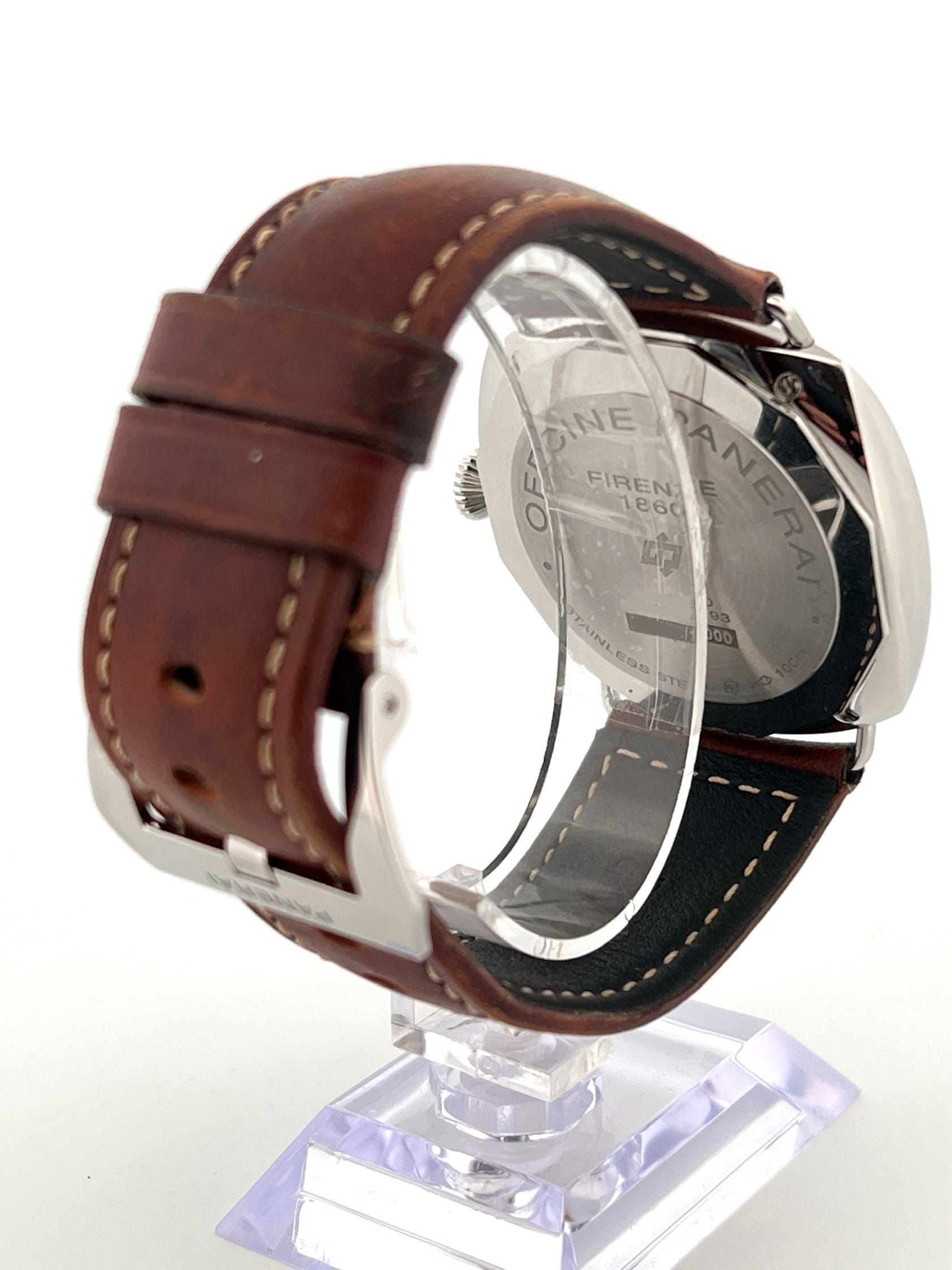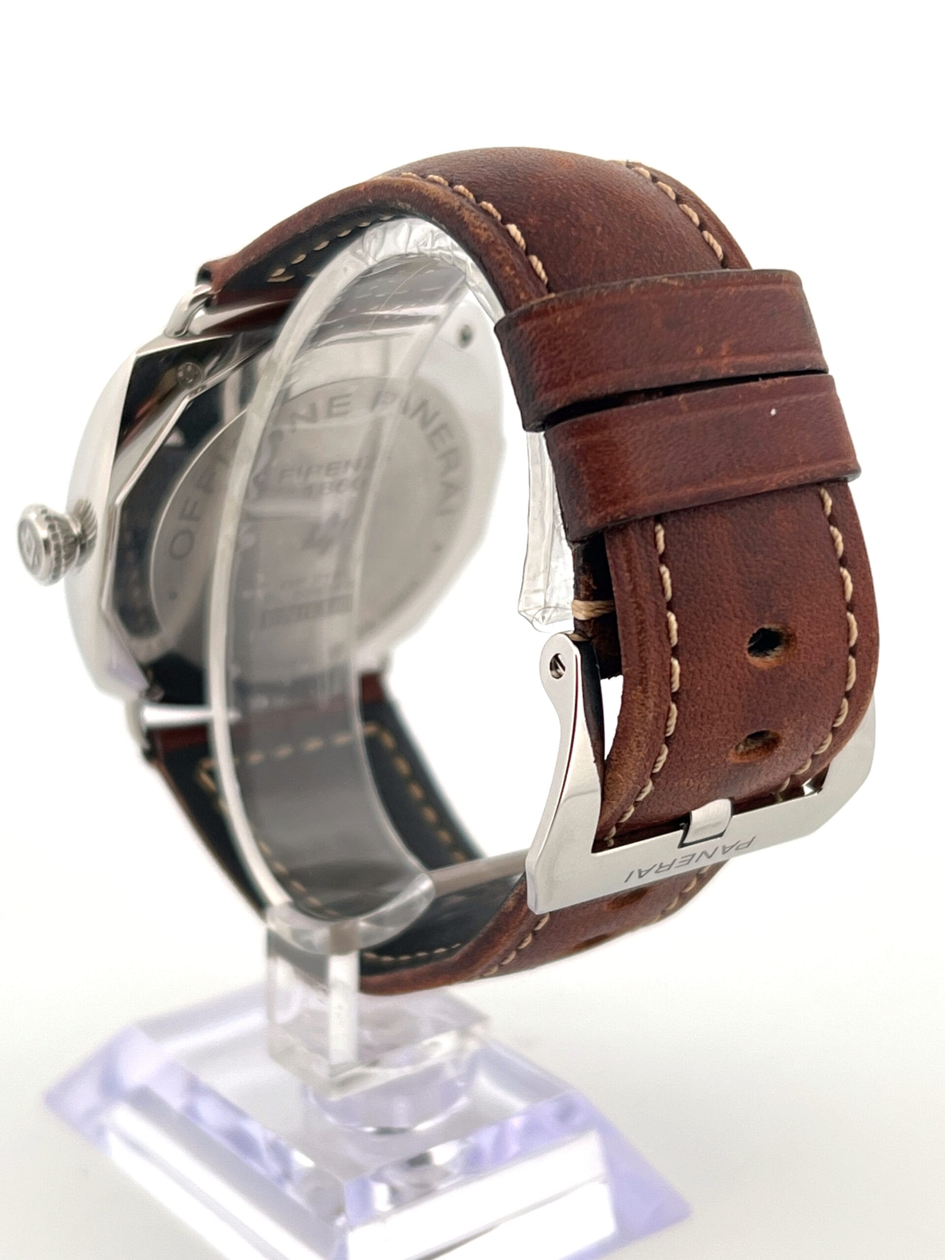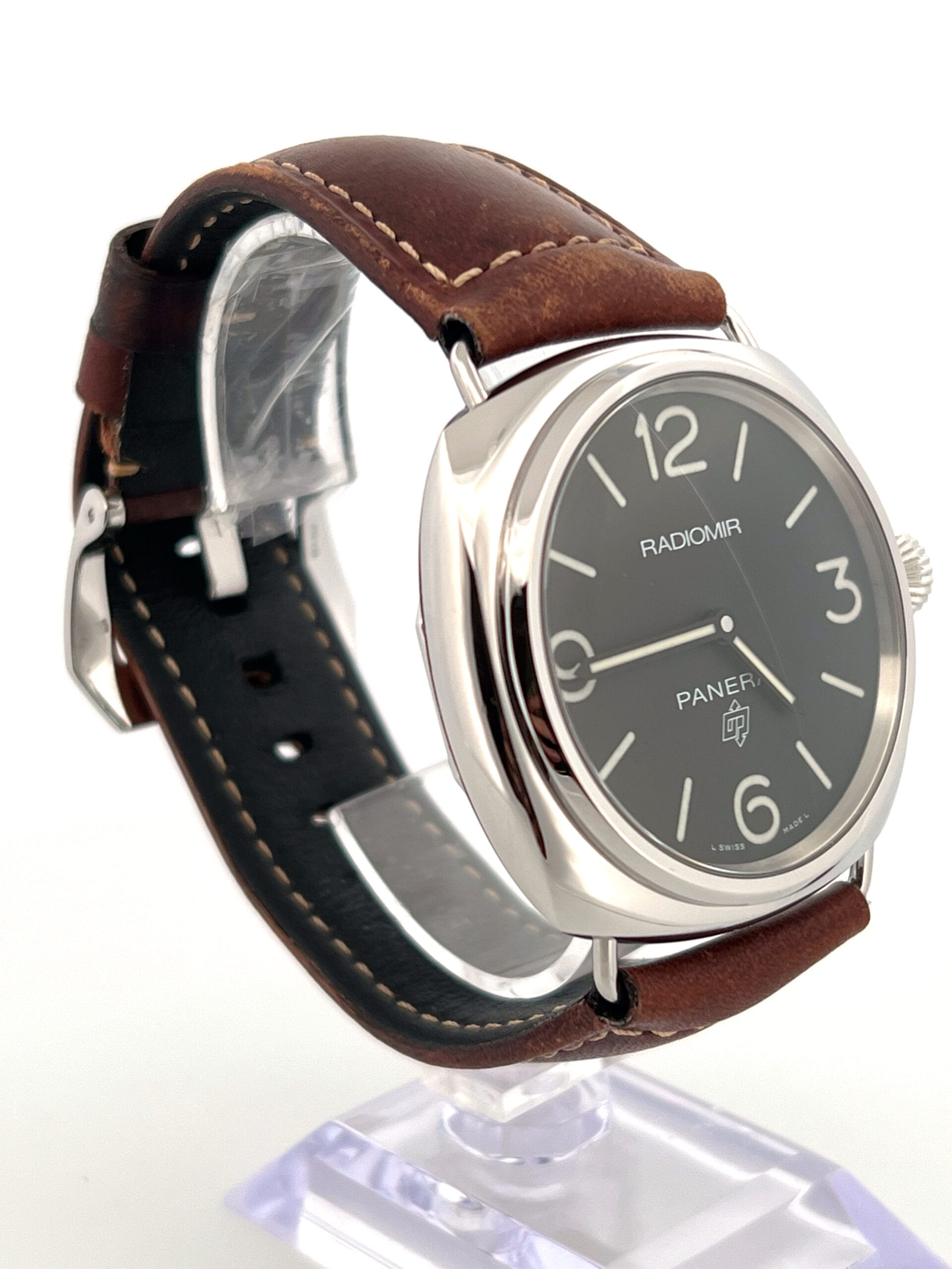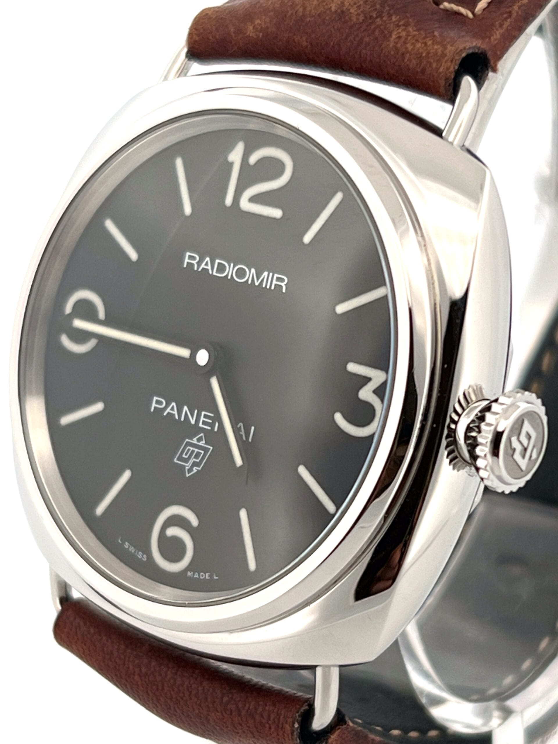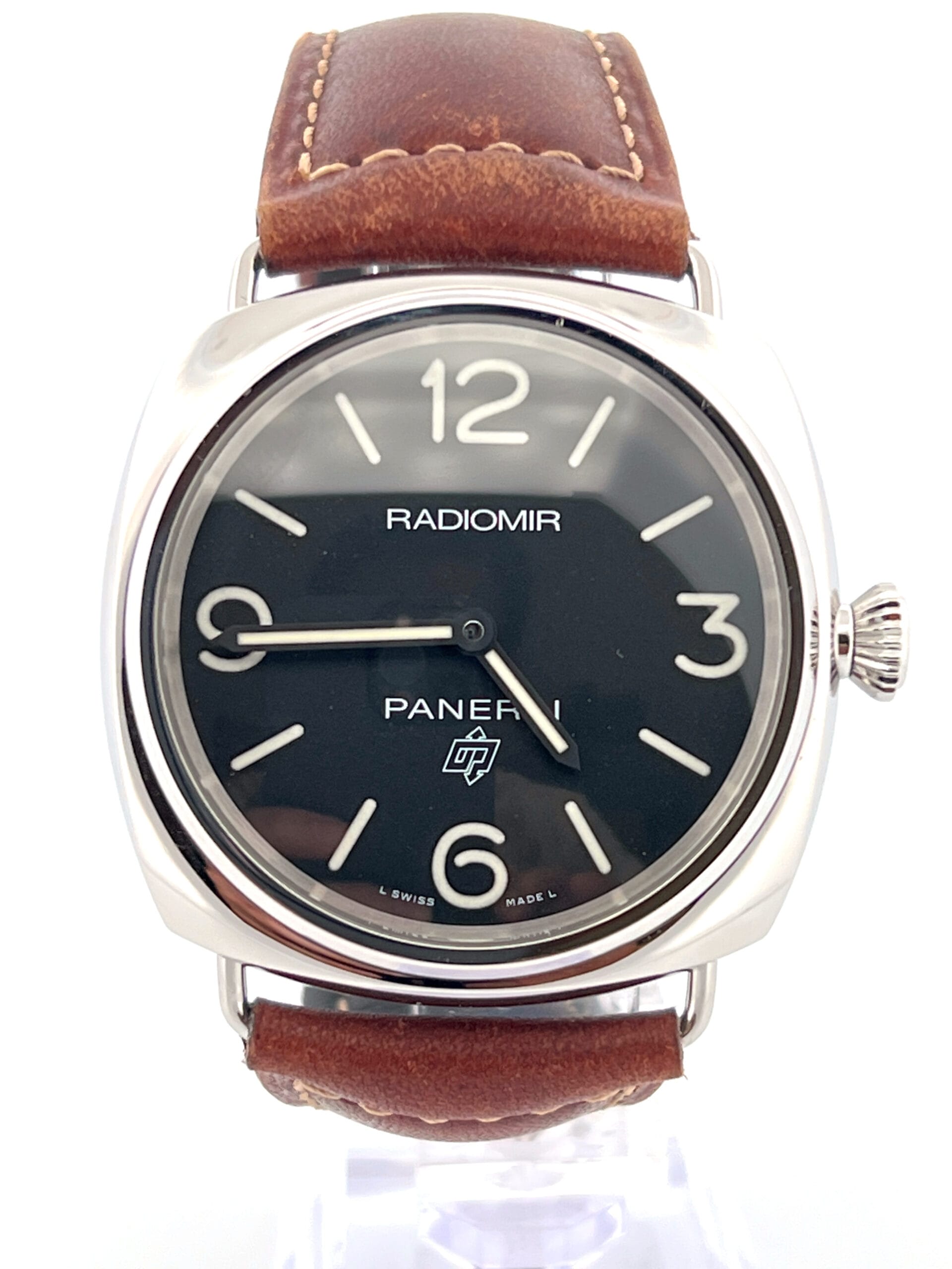 The Panerai Radiomir Base Logo PAM00753 is a return to essentials—and Panerai’s military roots—crafted with simplicity, character, and quietly impressive specs. Introduced around 2018, it features a hefty 45 mm cushion-steel case with the classic wire-loop lugs, a matte black dial with only bold 12-3-6 numerals and baton markers (no small seconds), and the Base Logo branding at 6 o’clock—which gives it both symmetry and raw, clean aesthetic. Powering it is Panerai’s in-house calibre P.6000, a manual-winding movement offering a 3-day (≈72-hour) power reserve. The watch is water resistant to 100 meters, with a strong 21,600 vph beat, and finished with a warm dark brown leather strap that nods to vintage styling.