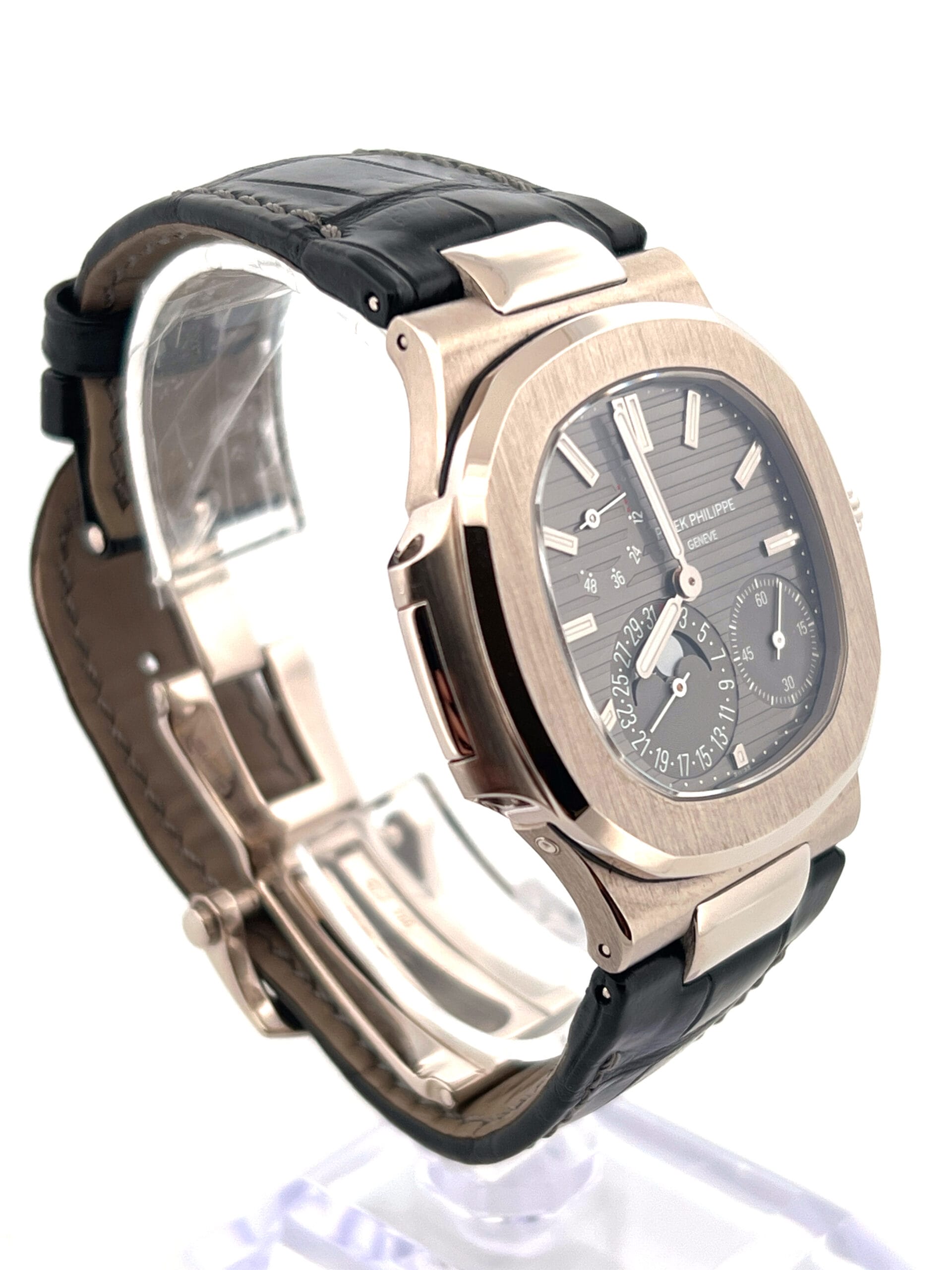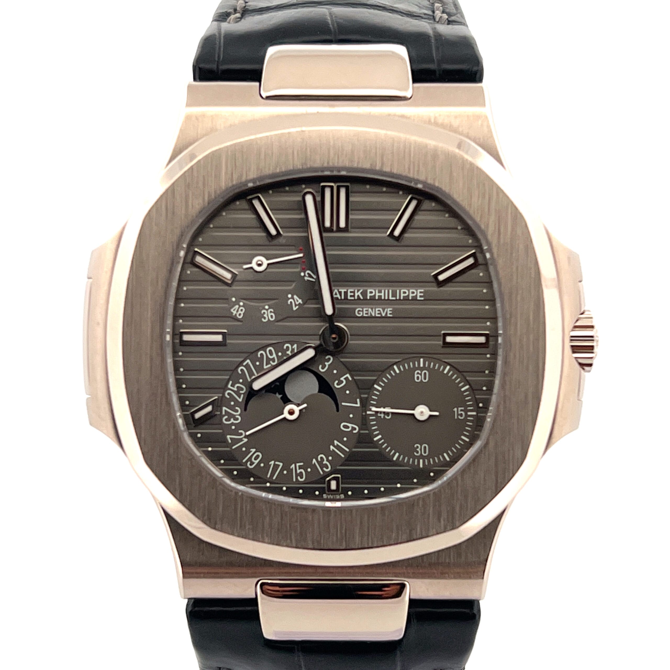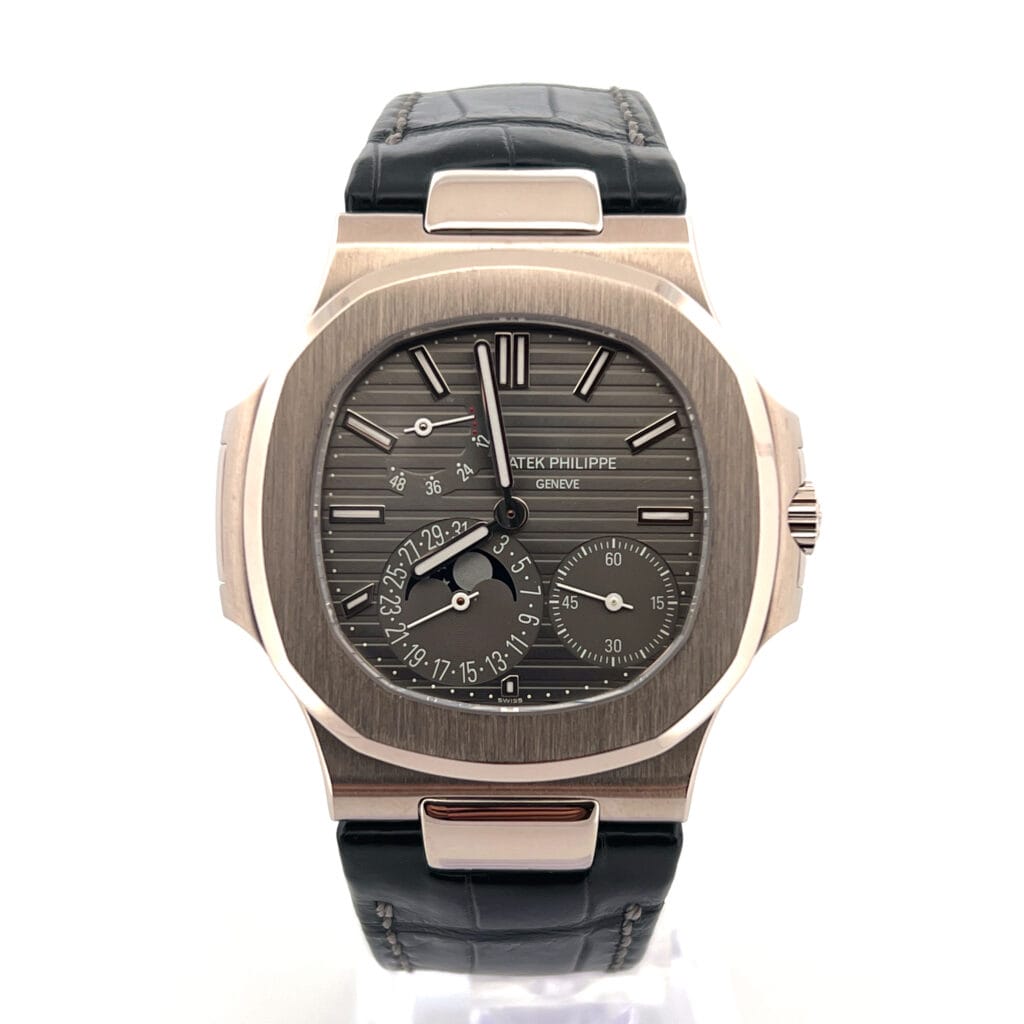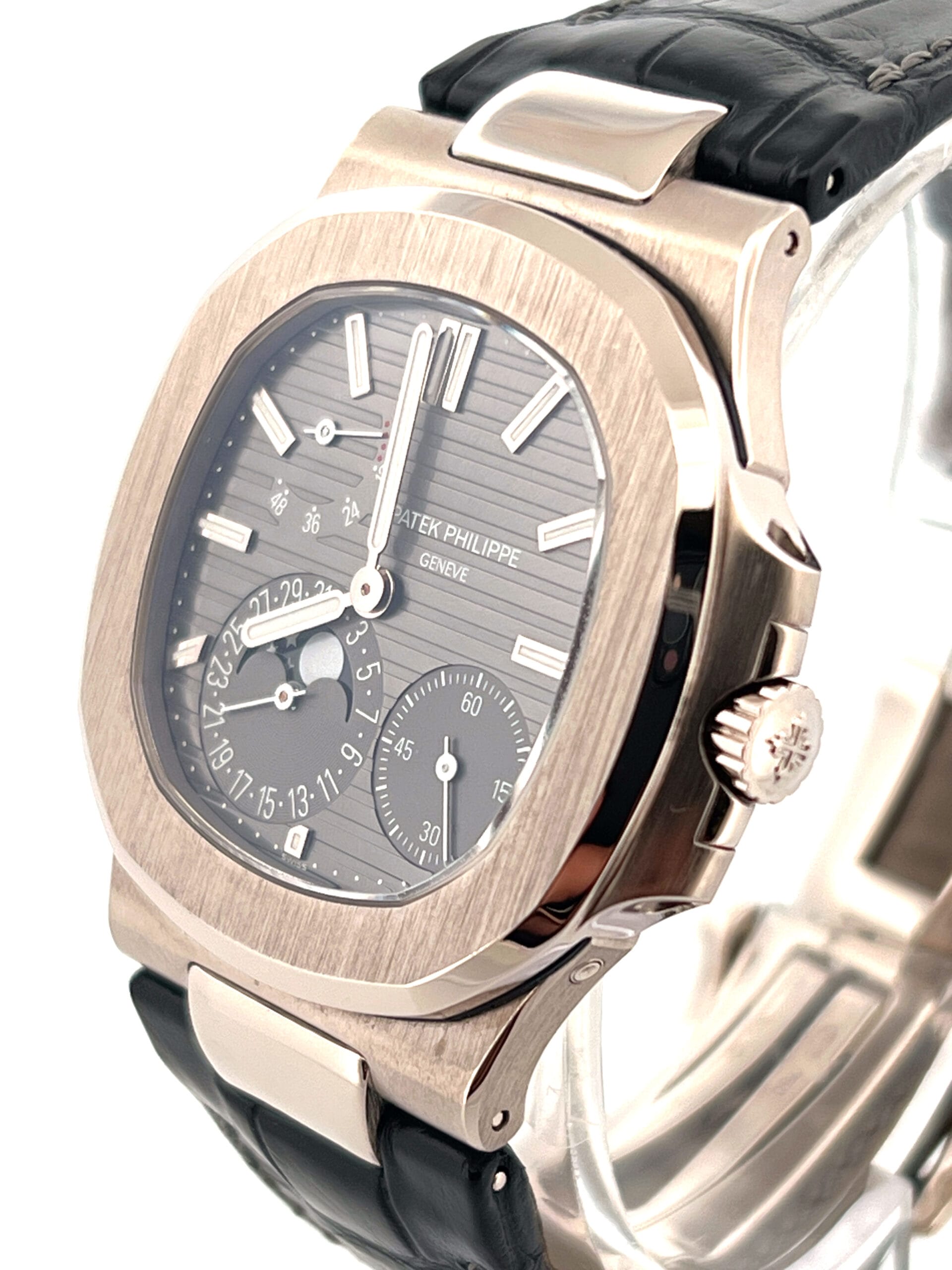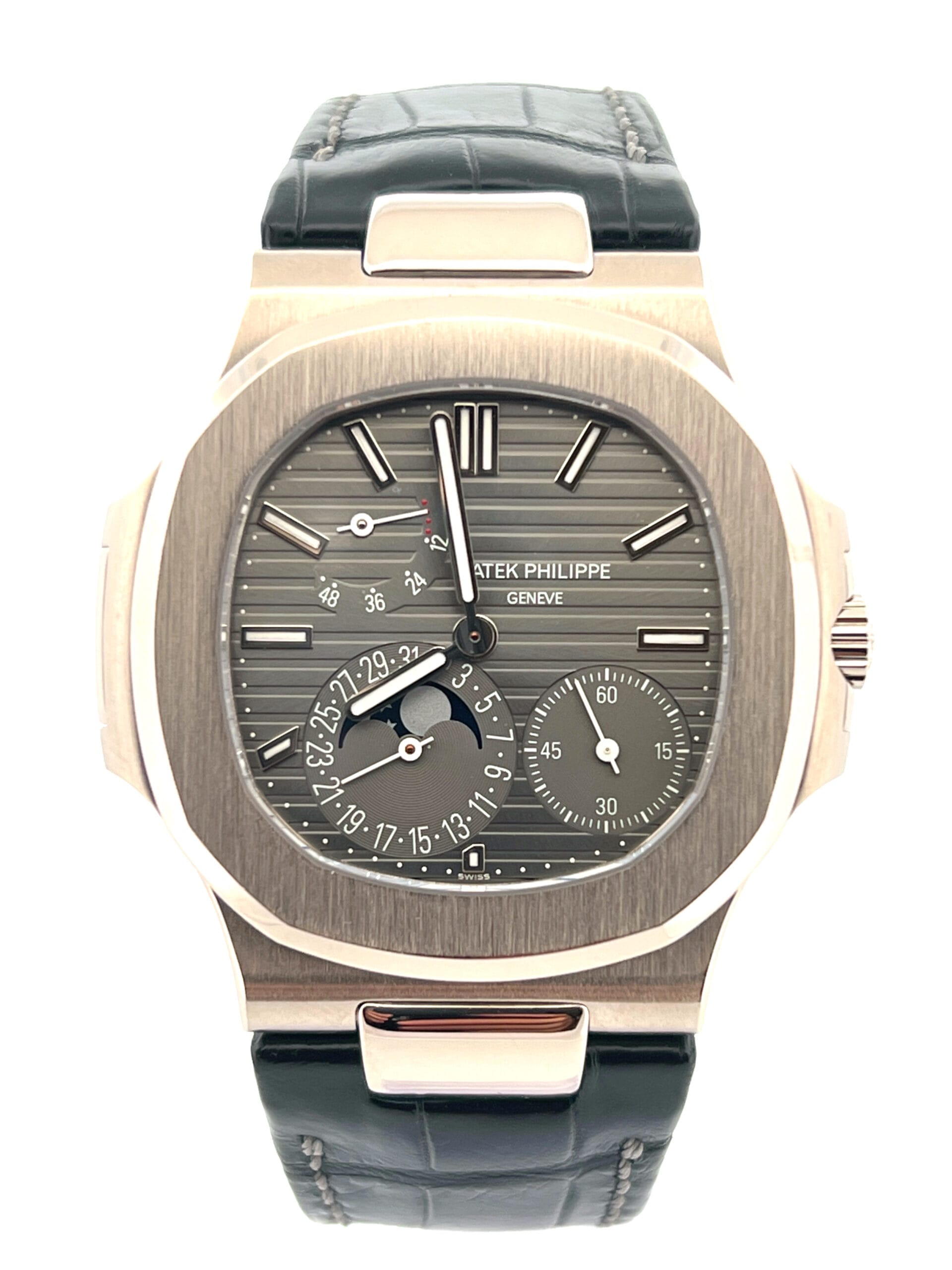 Its horizontally embossed dial—finished in a warm slate grey—appears understated at first glance. But look closer, and you’ll find an artfully orchestrated asymmetry: a power reserve indicator at 10 o’clock, a moonphase and date subdial at 7, and a small seconds between 4 and 5. This layout, slightly off-kilter, adds personality without disrupting harmony—a hallmark of the 5712’s distinct charm.