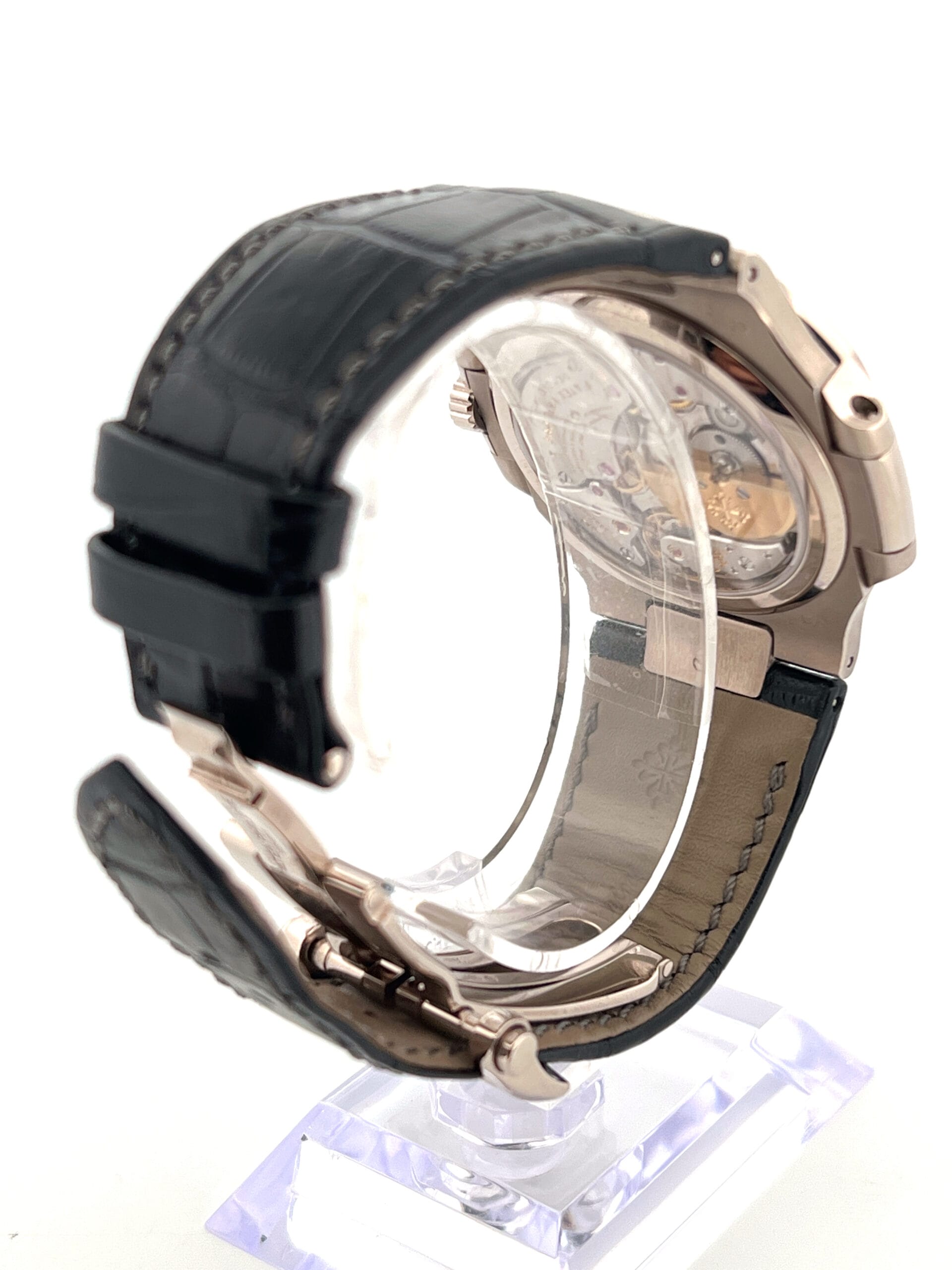 The 40mm case, crafted from solid 18k white gold, maintains the Nautilus’s signature porthole silhouette, but its polished edges and brushed surfaces elevate the tactile experience. Measuring only 8.5mm thick, the watch sits close to the wrist—low, light, and quietly confident. The absence of a steel bracelet gives it a more refined character, particularly when paired with the dark alligator leather strap and white gold deployant clasp.