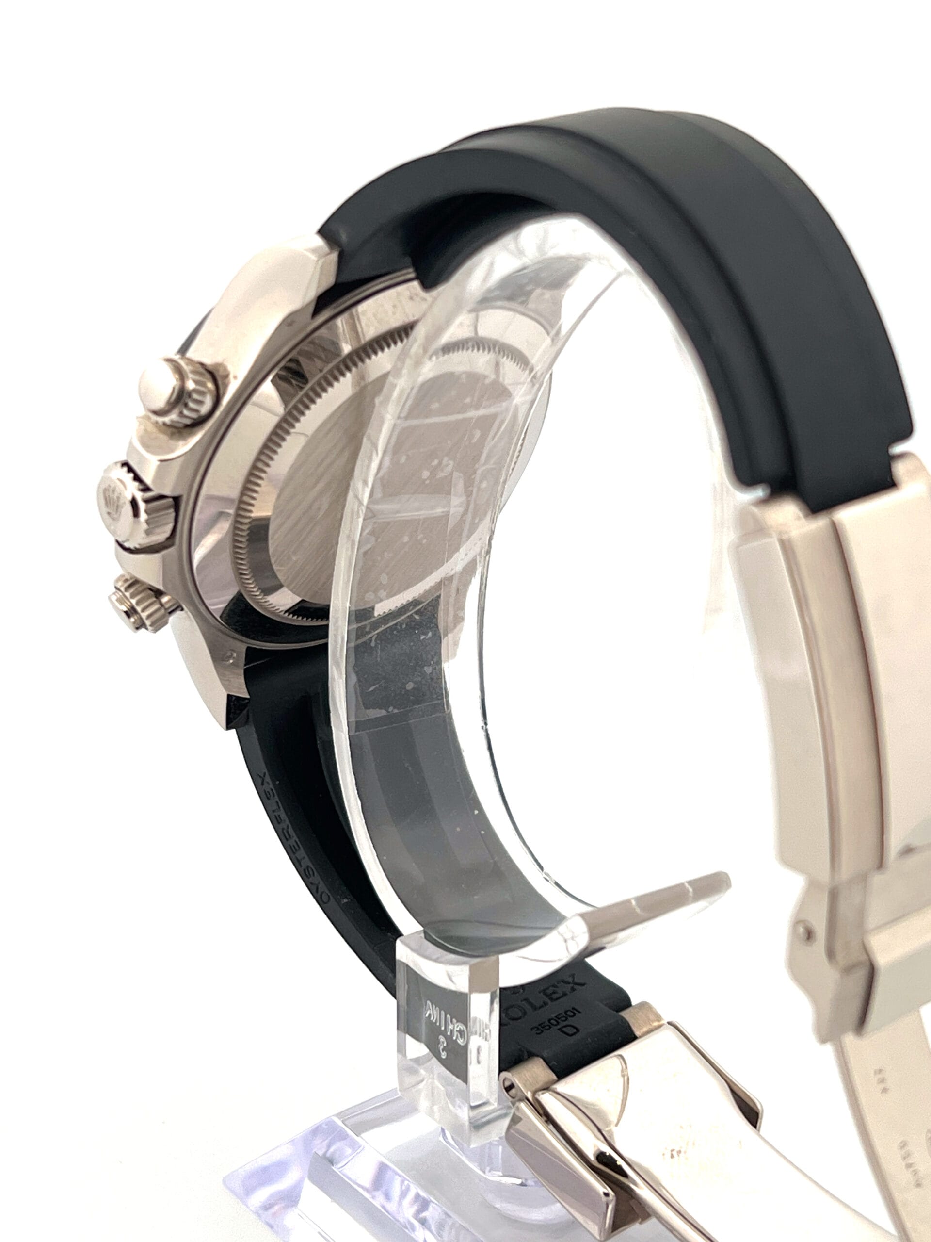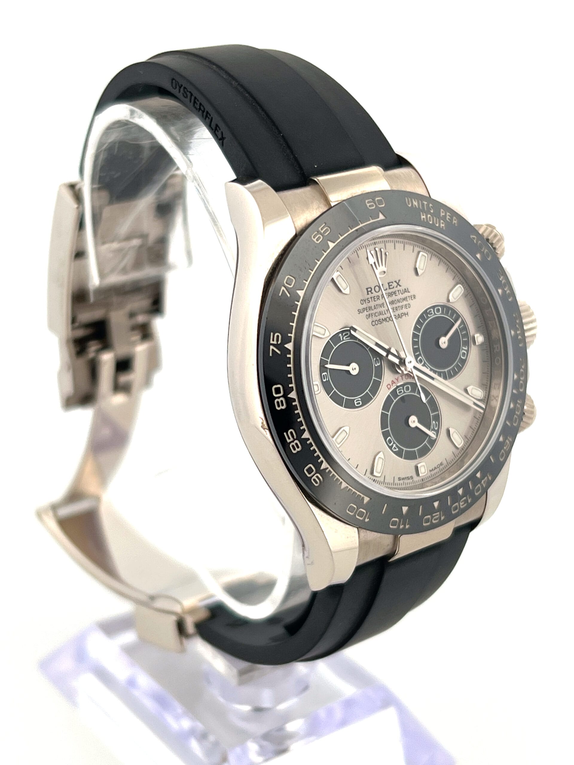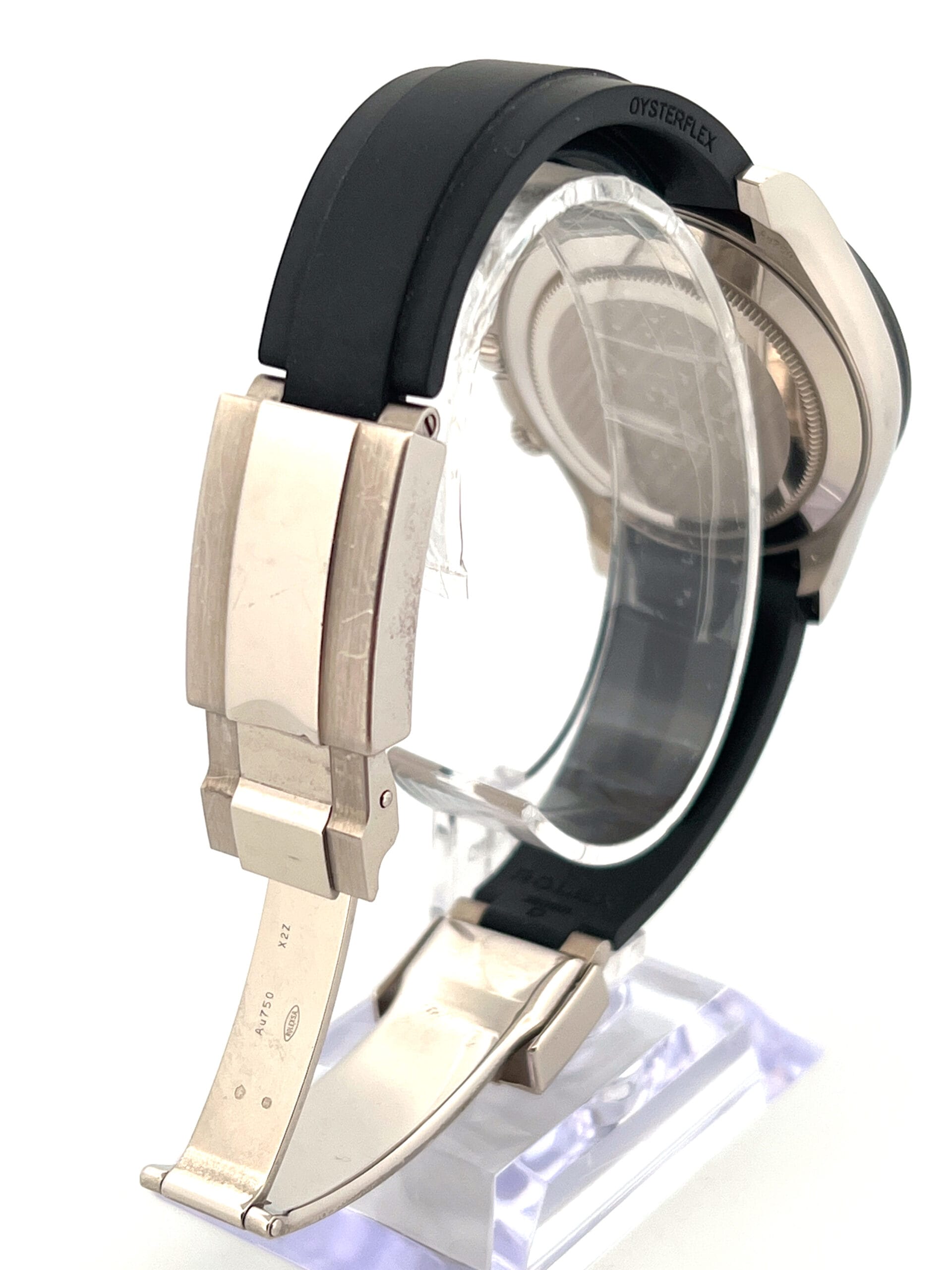 The 116519LN is fitted with the Oysterflex bracelet, a high-tech elastomer strap with a flexible titanium blade inside. It’s finished with a white gold Oysterlock clasp and the Glidelock extension system, offering secure, adjustable comfort with an elevated aesthetic. The bracelet adds a modern, sporty touch to what might otherwise feel like a classic dress chronograph.