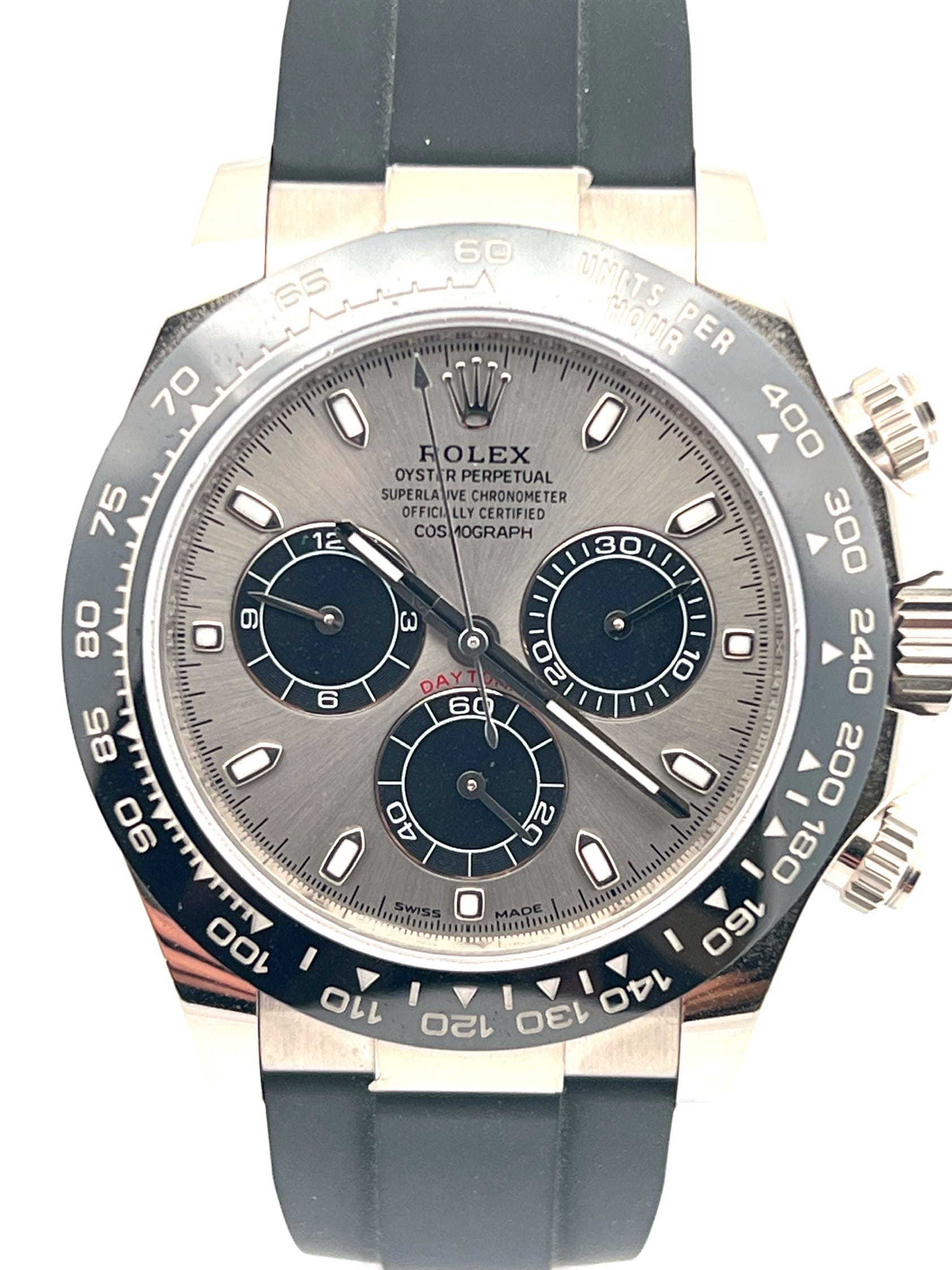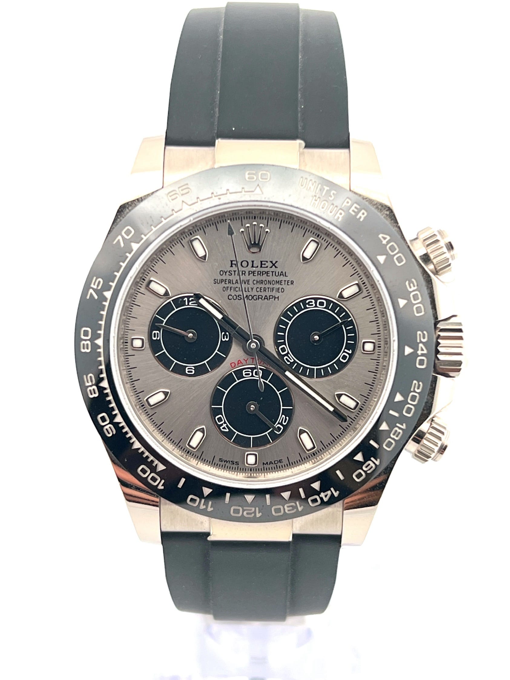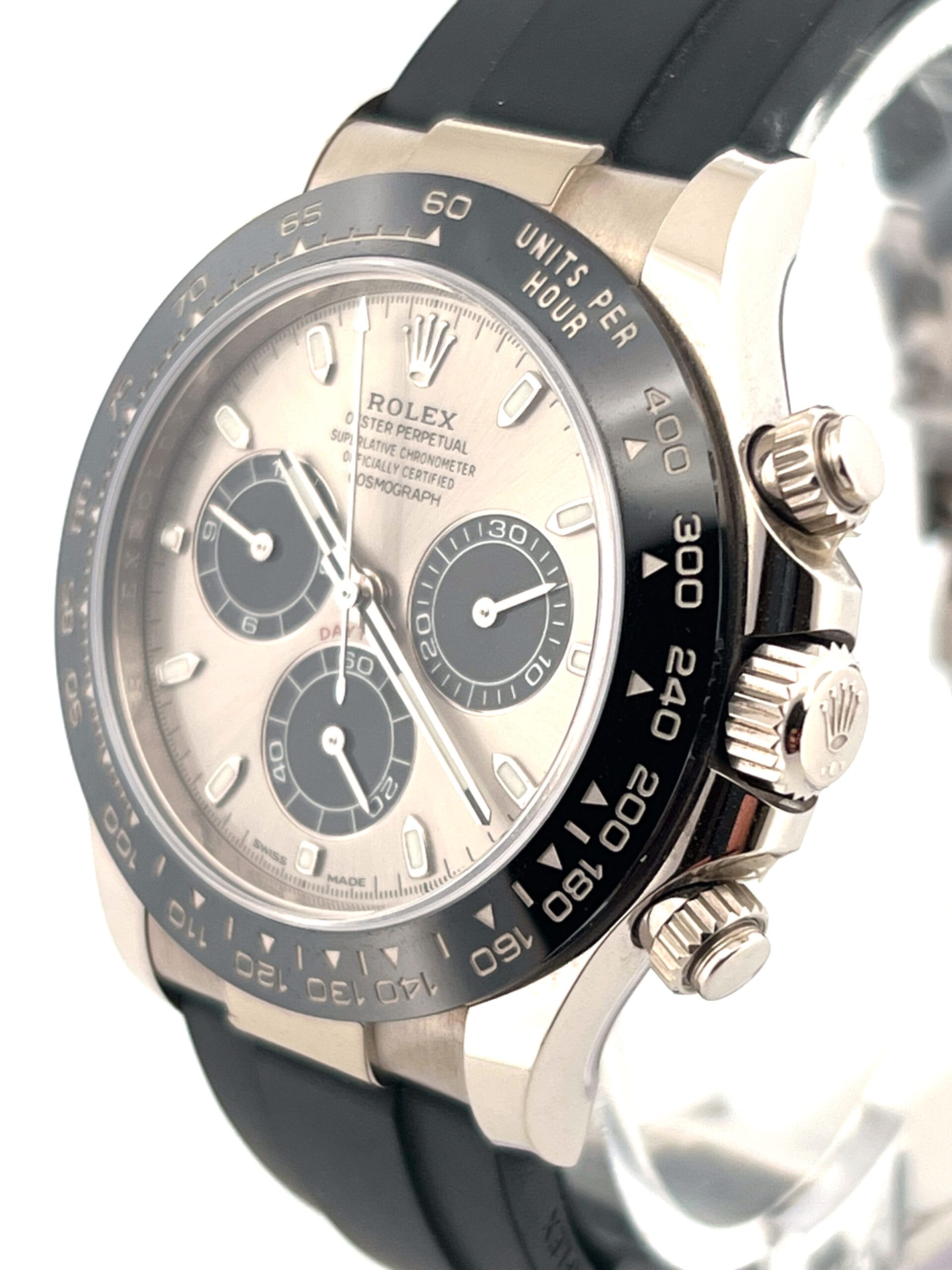 The 116519LN is fitted with the Oysterflex bracelet, a high-tech elastomer strap with a flexible titanium blade inside. It’s finished with a white gold Oysterlock clasp and the Glidelock extension system, offering secure, adjustable comfort with an elevated aesthetic. The bracelet adds a modern, sporty touch to what might otherwise feel like a classic dress chronograph.