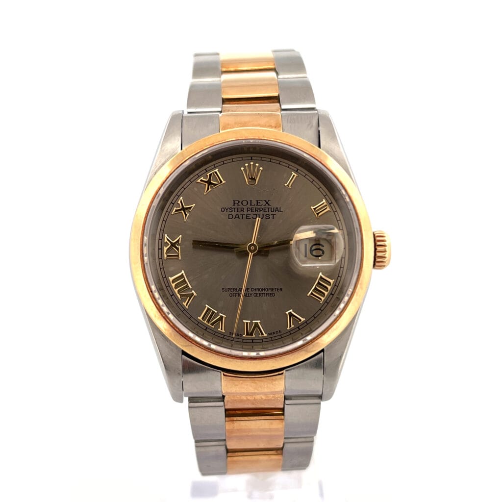 Rolex Datejust 36, reference number 16203. This watch has a 36mm Steel & Yellow Gold Case with Yellow gold bezel, Grey Roman numerals dial and Steel & Yellow Gold bracelet with Fold clasp. The Automatic movement has Date function. The wrist measures 7.5 inches or 19.05 centimeters. The condition is Very Good