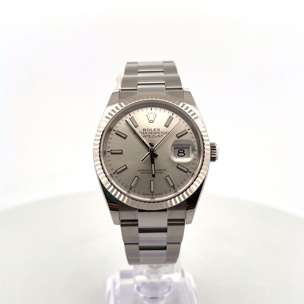 Introducing the Rolex Datejust Reference 126234 with a silver dial and Oystersteel strap, a timeless icon of elegance and precision. This classic timepiece features a 36mm Oystersteel case, embodying Rolex’s legendary durability and style. The silver dial exudes sophistication, complemented by luminous hour markers and hands for optimal readability in any lighting condition. Powered by Rolex’s caliber 3235 self-winding movement, it offers exceptional accuracy and a power reserve of approximately 70 hours. With its iconic fluted bezel and Oystersteel Jubilee bracelet, this Datejust is a versatile companion for any occasion, blending luxury and reliability seamlessly.