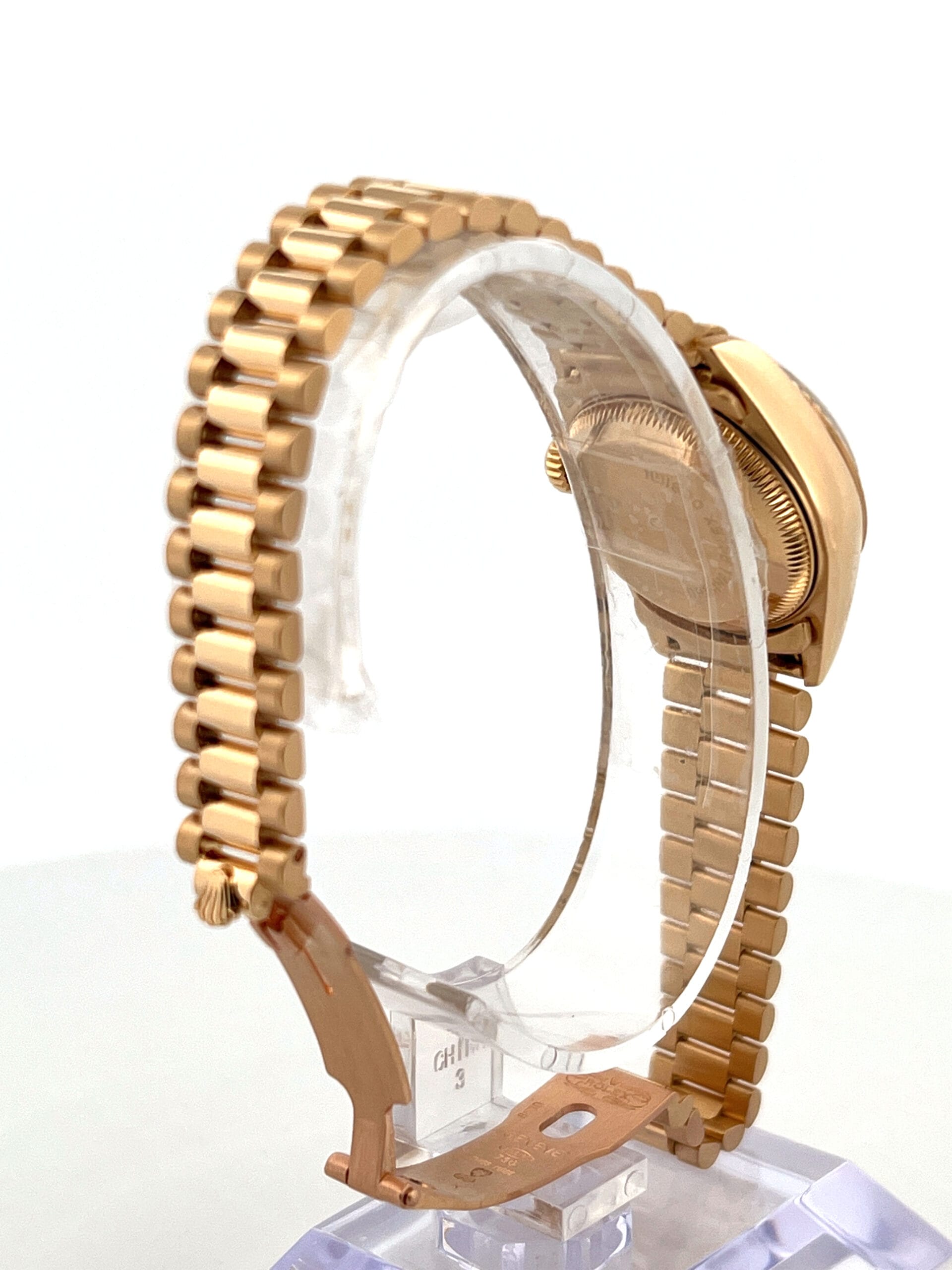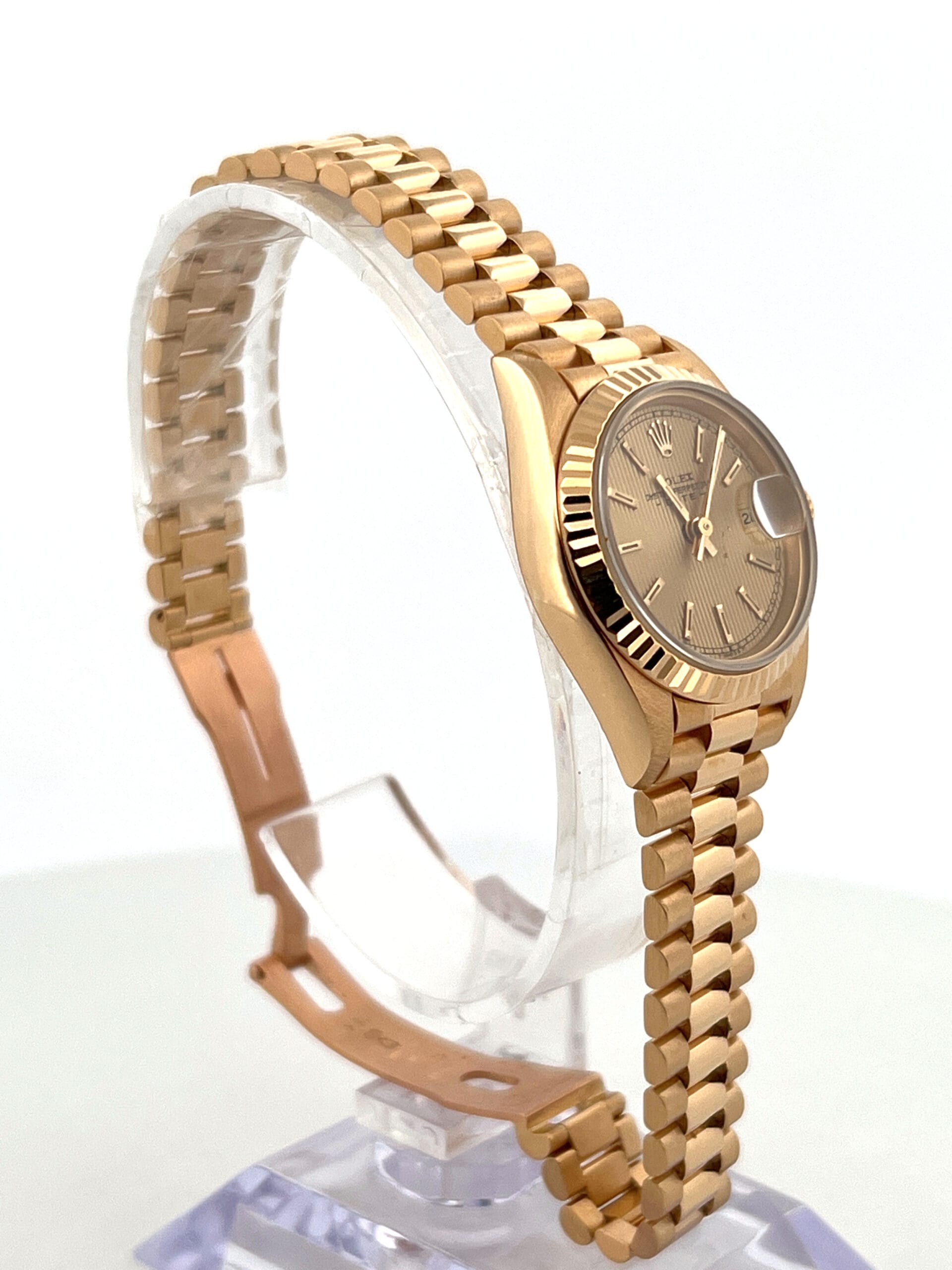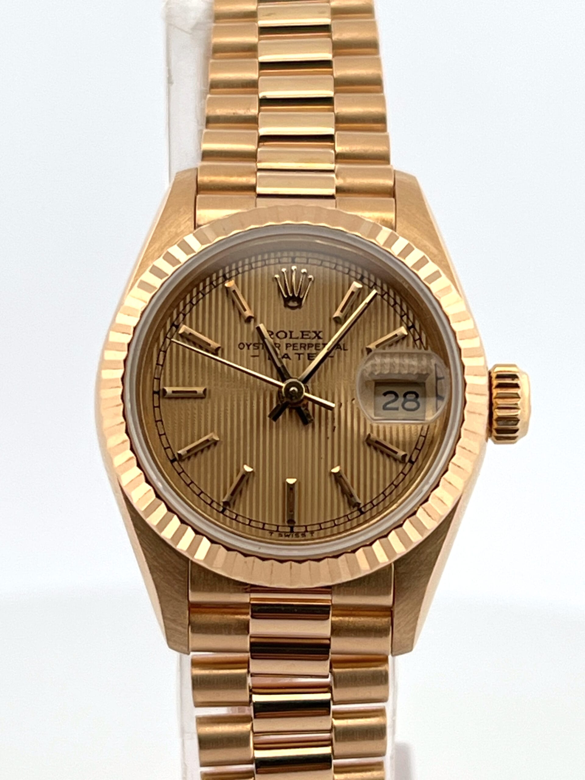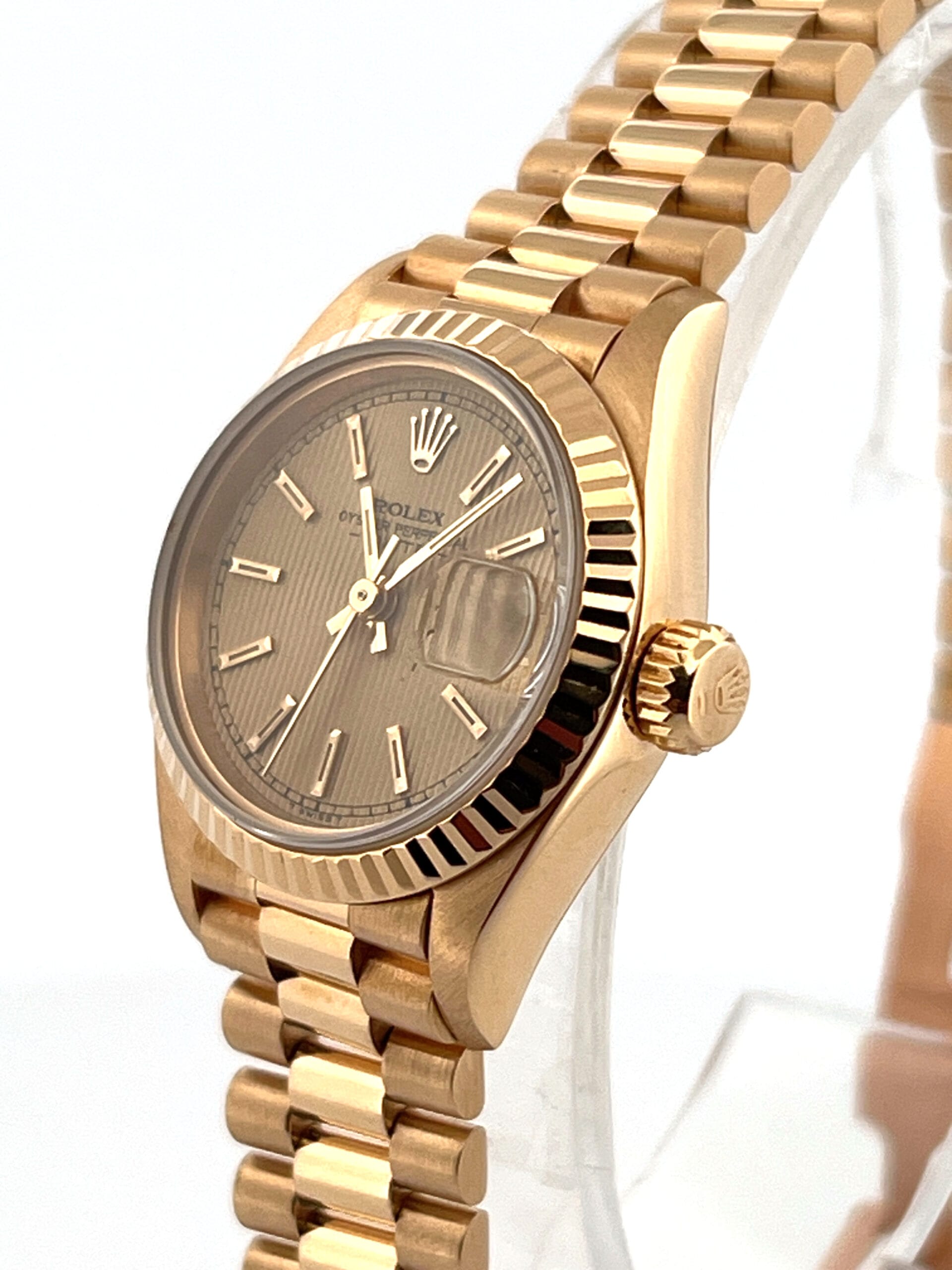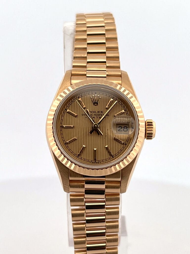 The Rolex Datejust Ref. 69178 is a classic expression of Rolex’s golden era of elegance, crafted entirely in 18k yellow gold and sized at a graceful 26 mm—perfectly tailored for the wrist without losing any of the Datejust’s commanding presence. Introduced in the late 1970s and produced through the 1980s, it became a symbol of sophistication, pairing the timeless fluted bezel and President bracelet with Rolex’s signature Cyclops date display at 3 o’clock. Many variations of the 69178 feature champagne, silver, or diamond-set dials, but what unites them all is the unmistakable aura of luxury. At its heart beats the dependable Calibre 2135, an automatic movement celebrated for its accuracy and durability, even in a case this refined. We curate the 69178 because it embodies the essence of Rolex prestige in a compact form—a watch that feels both jewelry and timepiece, discreet yet unmistakably powerful.