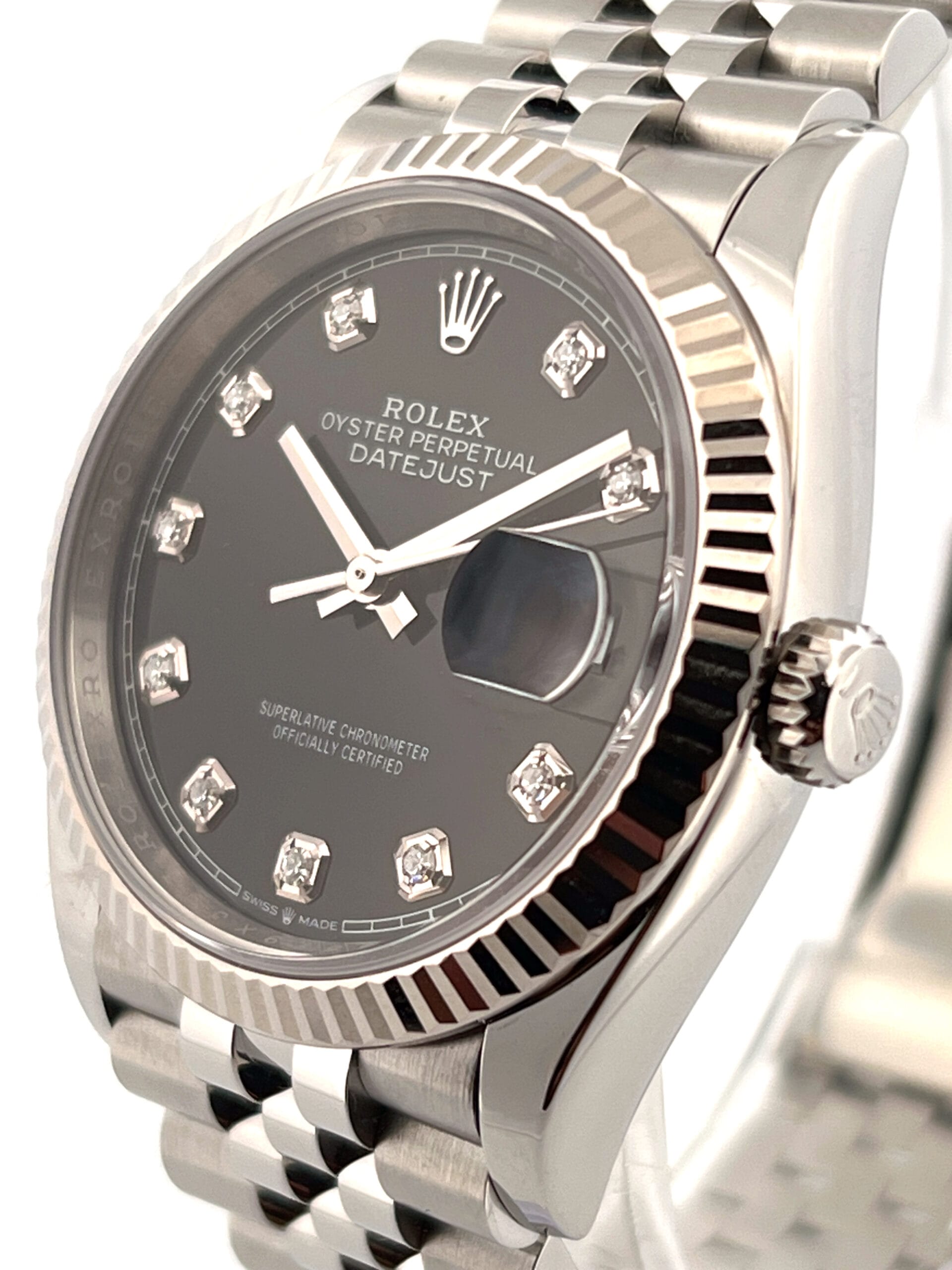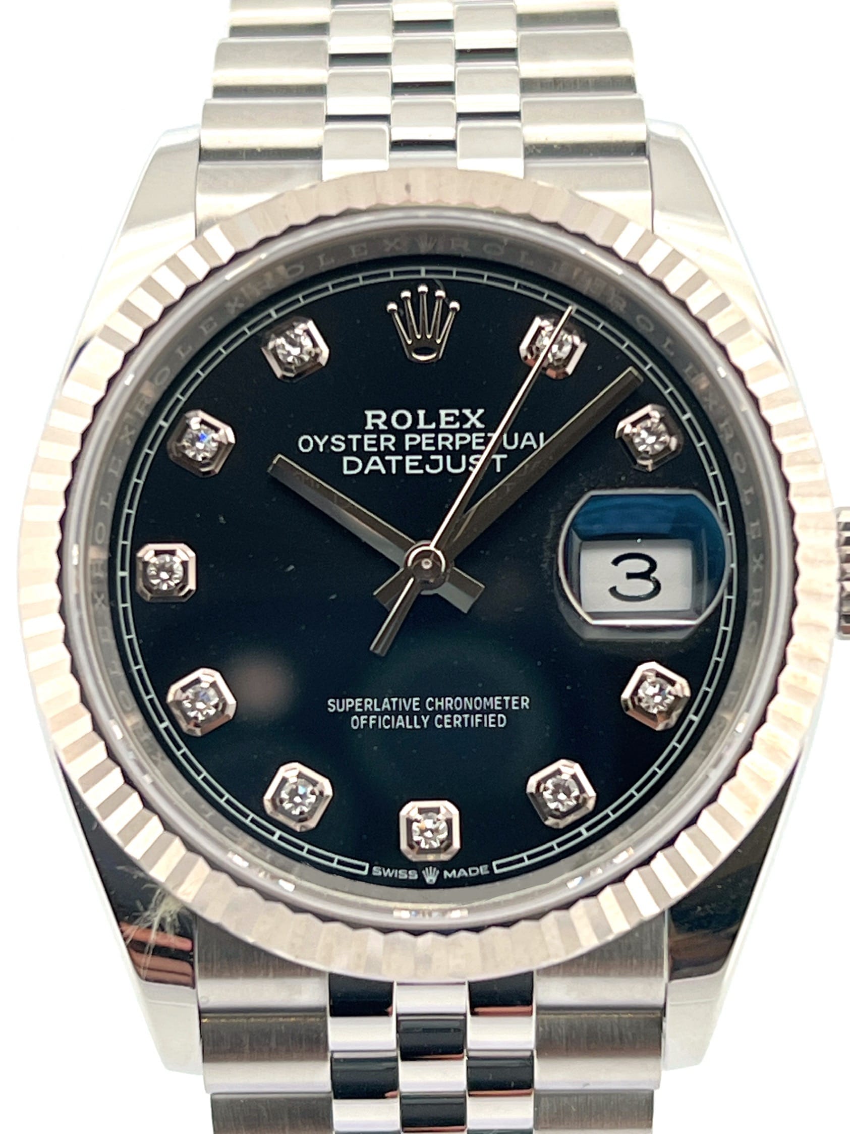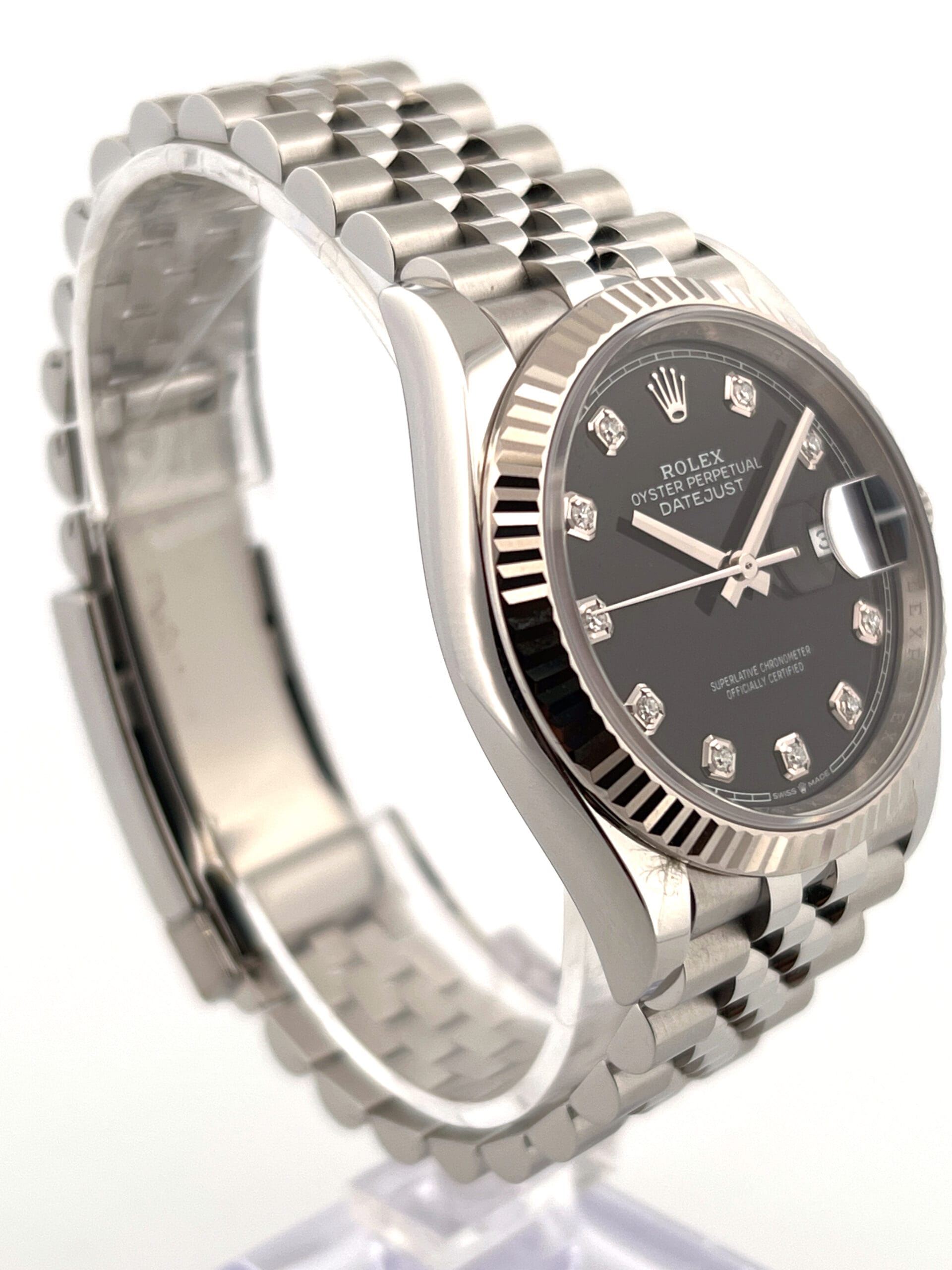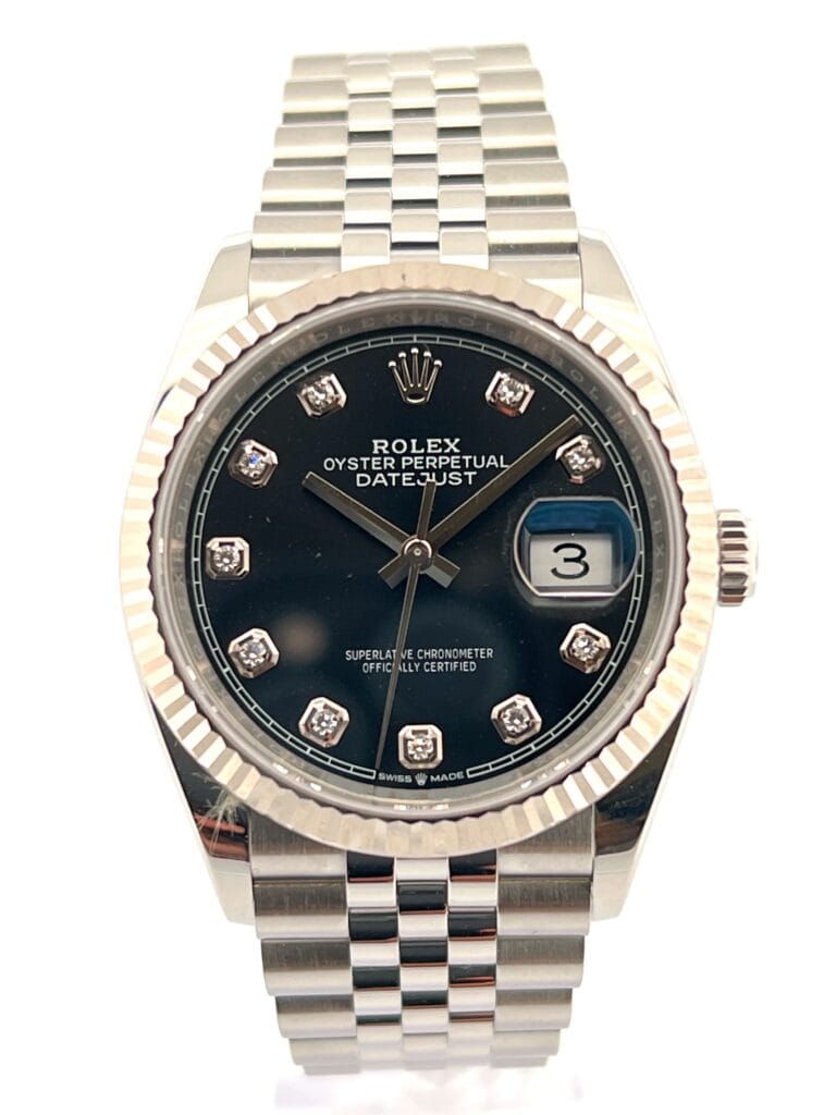 The Rolex Datejust 36 Ref. 126234 is where timeless design meets refined luxury. Crafted in Rolesor White, a combination of robust Oystersteel and an 18k white gold fluted bezel, it strikes the perfect balance between everyday versatility and elevated elegance. The black dial, understated in tone, comes alive with diamond-set hour markers, adding a touch of brilliance without overwhelming the watch’s classic proportions. At its core is the modern Calibre 3235, Rolex’s latest-generation movement offering a 70-hour power reserve, Chronergy escapement, and Superlative Chronometer precision. We curate the 126234 because it embodies what the Datejust has always stood for—a watch that adapts to every setting—sport, business, or evening—while quietly signaling taste and refinement through its diamond details.