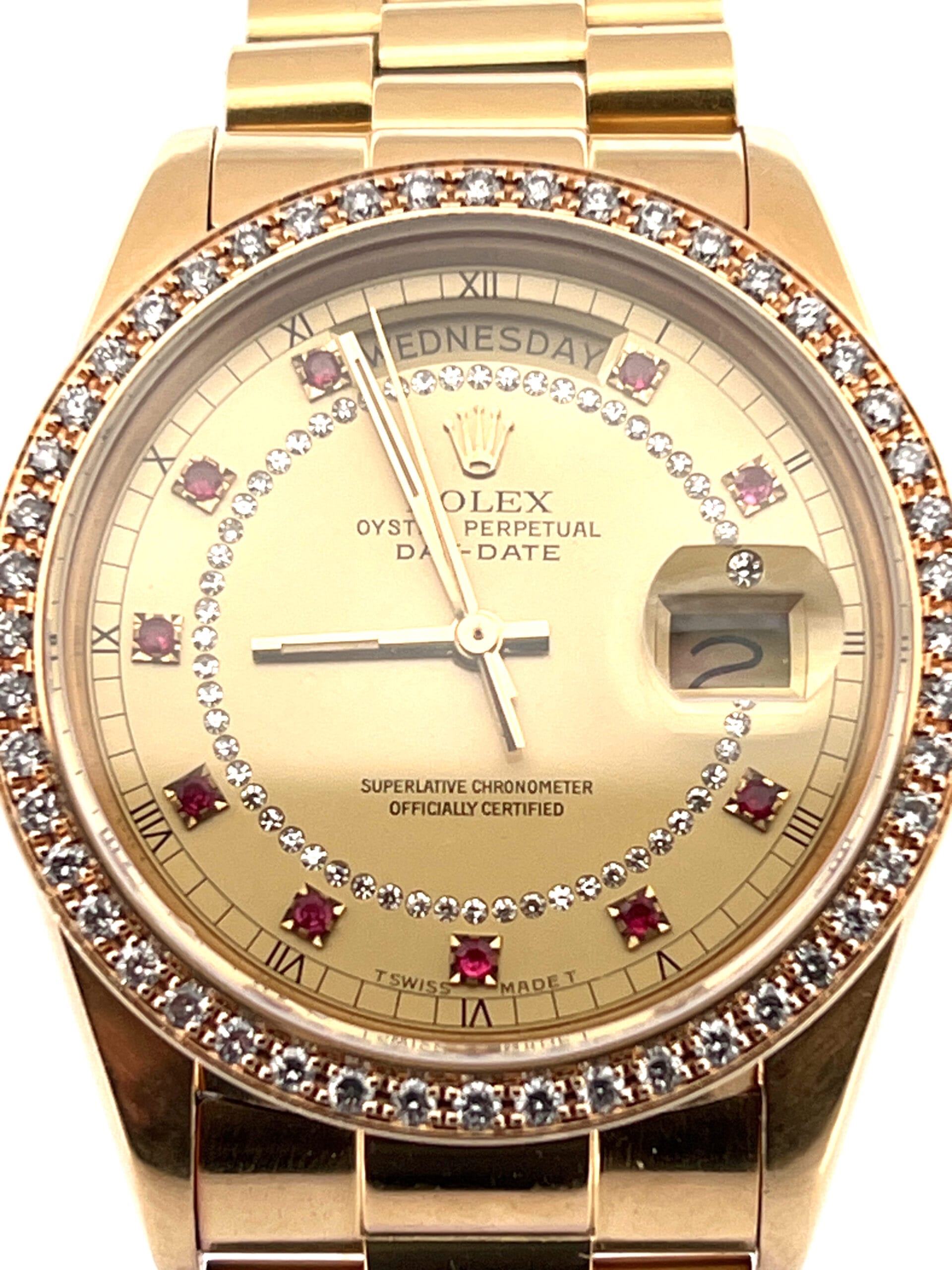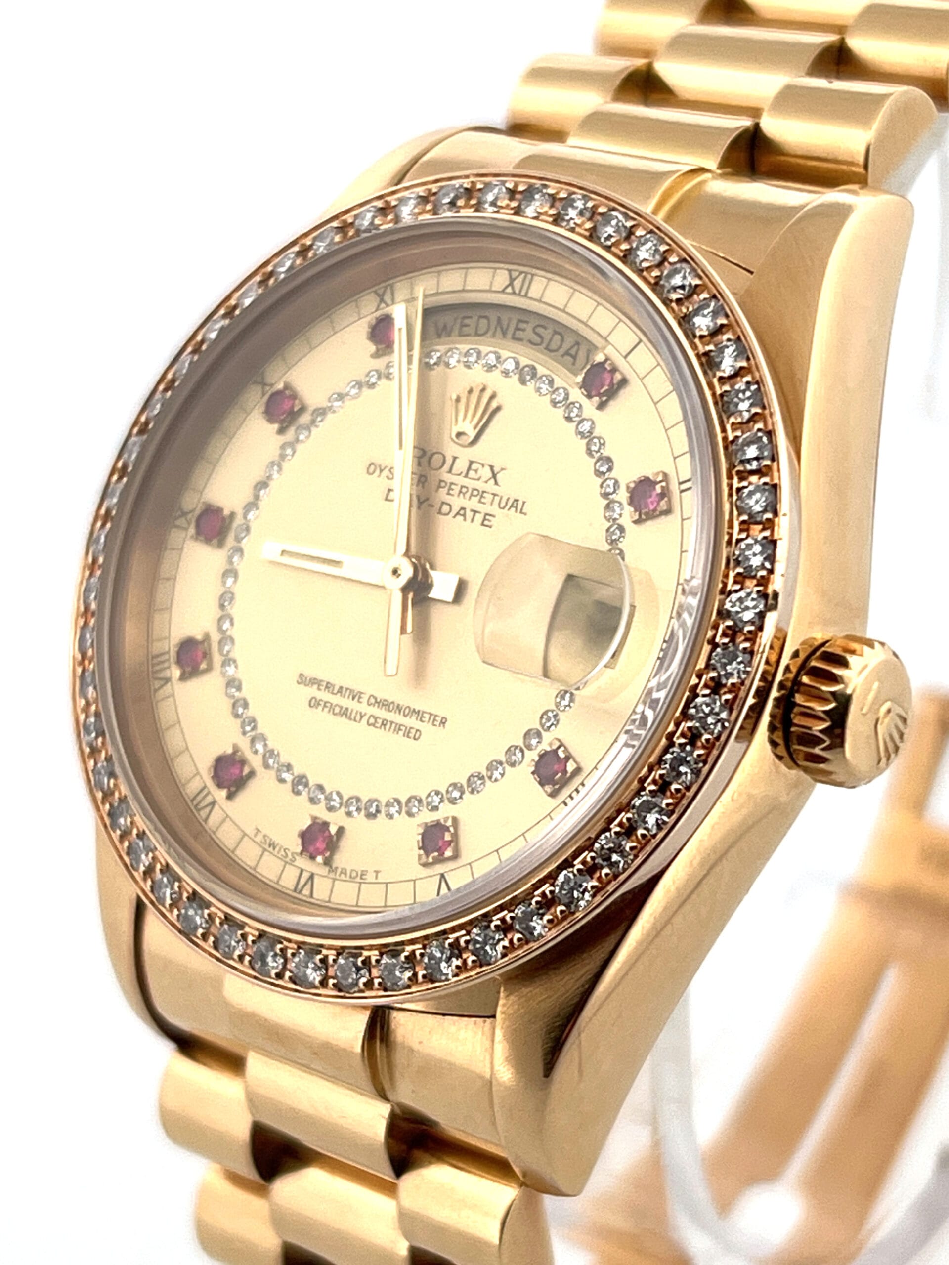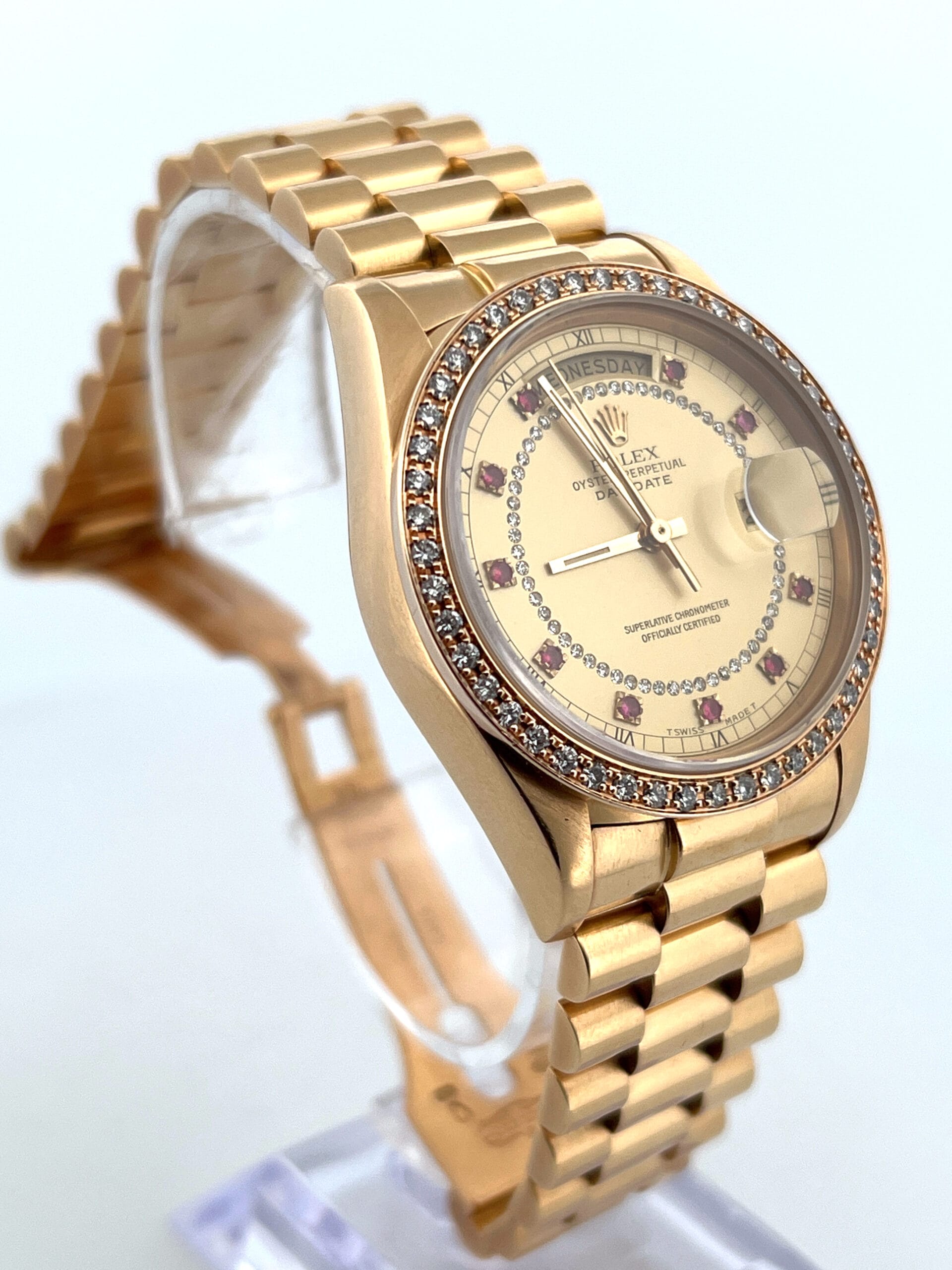 The red sapphires serve as the hour indices, each stone precisely cut and channel-set — something Rolex reserved for only a small number of specially ordered dials at the time. Combined with the string-diamond minute track and the gold fluted bezel, it delivers a look that is unmistakably vintage Rolex: bold, elegant, and very collectible.