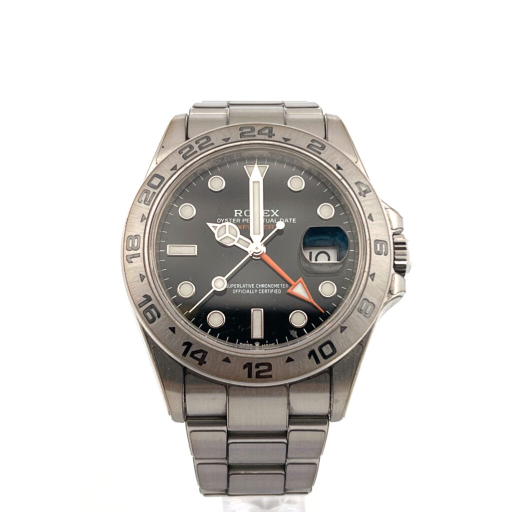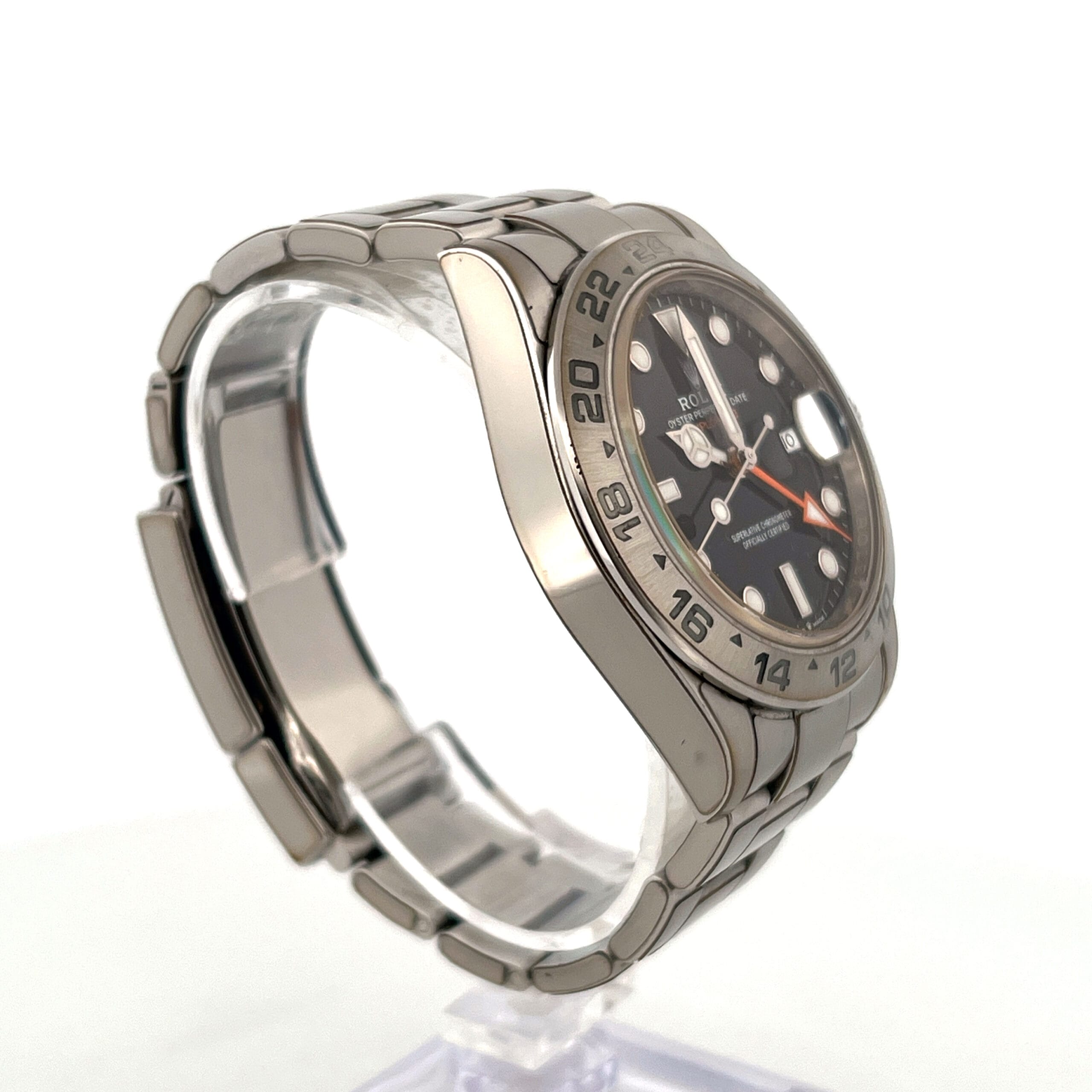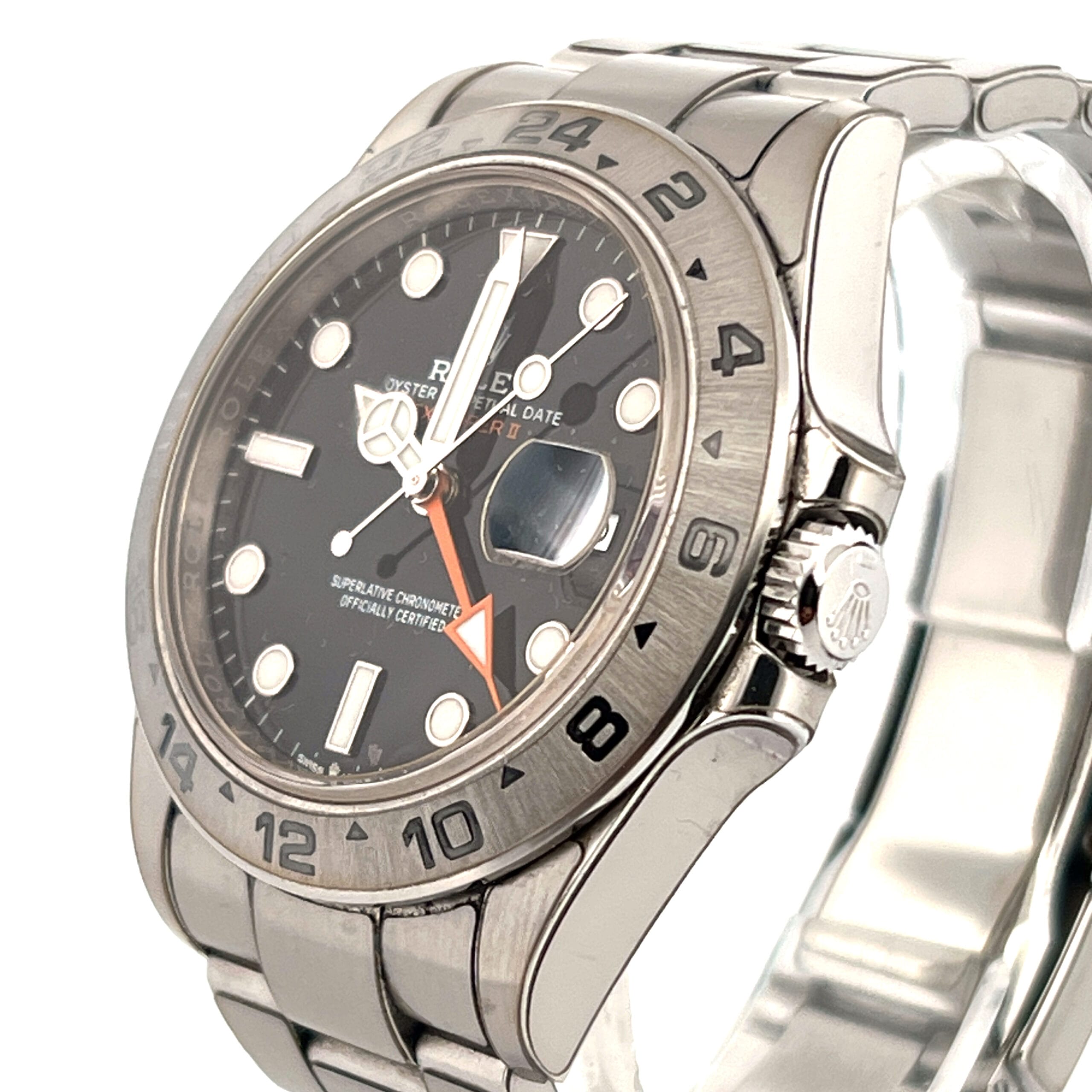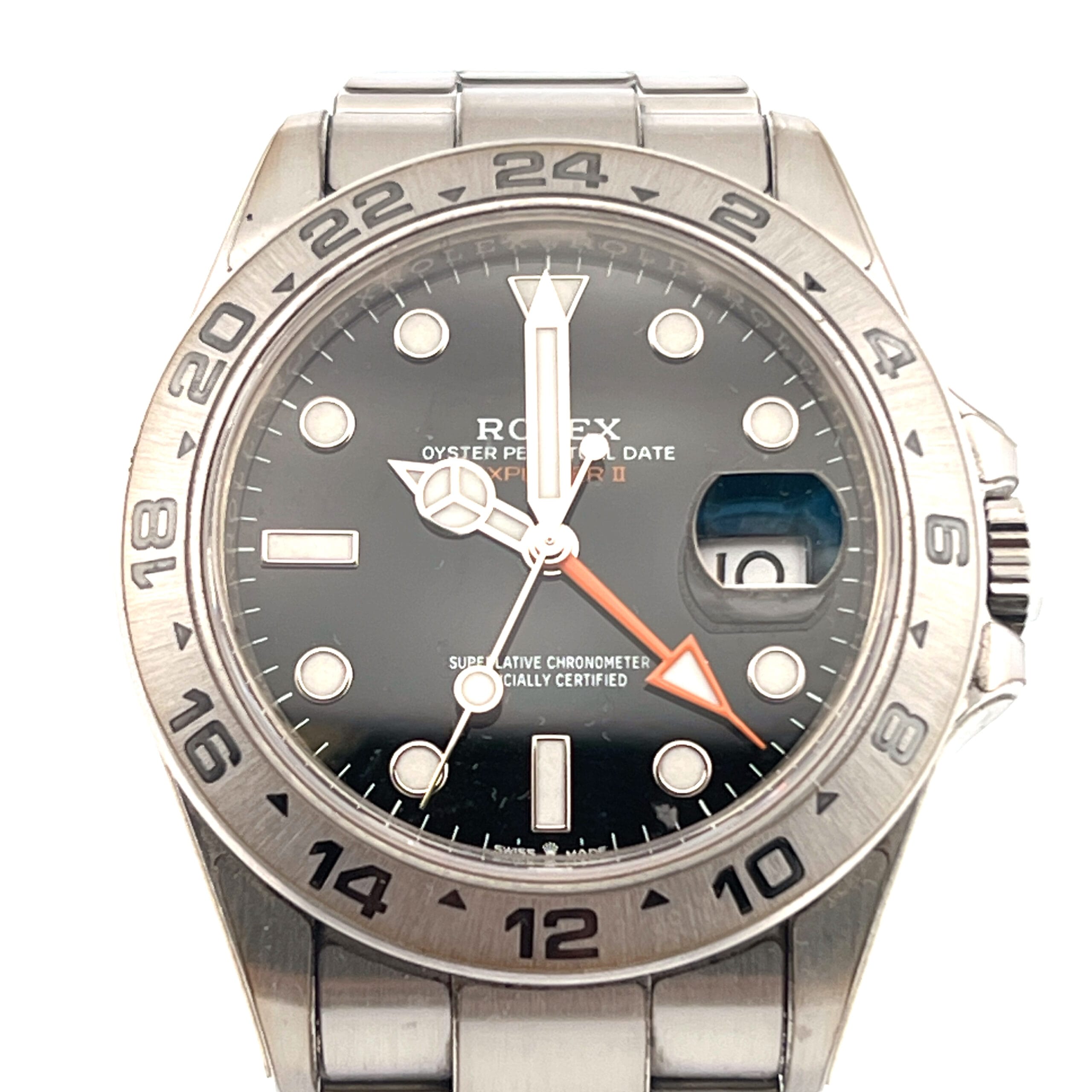 The Rolex Explorer II 226570 in black dial form is a watch built for those who navigate the unknown. At 42mm, it carries a confident presence on the wrist, yet remains true to the tool-watch ethos that defines the Explorer lineage. The satin-brushed stainless steel case and Oyster bracelet speak to durability, while the fixed 24-hour bezel—engraved and subtly polished—adds a sense of quiet functionality.