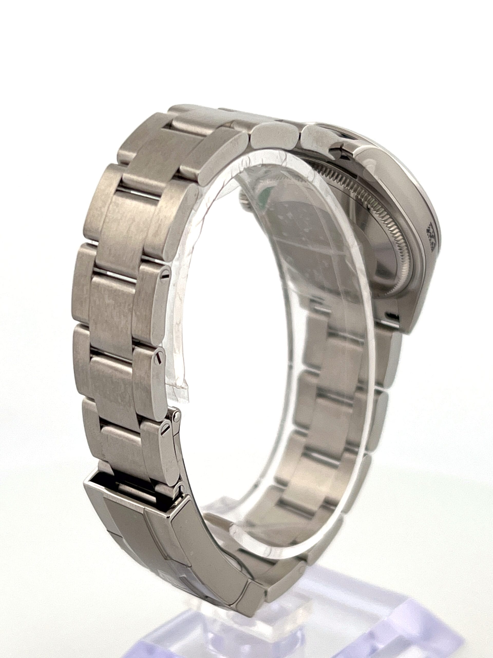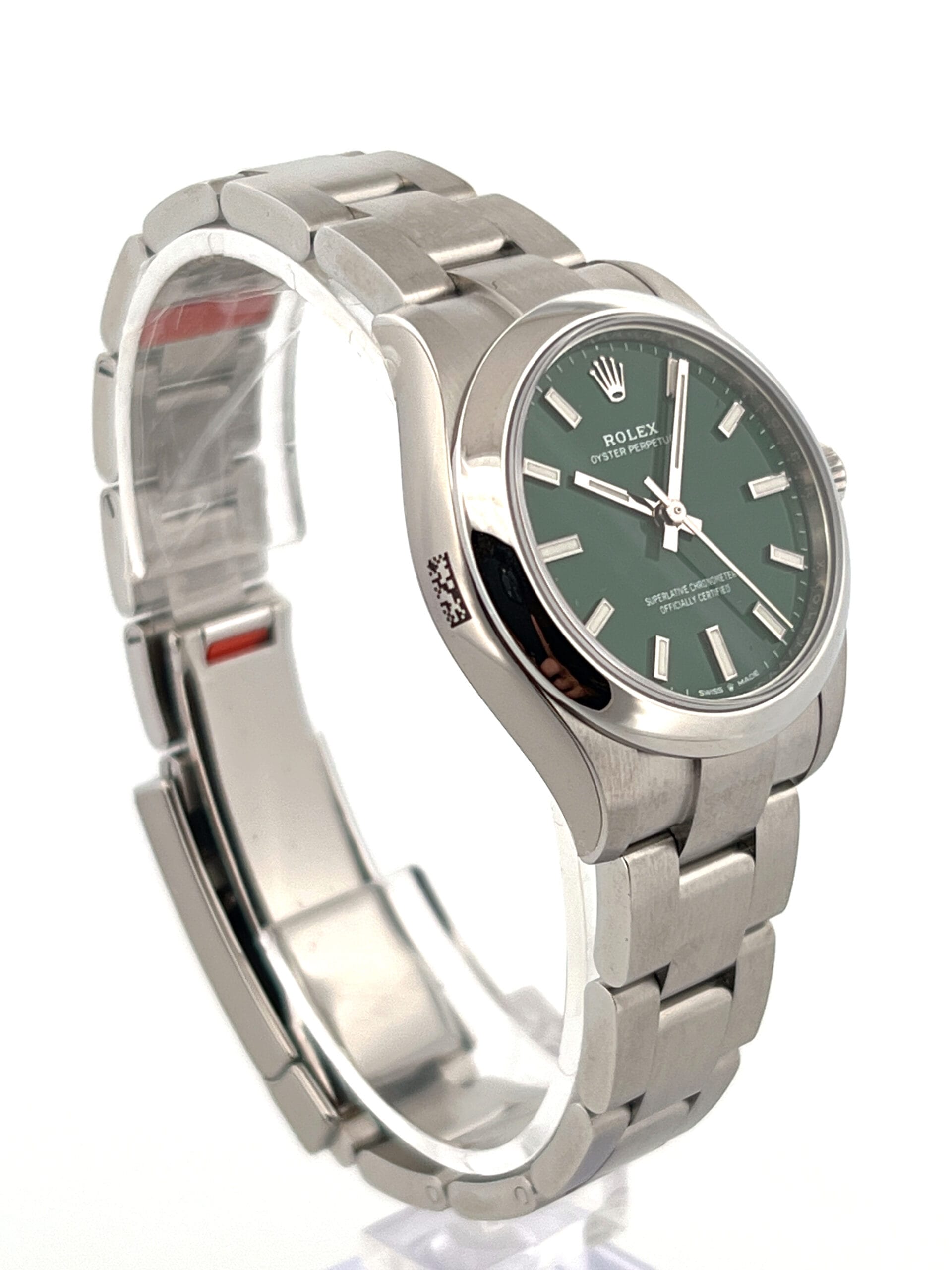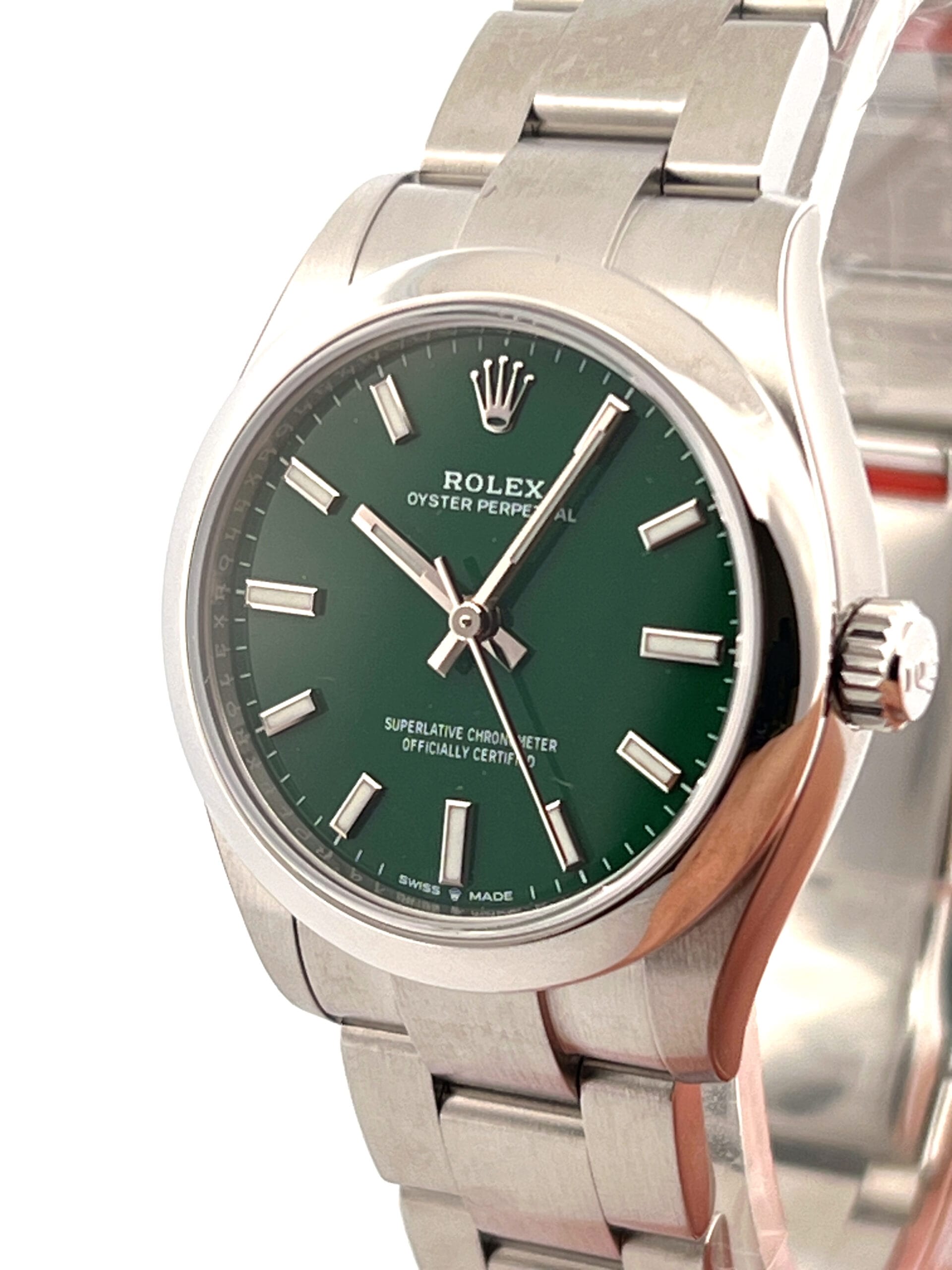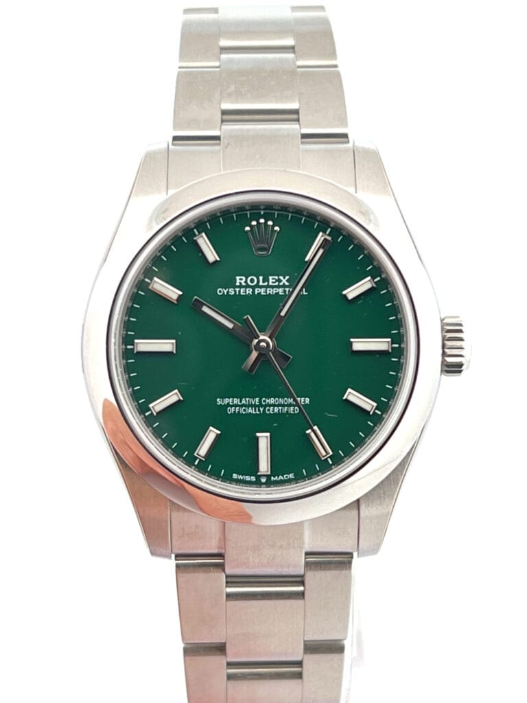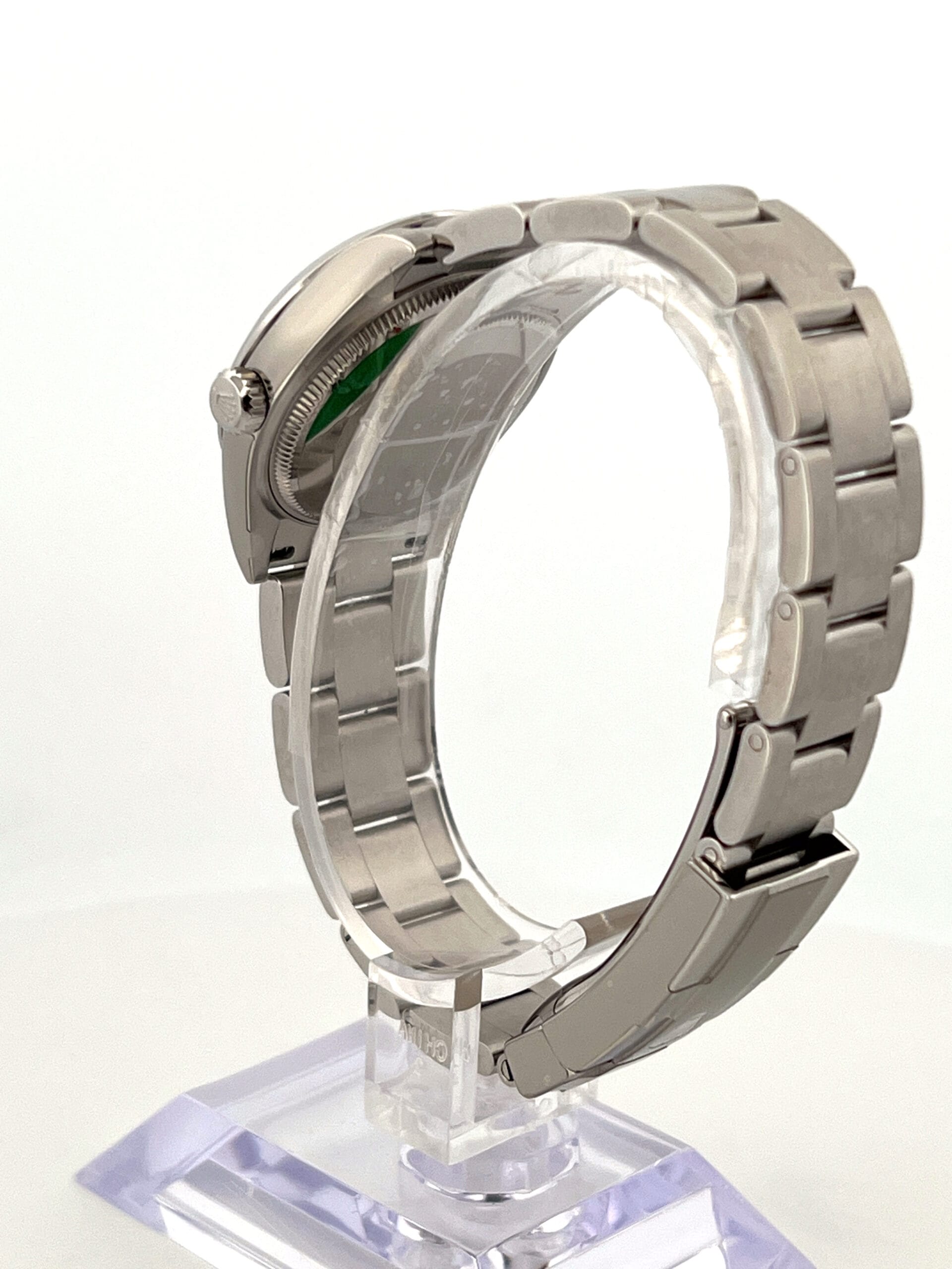 Crafted from Rolex’s proprietary Oystersteel, the 31mm case offers a perfect balance—compact enough for elegance, yet substantial enough to feel purposeful on the wrist. The smooth bezel, polished to a mirror finish, frames the lacquered green dial with understated grace, while the screw-down crown and solid construction ensure 100 meters of water resistance.
