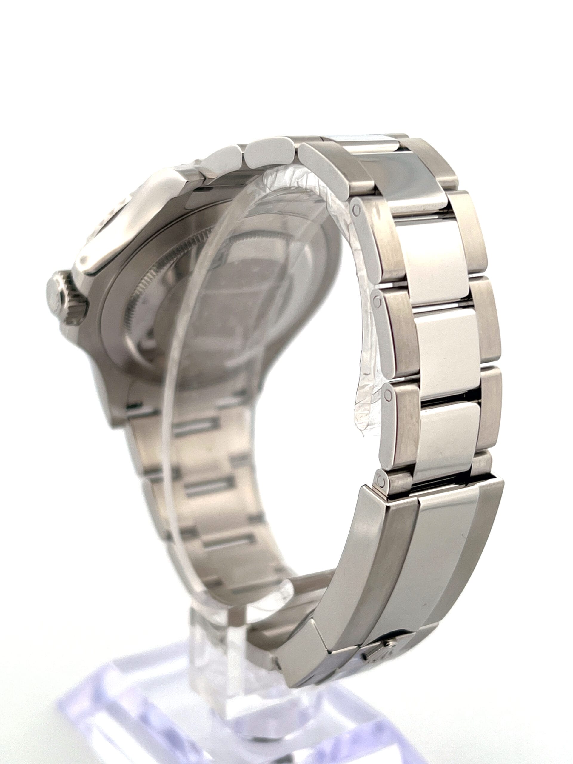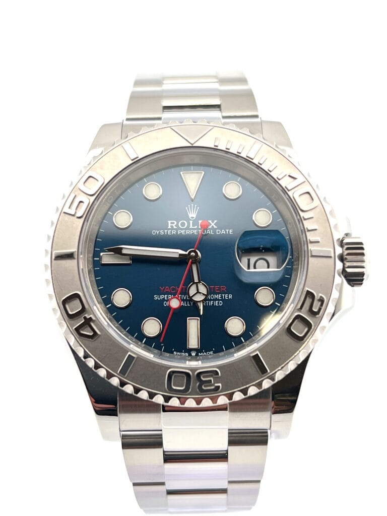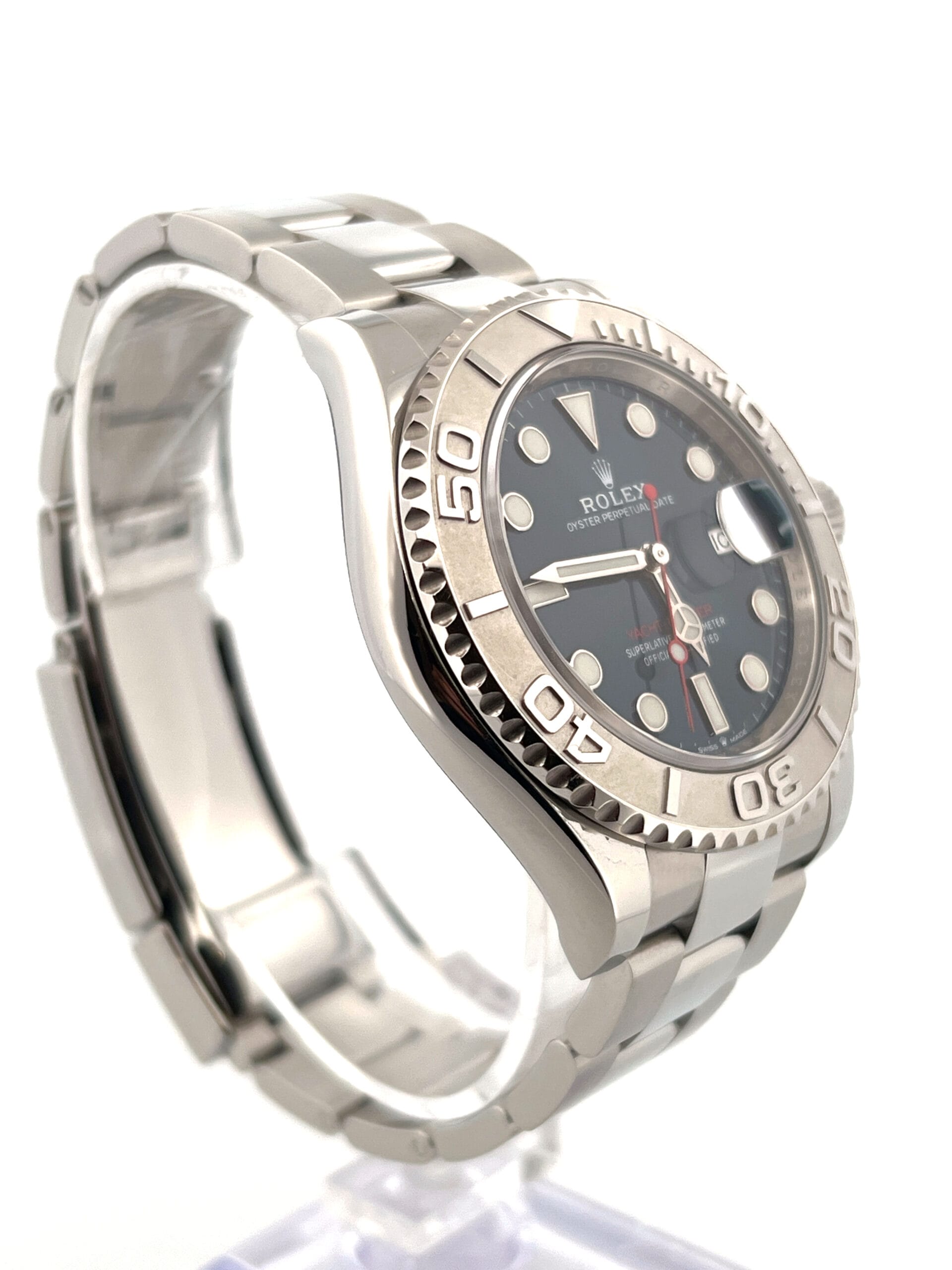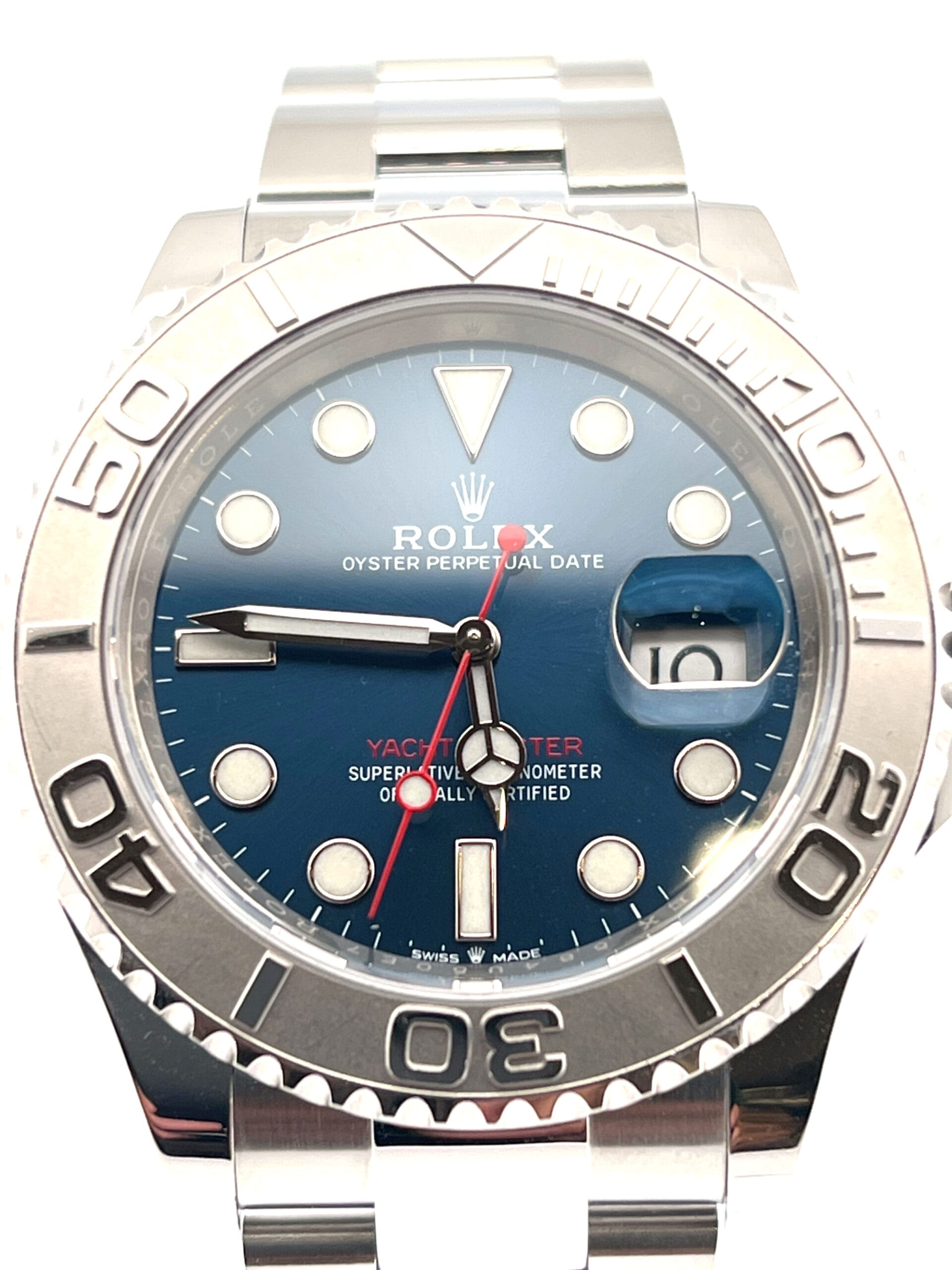 Oystersteel and platinum case with a oystersteel Rolex oyster bracelet. Bi-directional rotating 950 platinum bezel. Blue dial with luminous silver-tone hands and dot hour markers. Minute markers around the outer rim. Dial Type: Analog. Luminescent hands and markers. Date display at the 3 o’clock position. Rolex calibre 3235 automatic movement, based upon Rolex 3035, containing 31 jewels, bitting at 28800 vph, and has a power reserve of approximately 70 hours. Scratch resistant sapphire crystal. Screw down crown. Solid case back. Round case shape. Case size: 40 mm. Oysterlock clasp. Water resistant at 100 meters / 330 feet. Yacht-master 40 Series. Luxury watch style. Watch label: Swiss Made. Rolex Yacht-Master 40 Blue Dial Men’s Watch 126622. Authenticated by local watch maker Come with original steel strap and Rubber B strap