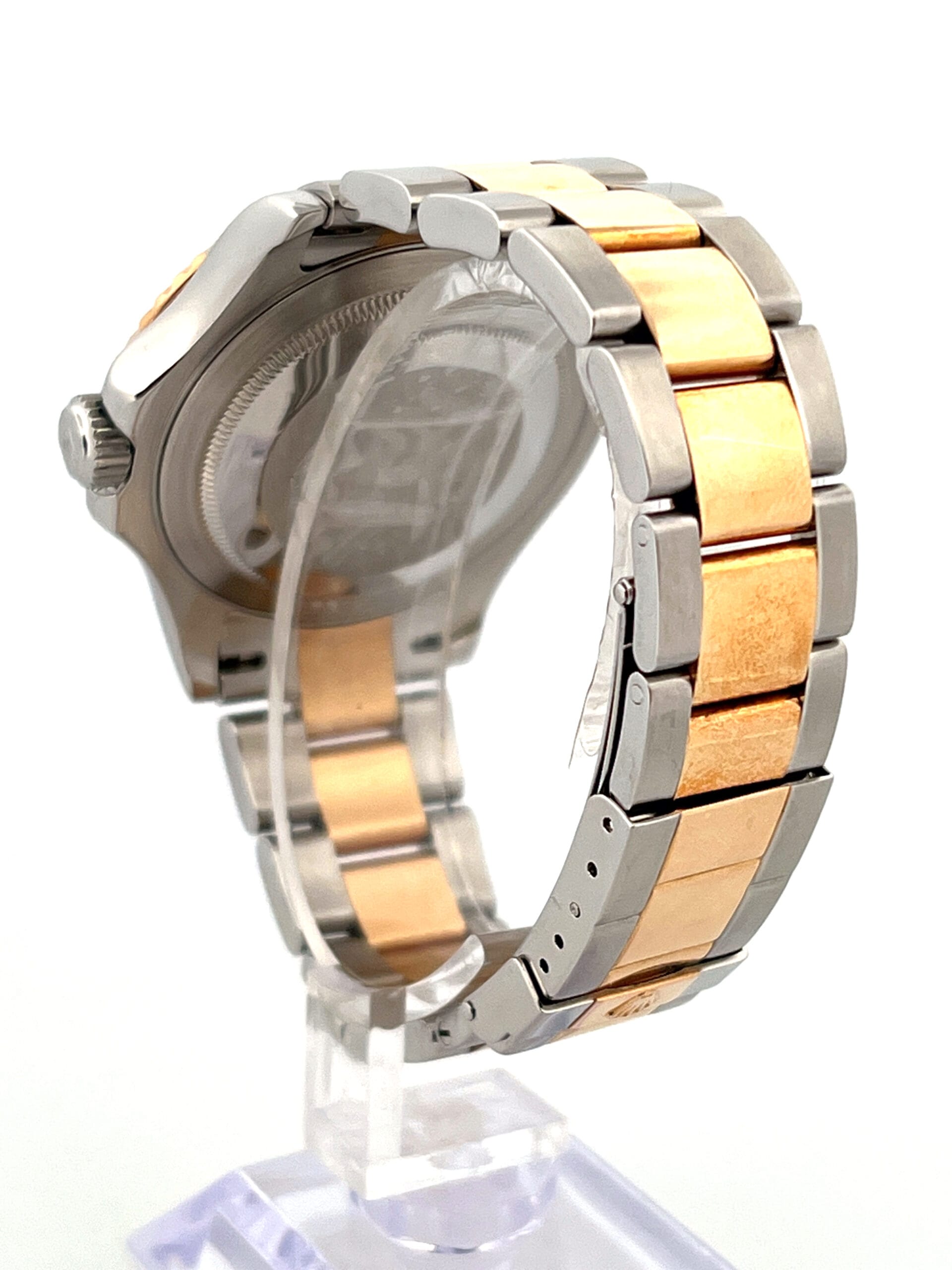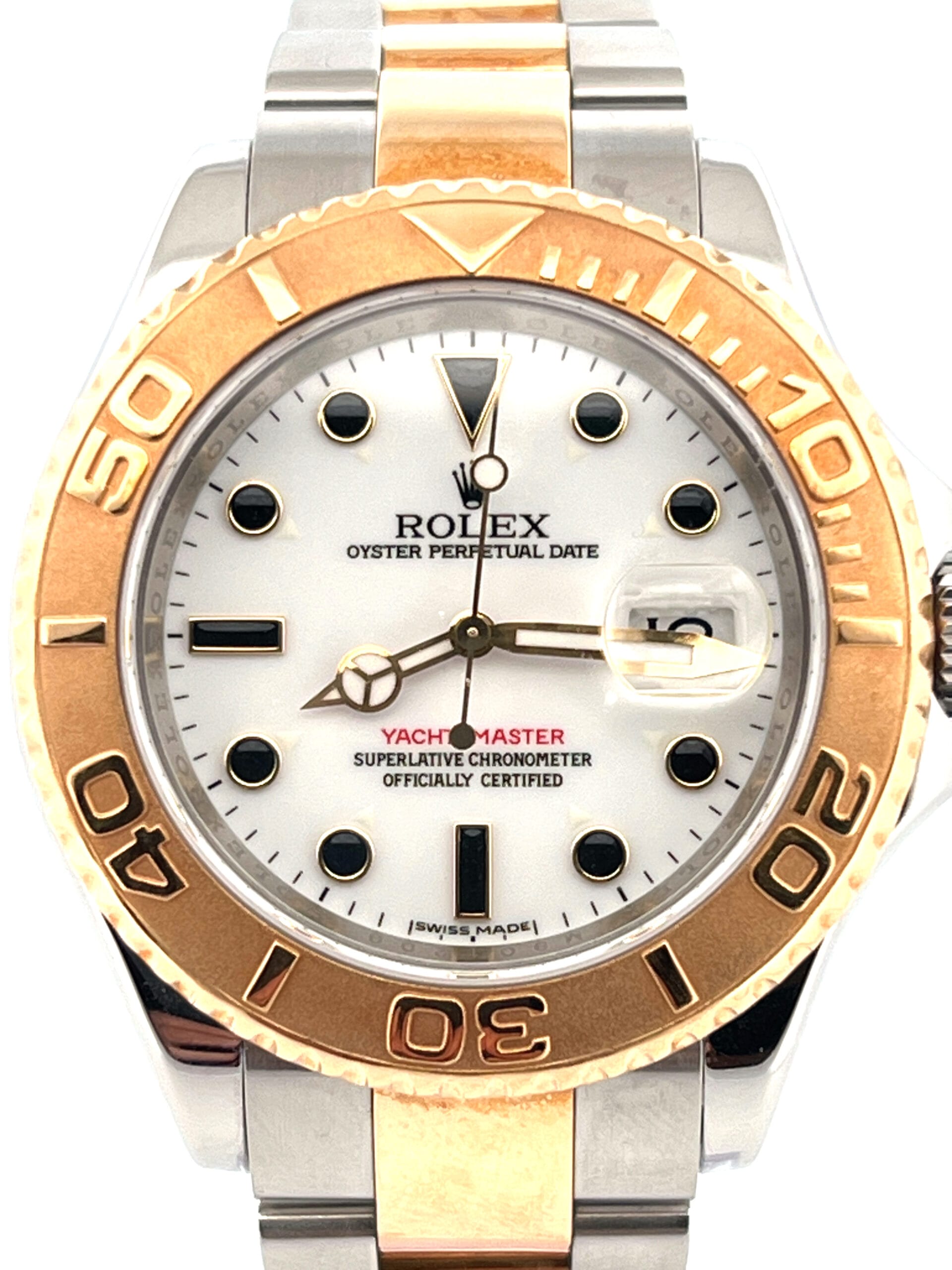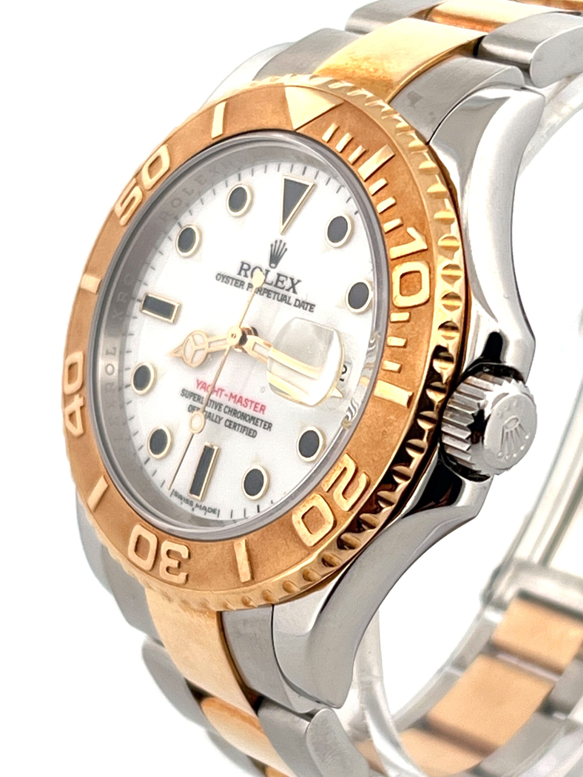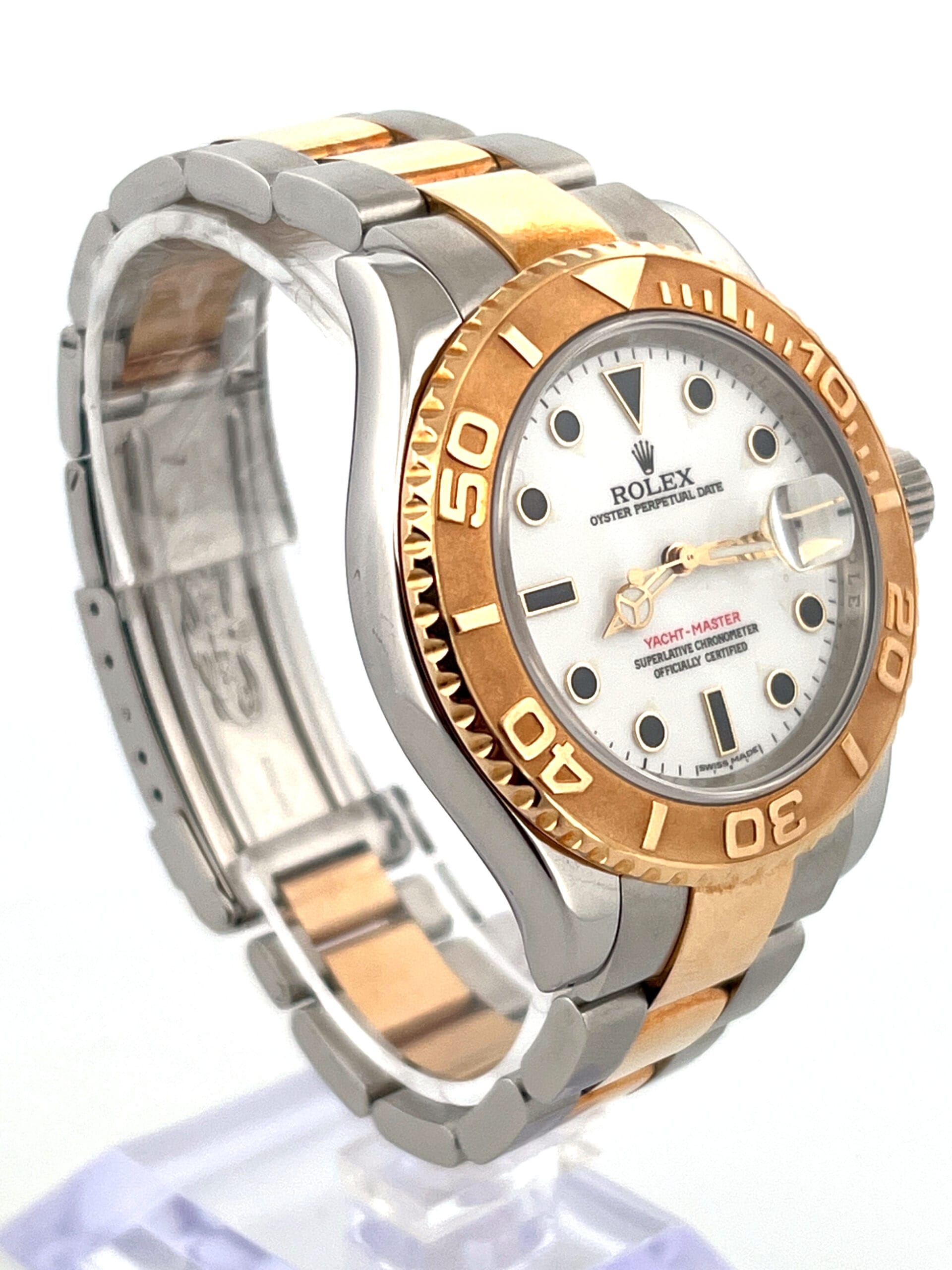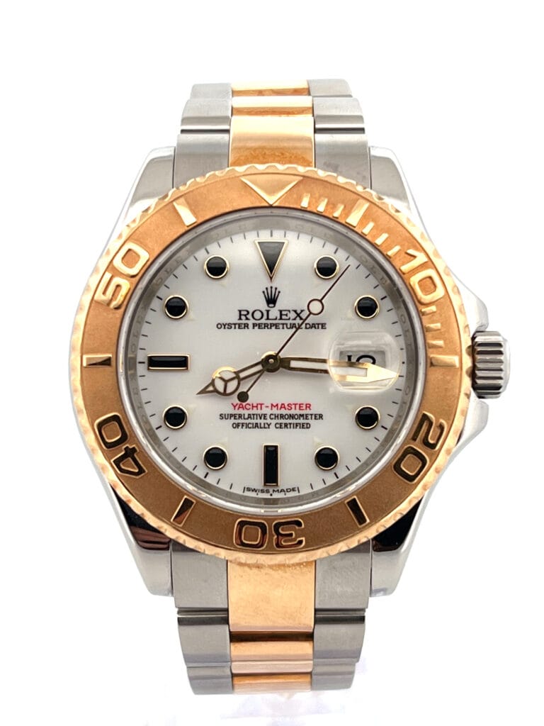 The white-dial Yacht-Master 16623 is one of those references that quietly changes the character of the entire watch. On the wrist, the dial immediately lightens the two-tone Rolesor construction, creating a look that feels clean, balanced, and far less ornamental than its blue or slate counterparts. The polished yellow-gold bezel, with its raised numerals, frames the white dial with purpose, giving the watch clarity and contrast rather than visual weight. It wears confidently without trying to appear rugged or overtly luxurious, which is precisely where its appeal lies.