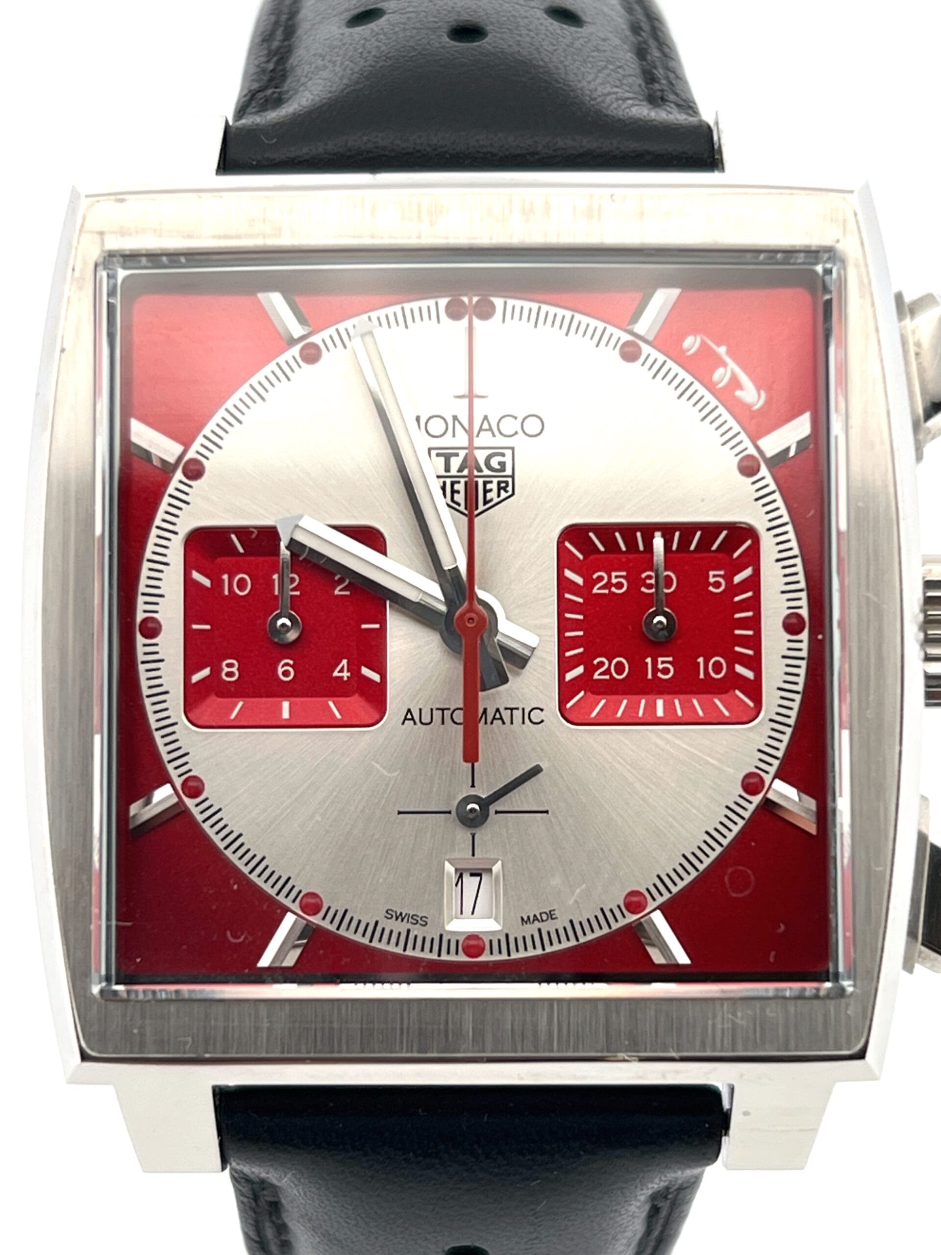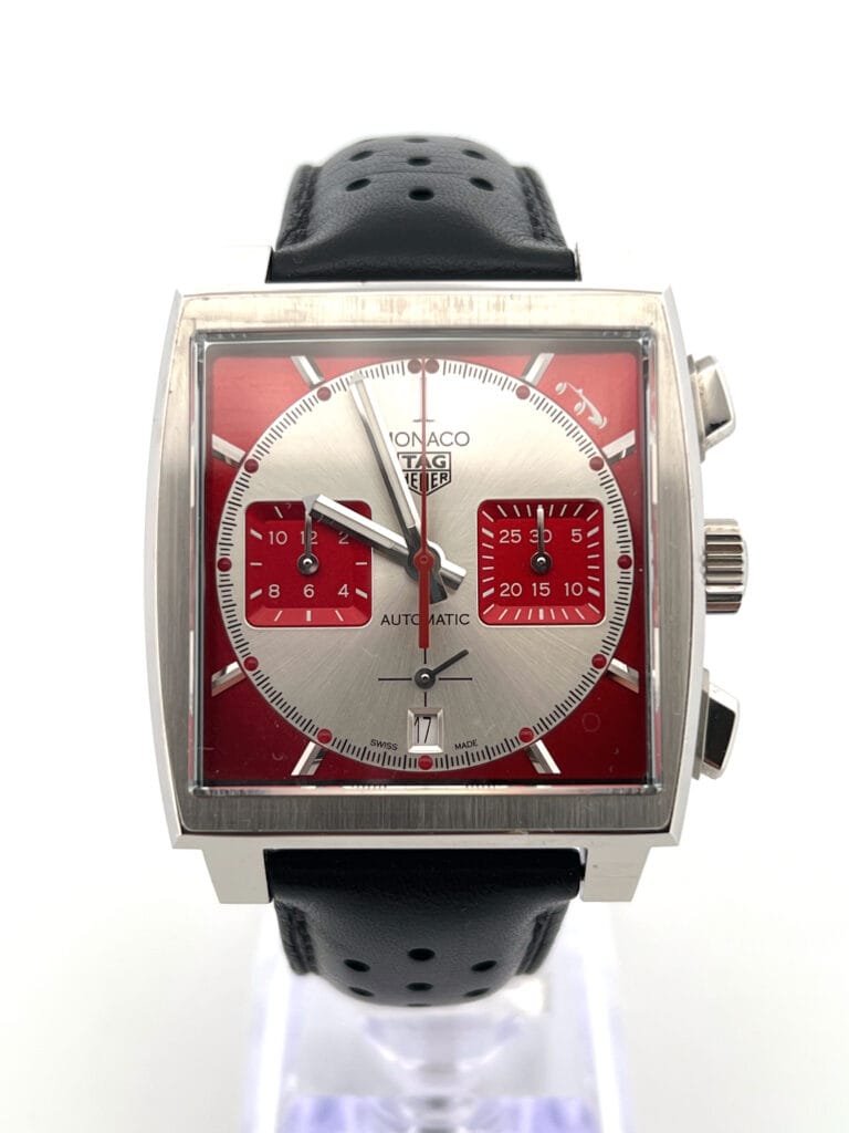 Encased in a 39mm square stainless steel case, the watch features a striking red sunray dial with contrasting silver subdials, evoking the vibrant energy of classic racing. The dial is adorned with rhodium-plated indexes and hands, ensuring legibility and elegance. A date window is positioned at 6 o’clock, maintaining the watch’s symmetrical design.
