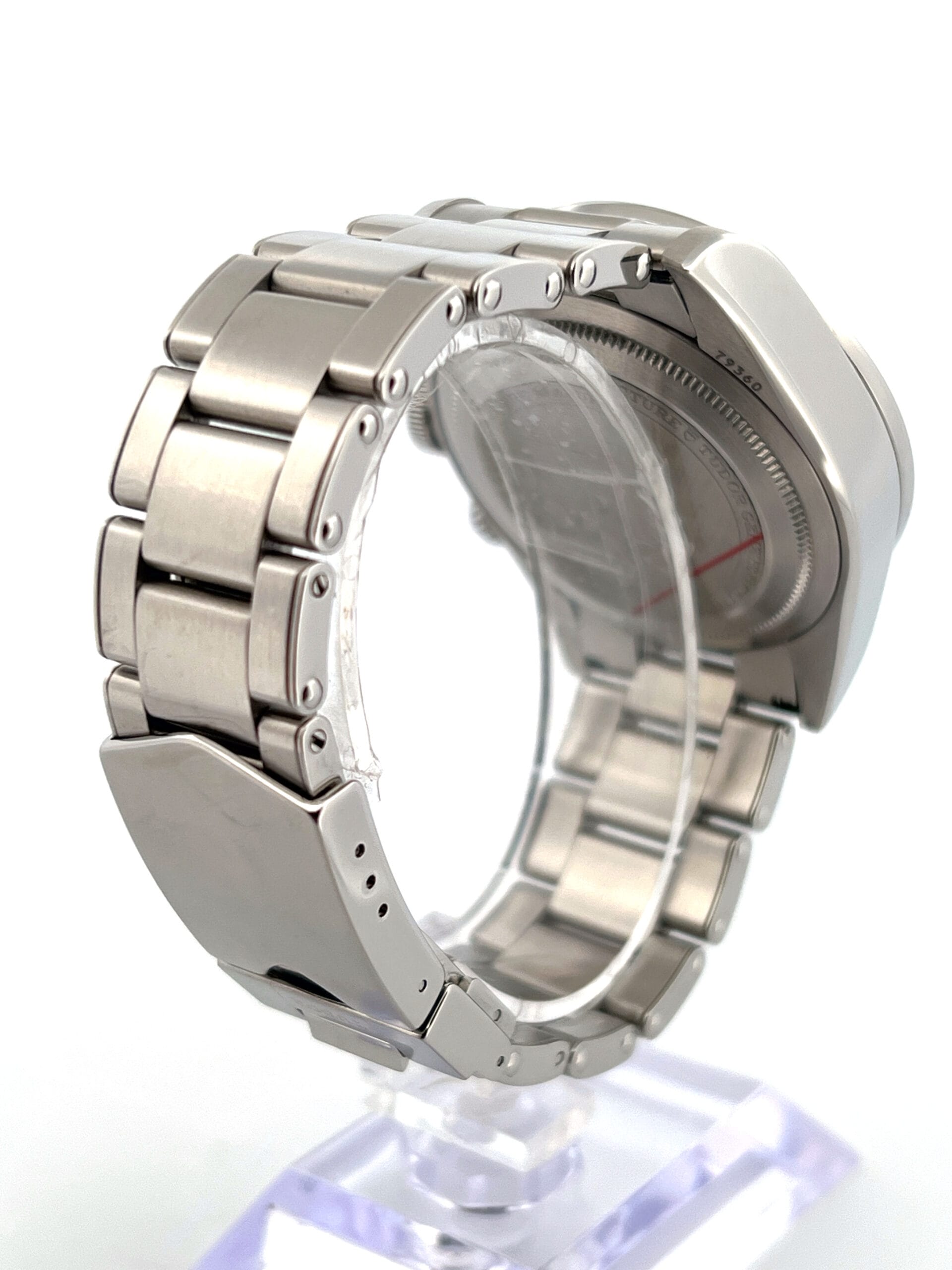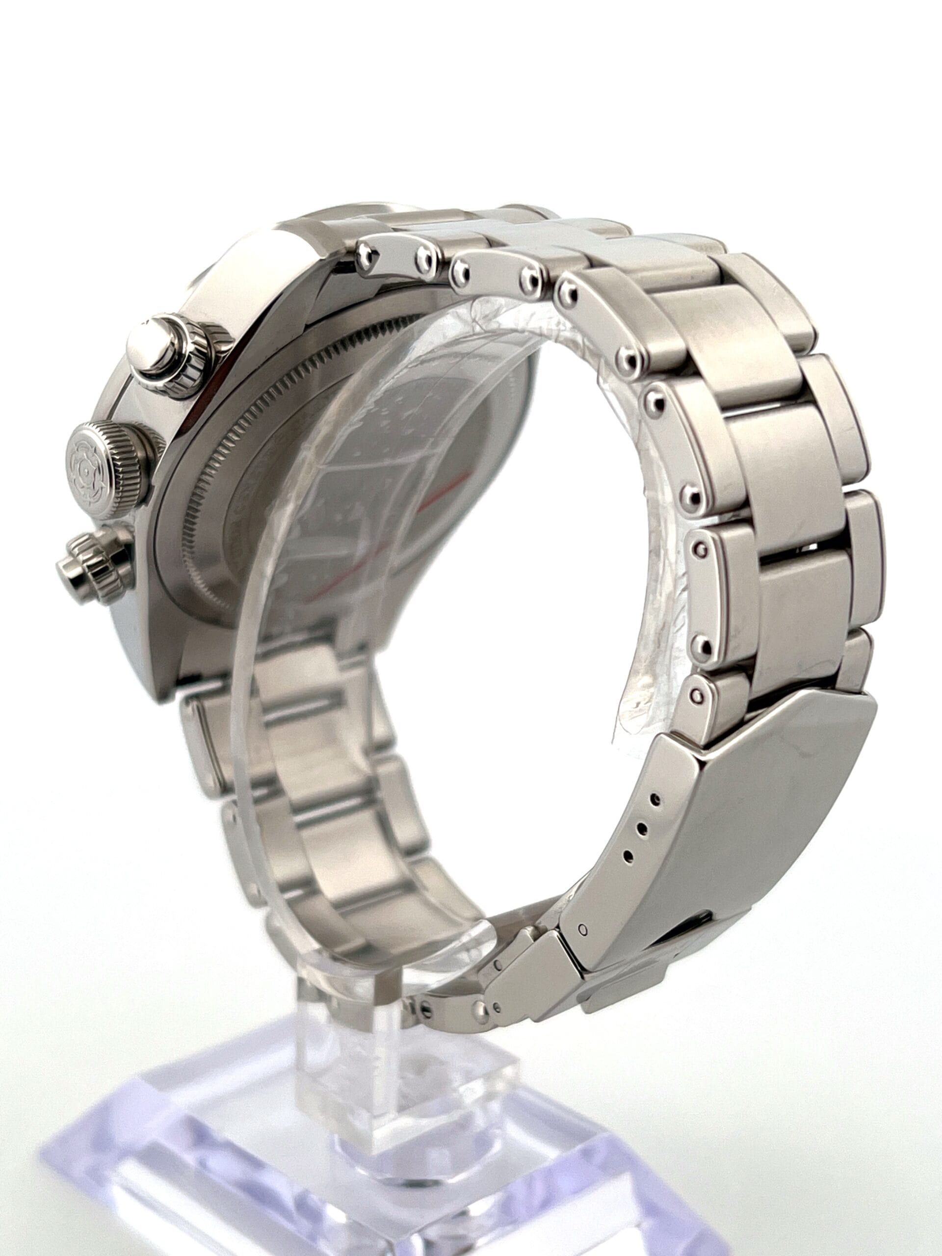 Its standout feature is the “Panda” dial: a crisp white opaline surface with bold black subdials that echo classic vintage chronographs. The signature snowflake hands, domed sapphire crystal, and a fixed tachymeter bezel reinforce both clarity and visual character.