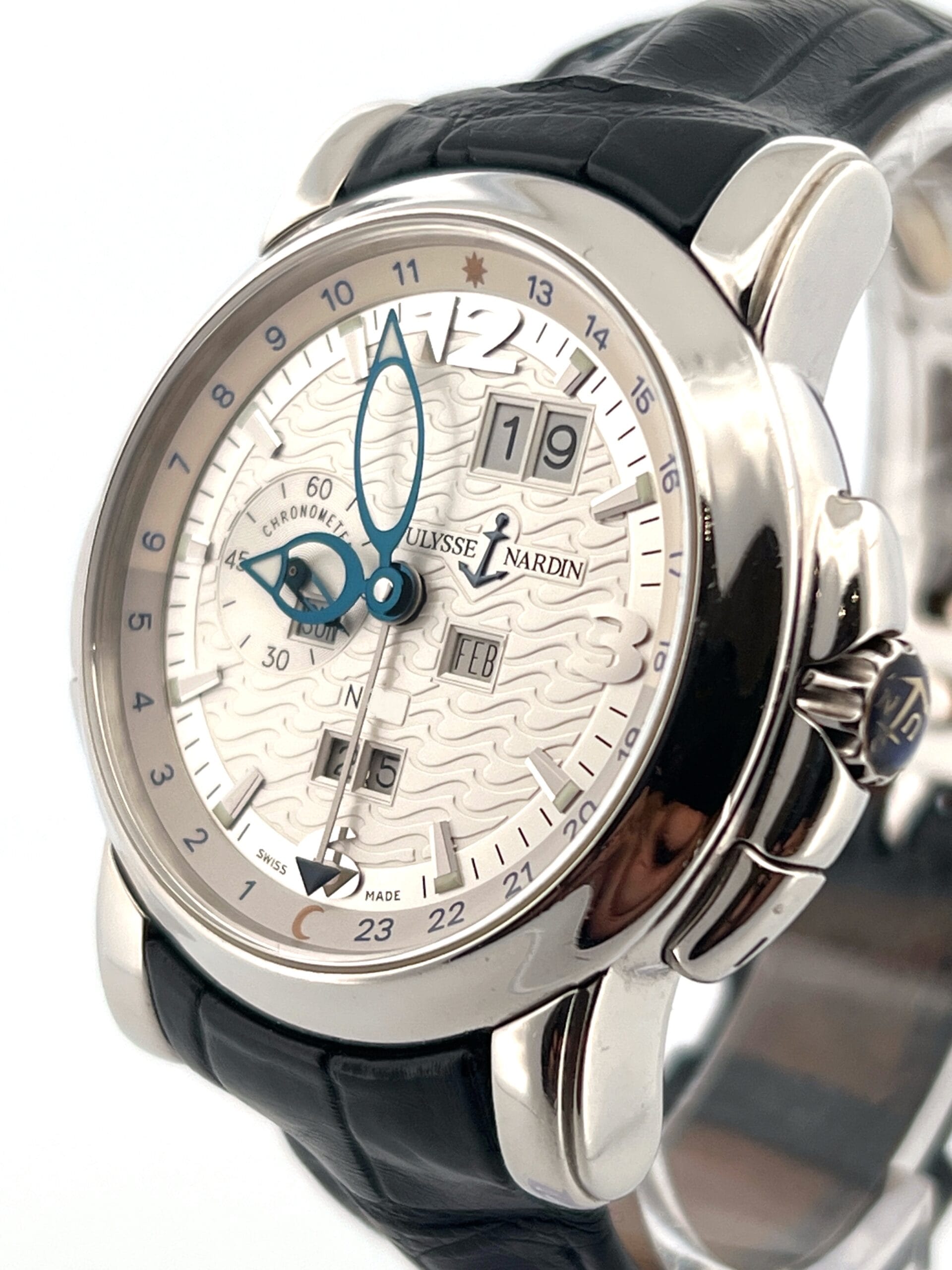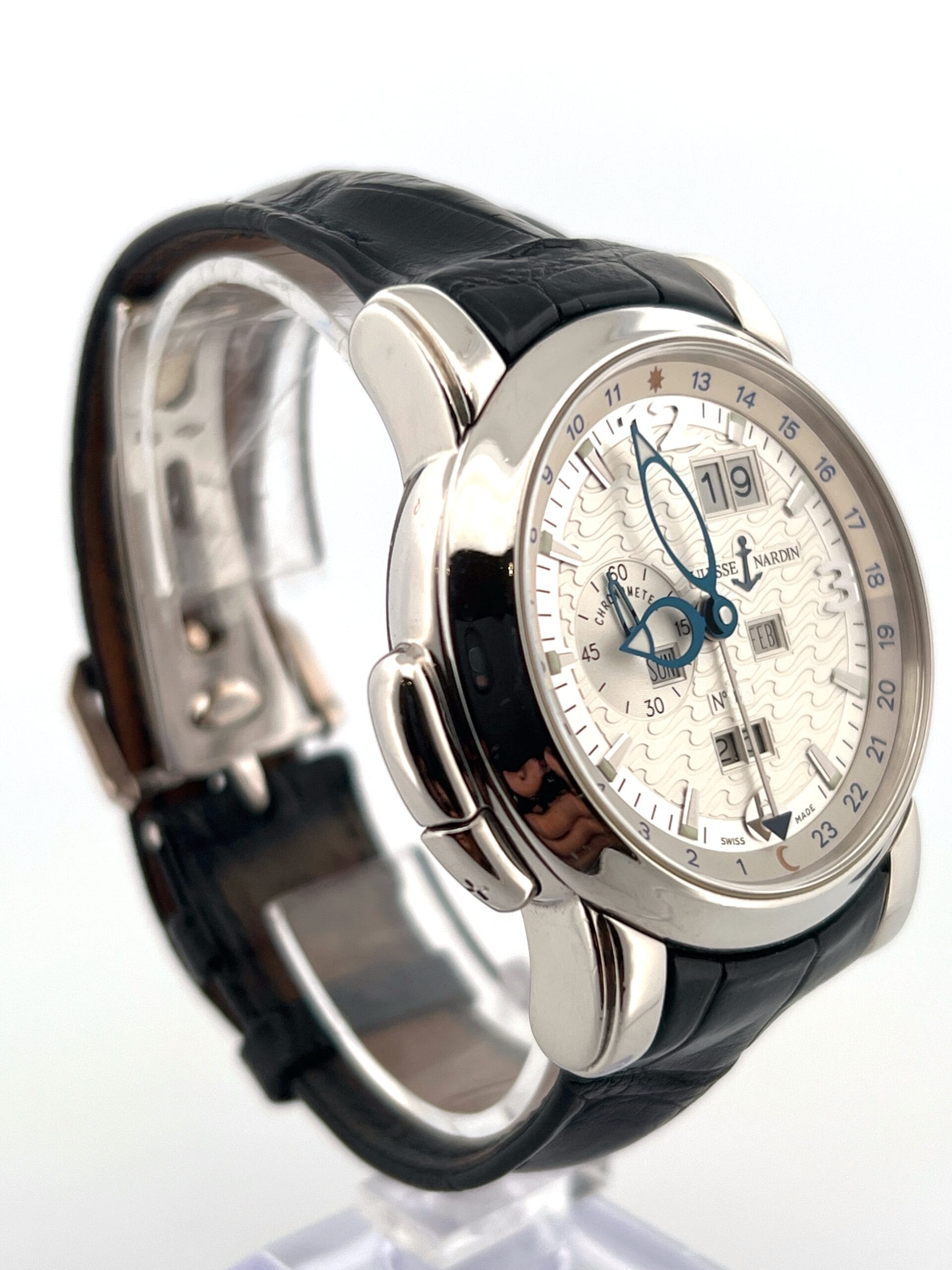 Its silver guilloché dial features bold white-gold Arabic numerals at the quarters, luminous markers, skeletonized blued-steel hands, and an arrow-tipped GMT hand pointing to the 24-hour scale. The perpetual calendar displays the day, date, month, and a two-digit year/leap-year window, laid out for easy reading. Notably, the + / – pushers at 4 and 8 o’clock allow the local hour to jump forward or backward in one-hour increments — a hallmark of Ulysse Nardin’s travel-friendly engineering.