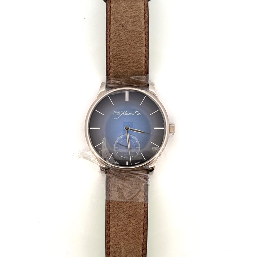 H. Moser & Cie’s ability to create such stunning fumé dials retains an air of mystery. While the technique isn’t drastically different from traditional fumé dials – involving delicately faded paint that reacts to temperature and drying times on subtly brushed dial plates – Moser takes this age-old craft to a higher level of modern artistry. Remarkably, even under close examination with a loupe, the dial’s enchantment remains intact. It reveals some fine speckling akin to metallic paint and showcases a radial brushed pattern, yet the dial’s allure and magic persist, even at 10x magnification.